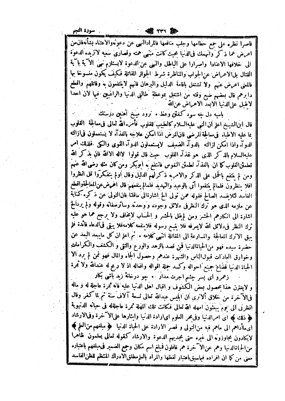 قال ابن الشيخ اعلم ان النبي عليه السلام كالطبيب للقلوب فأمره الله تعالى في معالجة القلوب بما عليه الأطباء في معالجة المرضى فان المرض إذا أمكن علاجه بالغذاء لا يستعملون في إزالته الدواء وإذا أمكن إزالته بالدواء الضعيف لا يستعملون الدواء القوى والكي فلذلك امر عليه السلام بالذكر الذي هو غذآء القلوب حيث قال قولوا لا اله الا الله فان بذكر الله تطمئن القلوب كما ان بالغذاء تطمئن النفوس فانتفع به ابو بكر ومن كان مثله رضى الله عنهم ومن لم ينتفع بالحمل على الذكر والأمر به ذكر لهم الدليل وقال او لم يتفكروا قل انظروا أفلا ينظرون فلما لم ينتفعوا أتى بالوعيد والتهديد فلما لم ينفعهم قال اعرض عن المعالجة واقطع الفاسد لئلا يفسد الصالح فقوله عمن تولى إلخ اشارة الى ما قلنا فان التولي عن ذكره كناية عن ملزمه الذي هو ترك النظر في دلائل وجوده ووحدته وسائر صفاته وقوله ولم يرد إلخ اشارة الى انكارهم الحشر ومن لم يقل بالحشر والحساب لا يخاف ولا يرجع عما هو عليه ترك النظر في دلائل الله لا يعرفه فلا يتبع رسوله فلا ينفعه كلامه فلا يبقى في الدعاء فائدة فلم يبق إلا ترك المعالجة والمسارعة الى المقاتلة انتهى كلامه ثم اعلم ان كل ما يبعد البعد عن حضرة سيده فهو من الحياة الدنيا فمن قصد بالزهد والورع والتقى والكشف والكرامات وخوارق العادات قبول الناس والشهرة عندهم وحصول الجاه والمال فهو ممن لم يرد الا الحياة الدنيا فضاع جميع أحواله وكسد جملة أقواله وأفعاله إذ لا ربح له عند الله ولا ثمرة