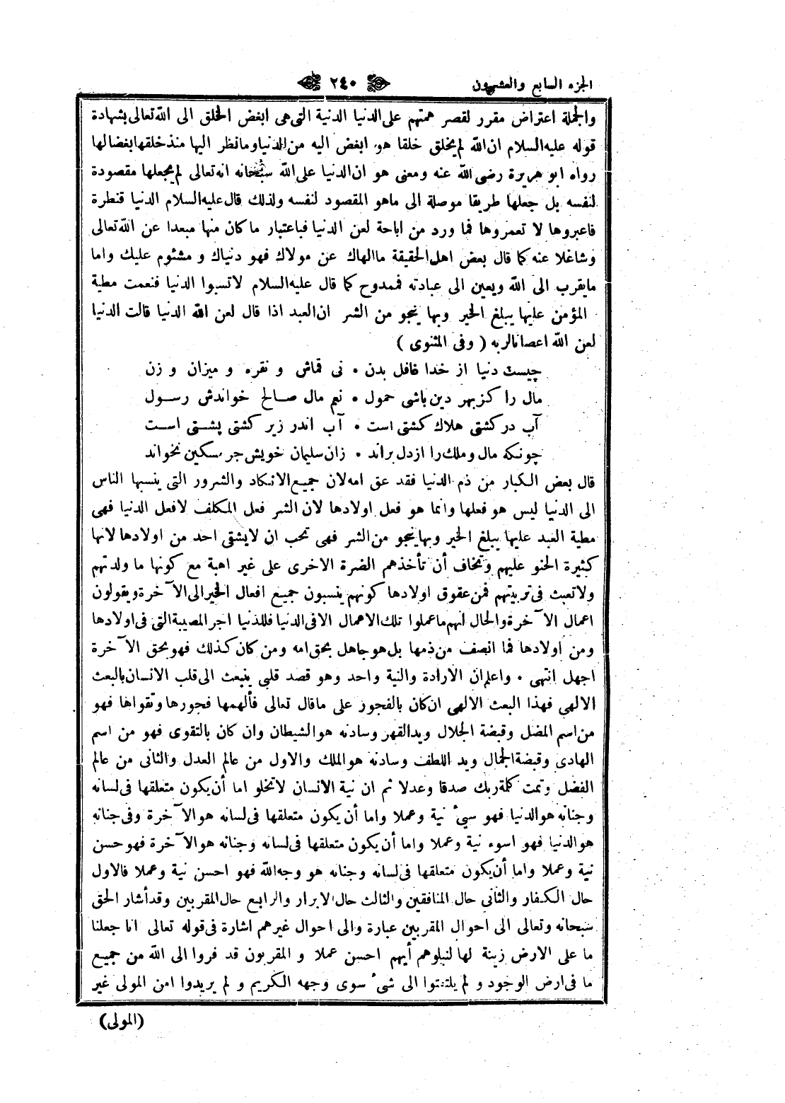 قال بعض الكبار من ذم الدنيا فقد عق امه لان جميع الانكاد والشرور التي ينسبها الناس الى الدنيا ليس هو فعلها وانما هو فعل أولادها لان الشر فعل المكلف لا فعل الدنيا فهى مطية العبد عليها يبلغ الخير وبها ينجو من الشر فهى تحب ان لا يشقى أحد من أولادها لانها كثيرة الحنو عليهم وتخاف أن تأخذهم الضرة الاخرى على غير اهبة مع كونها ما ولدتهم ولا تعبث في تربيتهم فمن عقوق أولادها كونهم ينسبون جميع افعال الخير الى الآخرة ويقولون اعمال الآخرة والحال انهم ما عملوا تلك الأعمال الا في الدنيا فللدنيا اجر المصيبة التي في أولادها ومن أولادها فما أنصف من ذمها بل هو جاهل بحق امه ومن كان كذلك فهو بحق الآخرة أجهل انتهى واعلم ان الارادة والنية واحد وهو قصد قلبى ينبعث الى قلب الإنسان بالبعث الإلهي فهذا البعث الإلهي ان كان بالفجور على ما قال تعالى فألهمها فجورها وتقواها فهو من اسم المضل وقبضة الجلال ويد القهر وسادنه هو الشيطان وان كان بالتقوى فهو من اسم الهادي وققبضة الجمال ويد اللطف وسادنه هو الملك والاول من عالم العدل والثاني من عالم الفضل وتمت كلمة ربك صدقا وعدلا ثم ان نية الإنسان لا تخلو اما أن يكون متعلقها في لسانه وجنانه هو الدنيا فهو سيئ نية وعملا واما أن يكون متعلقها في لسانه هو الآخرة وفي جنانه هو الدنيا فهو أسوأ نية وعملا واما أن يكون متعلقها في لسانه وجنانه هو الآخرة فهو حسن نية وعملا واما أن يكون متعلقها في لسانه وجنانه هو وجه الله فهو احسن نية وعملا فالاول حال الكفار والثاني حال المنافقين والثالث حال الأبرار والرابع حال المقربين وقد أشار الحق سبحانه وتعالى الى احوال المقربين عبارة والى احوال غيرهم اشارة في قوله تعالى انا جعلنا ما على الأرض زينة لها لنبلوهم أيهم احسن عملا والمقربون قد فروا الى الله من جميع ما في ارض الوجود ولم يلتفتوا الى شيء سوى وجهه الكريم ولم يريدوا أمن المولى غير