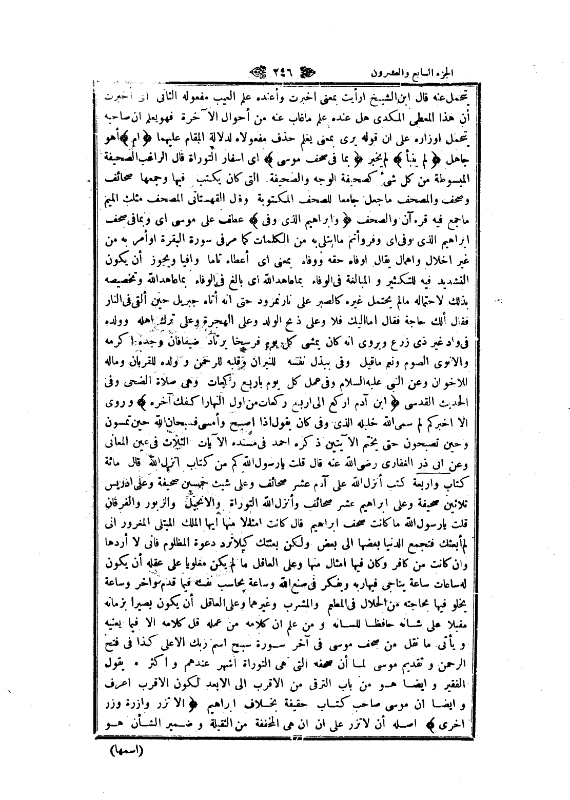 يتحمل عنه قال ابن الشيخ أرأيت بمعنى أخبرت وأ عنده علم العيب مفعوله الثاني اى أخبرت أن هذا المعطى المكدى هل عنده علم ما غاب عنه من أحوال الآخرة فهو يعلم ان صاحبه يتحمل أوزاره على ان قوله يرى بمعنى يعلم حذف مفعولاه لدلالة المقام عليهما أَمْ أهو جاهل لَمْ يُنَبَّأْ لم يخبر بِما فِي صُحُفِ مُوسى اى اسفار التوراة قال الراغب الصحيفة المبسوطة من كل شيء كصحيفة الوجه والصحيفة التي كان يكتب فيها وجمعها صحائف وصحف والمصحف ما جعل جامعا للصحف المكتوبة وقال القهستاني المصحف مثلث الميم ما جمع فيه قرآن والصحف وَإِبْراهِيمَ الَّذِي وَفَّى عطف على موسى اى وبما في صحف ابراهيم الذي وفي اى وفروأتم ما ابتلى به من الكلمات كما مر في سورة البقرة او أمر به من غير إخلال وإهمال يقال أوفاه حقه ووفاه بمعنى اى أعطاه تاما وافيا ويجوز أن يكون التشديد فيه للتكثير والمبالغة في الوفاء بما عاهد الله اى بالغ في الوفاء بما عاهد الله وتخصيصه بذلك لاحتماله ما لم يحتمل غيره كالصبر على نار نمرود حتى انه أتاه جبريل حين ألقى في النار فقال ألك حاجة فقال اما إليك فلا وعلى ذبح الولد وعلى الهجرة وعلى ترك اهله وولده فى واد غير ذى زرع ويروى انه كان يمشى كل يوم فرسخا يرتاد ضيفافان وجده أكرمه وإلا نوى الصوم ونعم ما قيل وفي ببذل نفسه للنيران وقلبه للرحمن وولده للقربان وماله للاخوان وعن النبي عليه السلام وفي عمل كل يوم بأربع ركعات وهى صلاة الضحى وفي الحديث القدسي ابن آدم اركع الى أربع ركعات من اول النهار كفك آخره وروى الا أخبركم لم سمى الله خليله الذي وفي كان يقول إذا أصبح وأمسى فسبحان الله حين تمسون وحين تصبحون حتى يختم الآيتين ذكره احمد في مسنده الآيات الثلاث في عين المعاني وعن ابى ذر الغفاري رضى الله عنه قال قلت يا رسول الله كم من كتاب انزل الله قال مائة كتاب واربعة كتب أنزل الله على آدم عشر صحائف وعلى شيث خمسين صحيفة وعلى إدريس ثلاثين صحيفة وعلى ابراهيم عشر صحائف وأنزل الله التوراة والإنجيل والزبور والفرقان قلت يا رسول الله ما كانت صحف ابراهيم قال كانت أمثالا منها ايها الملك المبتلى المغرور انى لم أبعثك فتجمع الدنيا بعضها الى بعض ولكن بعثتك كيلا ترد دعوة المظلوم فانى لا أردها وان كانت من كافر وكان فيها أمثال منها وعلى العاقل ما لم يكن مغلوبا على عقله أن يكون له ساعات ساعة يناجى فيها ربه ويفكر في صنع الله وساعة يحاسب نفسه فيما قدم واخر وساعة يخلو فيها بحاجته من الحلال في المطعم والمشرب وغيرهما وعلى العاقل أن يكون بصيرا بزمانه مقبلا على شانه حافظا للسانه ومن علم ان كلامه من عمله قل كلامه الا فيما يعنيه ويأتى ما نقل من صحف موسى في آخر سورة سبح اسم ربك الأعلى كذا في فتح الرحمن وتقديم موسى لما أن صحفه التي هى التوراة أشهر عندهم واكثر يقول الفقير وايضا هو من باب الترقي من الأقرب الى الأبعد لكون الأقرب اعرف وايضا ان موسى صاحب كتاب حقيقة بخلاف ابراهيم أَلَّا تَزِرُ وازِرَةٌ وِزْرَ أُخْرى أصله أن لا تزر على ان ان هى المخففة من الثقيلة وضمير الشأن هو