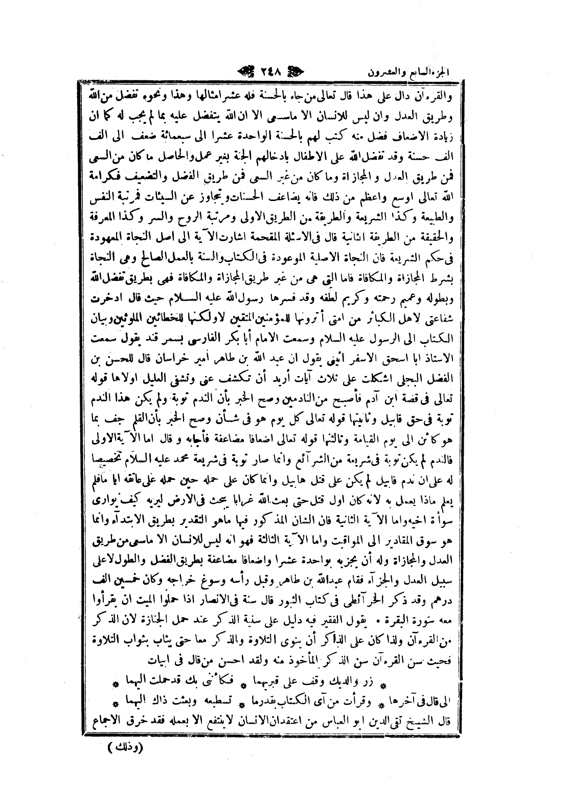 والحقيقة من الطريقة الثانية قال في الاسئلة المقحمة اشارت الآية الى اصل النجاة المعهودة فى حكم الشريعة فان النجاة الاصلية الموعودة في الكتاب والسنة بالعمل الصالح وهى النجاة بشرط المجازاة والمكافاة فاما التي هى من غير طريق المجازاة والمكافاة فهى بطريق تفضل الله وبطوله وعميم رحمته وكريم لطفه وقد فسرها رسول الله عليه السلام حيث قال ادخرت شفاعتى لاهل الكبائر من أمتي أترونها للمؤمنين المتقين لا ولكنها للخطائين الملوثين وبيان الكتاب الى الرسول عليه السلام وسمعت الامام أبا بكر الفارسي بسمرقند يقول سمعت الأستاذ أبا اسحق الأسفراييني يقول ان عبد الله بن طاهر امير خراسان قال للحسن بن الفضل البجلي أشكلت على ثلاث آيات أريد أن تكشف عنى وتشفى العليل أولاها قوله تعالى في قصة ابن آدم فأصبح من النادمين وصح الخبر بأن الندم توبة ولم يكن هذا الندم توبة في حق قابيل وثانيتها قوله تعالى كل يوم هو في شأن وصح الخبر بأن القلم جف بما هو كائن الى يوم القيامة وثالثتها قوله تعالى أضعافا مضاعفة فأجابه وقال اما الآية الاولى فالندم لم يكن توبة في شريعة من الشرائع وانما صار توبة في شريعة محمد عليه السلام تخصيصا له على ان ندم قابيل لم يكن على قتل هابيل وانما كان على حمله حين حمله على عاتقه أياما فلم يعلم ماذا يعمل به لانه كان أول قتل حتى بعث الله غرابا يبحث في الأرض ليريه كيف يوارى سوأة أخيه واما الآية الثانية فان الشان المذكور فيها ما هو التقدير بطريق الابتداء وانما هو سوق المقادير الى المواقيت واما الآية الثالثة فهو انه ليس للانسان الا ما سعى من طريق العدل والمجازاة وله أن يجزيه بواحدة عشرا وأضعافا مضاعفة بطريق الفضل والطول لا على سبيل العدل والجزاء فقام عبد الله بن طاهر وقبل رأسه وسوغ خراجه وكان خمسين الف درهم وقد ذكر الخرائطي في كتاب الثبور قال سنة في الأنصار إذا حملوا الميت ان يقرأوا معه سورة البقرة يقول الفقير فيه دليل على سنية الذكر عند حمل الجنازة لان الذكر من القرآن ولذا كان على الذاكر أن ينوى التلاوة والذكر معا حتى يثاب بثواب التلاوة فحيث سن القرآن سن الذكر المأخوذ منه ولقد احسن من قال في أبيات
