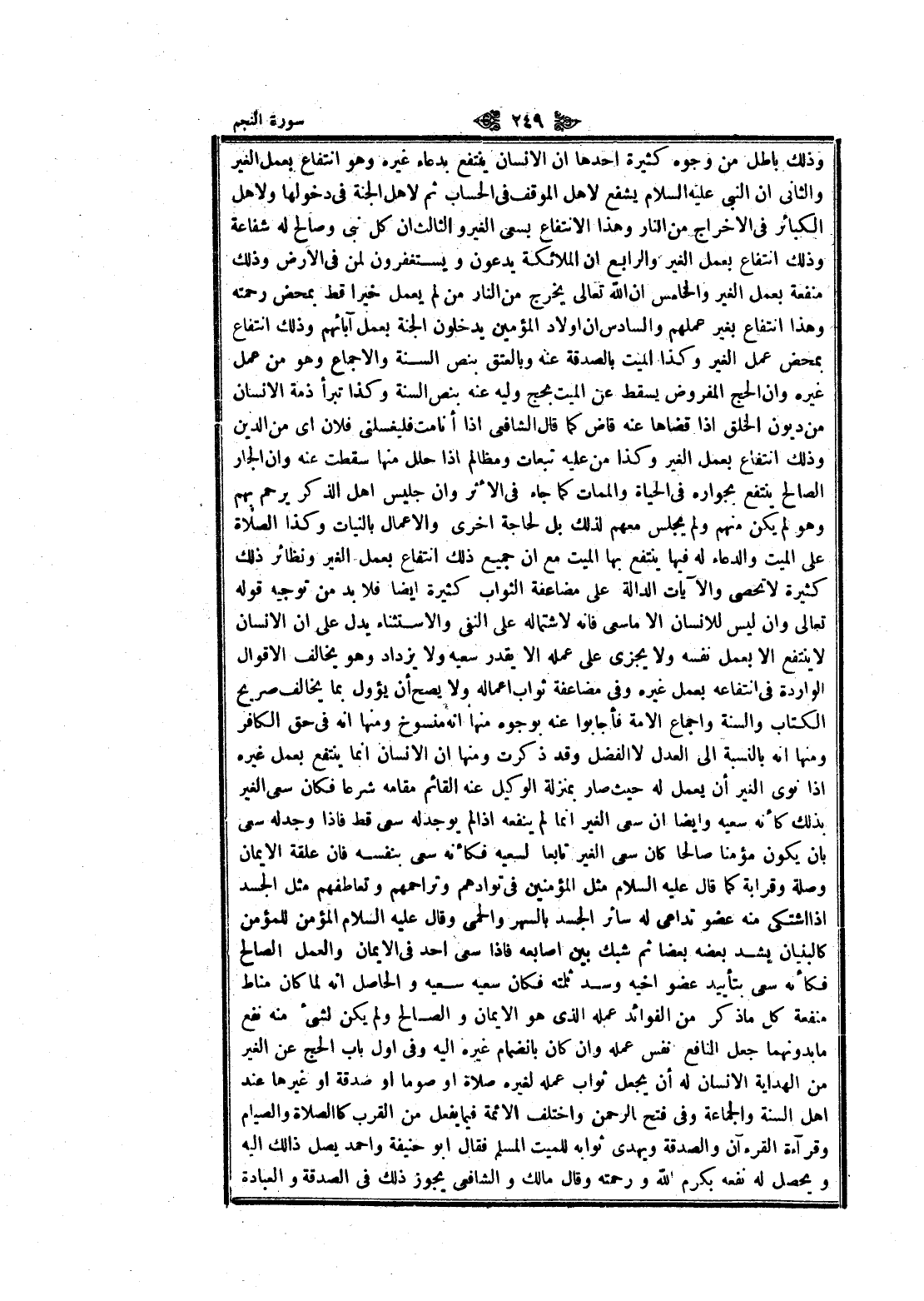 وذلك باطل من وجوه كثيرة أحدها ان الإنسان ينتفع بدعاء غيره وهو انتفاع بعمل الغير والثاني ان النبي عليه السلام يشفع لاهل الموقف في الحساب تم لاهل الجنة في دخولها ولاهل الكبائر في الإخراج من النار وهذا الانتفاع بسعى الغير والثالث ان كل نبى وصالح له شفاعة وذلك انتفاع بعمل الغير والرابع ان الملائكة يدعون ويستغفرون لمن في الأرض وذلك منفعة بعمل الغير والخامس ان الله تعالى يخرج من النار من لم يعمل خيرا قط بمحض رحمته وهذا انتفاع بغير عملهم والسادس ان أولاد المؤمنين يدخلون الجنة بعمل آبائهم وذلك انتفاع بمحض عمل الغير وكذا الميت بالصدقة عنه وبالعتق بنص السنة والإجماع وهو من عمل غيره وان الحج المفروض يسقط عن الميت بحج وليه عنه بنص السنة وكذا تبرأ ذمة الإنسان من ديون الخلق إذا قضاها عنه قاض كما قال الشافعي إذا أنامت فليغسلنى فلان اى من الدين وذلك انتفاع بعمل الغير وكذا من عليه تبعات ومظالم إذا حلل منها سقطت عنه وان الجار الصالح ينتفع بجواره في الحياة والممات كما جاء في الأثر وان جليس اهل الذكر يرحم بهم وهو لم يكن منهم ولم يجلس معهم لذلك بل لحاجة اخرى والأعمال بالنيات وكذا الصلاة على الميت والدعاء له فيها ينتفع بها الميت مع ان جميع ذلك انتفاع بعمل الغير ونظائر ذلك كثيرة لا تحصى والآيات الدالة على مضاعفة الثواب كثيرة ايضا فلا بد من توجيه قوله تعالى وان ليس للانسان الا ما سعى فانه لاشتماله على النفي والاستثناء يدل على ان الإنسان لا ينتفع الا بعمل نفسه ولا يجزى على عمله الا يقدر سعيه ولا يزداد وهو يخالف الأقوال الواردة في انتفاعه بعمل غيره وفي مضاعفة ثواب اعماله ولا يصح أن يؤول بما يخالف صريح الكتاب والسنة واجماع الامة فأجابوا عنه بوجوه منها انه منسوخ ومنها انه في حق الكافر ومنها انه بالنسبة الى العدل لا الفضل وقد ذكرت ومنها ان الإنسان انما ينتفع بعمل غيره إذا نوى الغير أن يعمل له حيث صار بمنزلة الوكيل عنه القائم مقامه شرعا فكان سعى الغير بذلك كأنه سعيه وايضا ان سعى الغير انما لم ينفعه إذا لم يوجد له سعى قط فاذا وجد له سعى بان يكون مؤمنا صالحا كان سعى الغير تابعا لسعيه فكأنه سعى بنفسه فان علقة الايمان وصلة وقرابة كما قال عليه السلام مثل المؤمنين في توادهم وتراحمهم وتعاطفهم مثل الجسد إذا اشتكى منه عضو تداعى له سائر الجسد بالسهر والحمى وقال عليه السلام المؤمن للمؤمن كالبنيان يشد بعضه بعضا ثم شبك بين أصابعه فاذا سعى أحد في الايمان والعمل الصالح فكأنه سعى بتأييد عضو أخيه وسد ثلمته فكان سعيه سعيه والحاصل انه لما كان مناط منفعة كل ما ذكر من الفوائد عمله الذي هو الايمان والصالح ولم يكن لشيء منه نفع ما بدونهما جعل النافع نفس عمله وان كان بانضمام غيره اليه وفي أول باب الحج عن الغير من الهداية الإنسان له أن يجعل ثواب عمله لغيره صلاة او صوما او صدقة او غيرها عند اهل السنة والجماعة وفي فتح الرحمن واختلف الائمة فيما يفعل من القرب كالصلاة والصيام وقراءة القرآن والصدقة ويهدى ثوابه للميت المسلم فقال ابو حنيفة واحمد يصل ذالك اليه ويحصل له نفعه بكرم الله ورحمته وقال مالك والشافعي يجوز ذلك في الصدقة والعبادة