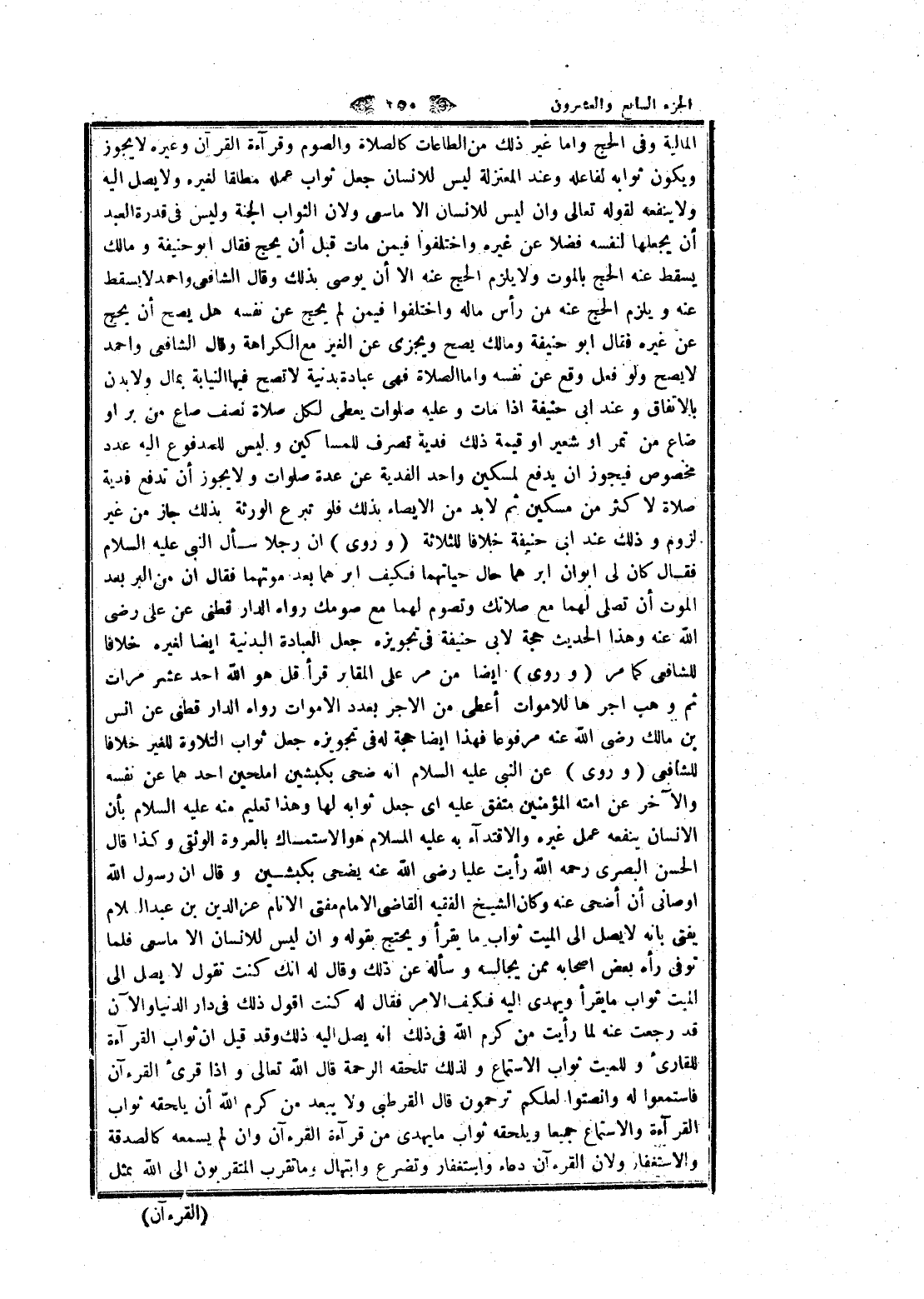 واحمد لا يسقط عنه ويلزم الحج عنه من رأس ماله واختلفوا فيمن لم يحج عن نفسه هل يصح أن يحج عن غيره فقال ابو حنيفة ومالك يصح ويجزى عن الغير مع الكراهة وقال الشافعي واحمد لا يصح ولو فعل وقع عن نفسه واما الصلاة فهى عبادة بدنية لا تصح فيها النيابة بمال ولا بدن بالاتفاق وعند ابى حنيفة إذا مات وعليه صلوات يعطى لكل صلاة نصف صاع من بر او صاع من تمر او شعير او قيمة ذلك فدية تصرف للمساكين وليس للمدفوع اليه عدد مخصوص فيجوز ان يدفع لمسكين واحد الفدية عن عدة صلوات ولا يجوز أن تدفع فدية صلاة لا كثر من مسكين ثم لا بد من الإيصاء بذلك فلو تبرع الورثة بذلك جاز من غير لزوم وذلك عند ابى حنيفة خلافا للثلاثة (وروى) ان رجلا سأل النبي عليه السلام فقال كان لى أبوان أبرهما حال حياتهما فكيف أبرهما بعد موتهما فقال ان من البر بعد الموت أن تصلى لهما مع صلاتك وتصوم لهما مع صومك رواه الدار قطنى عن على رضى الله عنه وهذا الحديث حجة لابى حنيفة في تجويزه جعل العبادة البدنية ايضا لغيره خلافا للشافعى كما مر (وروى) ايضا من مر على المقابر قرأ قل هو الله أحد عشر مرات ثم وهب أجرها للاموات أعطى من الاجر بعدد الأموات رواه الدار قطنى عن انس بن مالك رضى الله عنه مرفوعا فهذا ايضا حجة له في تجويزه جعل ثواب التلاوة للغير خلافا للشافعى (وروى) عن النبي عليه السلام انه ضحى بكبشين أملحين أحدهما عن نفسه والآخر عن أمته المؤمنين متفق عليه اى جعل ثوابه لها وهذا تعليم منه عليه السلام بأن الإنسان ينفعه عمل غيره والاقتداء به عليه السلام هو الاستمساك بالعروة الوثقى وكذا قال الحسن البصري رحمه الله رأيت عليا رضى الله عنه يضحى بكبشين وقال ان رسول الله أوصاني أن أضحى عنه وكان الشيخ الفقيه القاضي الامام مفتى الأنام عز الدين بن عبد السلام يفتى بانه لا يصل الى الميت ثواب ما يقرأ ويحتج بقوله وان ليس للانسان الا ما سعى فلما توفى رأه بعض أصحابه ممن يجالسه وسأله عن ذلك وقال له انك كنت تقول لا يصل الى الميت ثواب ما يقرأ ويهدى اليه فكيف الأمر فقال له كنت أقول ذلك في دار الدنيا والآن قد رجعت عنه لما رأيت من كرم الله في ذلك انه يصل اليه ذلك وقد قيل ان ثواب القراءة للقارئ وللميت ثواب الاستماع ولذلك تلحقه الرحمة قال الله تعالى وإذا قرئ القرآن فاستمعوا له وانصتوا لعلكم ترحمون قال القرطبي ولا يبعد من كرم الله أن يلحقه ثواب القراءة والاستماع جميعا ويلحقه ثواب ما يهدى من قراءة القرآن وان لم يسمعه كالصدقة والاستغفار ولان القرآن دعاء واستغفار وتضرع وابتهال وما تقرب المتقربون الى الله بمثل
