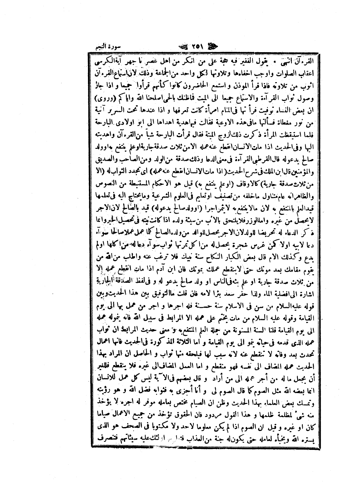 القرآن انتهى يقول الفقير فيه حجة على من أنكر من اهل عصرنا جهر آية الكرسي أعقاب الصلوات وأوجب إخفاءها وتلاوتها لكل واحد من الجماعة وذلك لان استماع القرآن أتوب من تلاوته فاذا قرأ المؤذن واستمع الحاضرون كانوا كأنهم قرأوا جميعا وإذا جاؤ وصول ثواب القراءة والاستماع جميعا الى الميت فماظنك بالحي أصلحنا الله وإياكم (وروى) ان بعض النساء توفيت فرأتها في المنام امرأة كانت تعرفها وإذا عندها تحت السرير آنية من نور مغطاة فسألتها ما في هذه الاوعية فقالت فيها هدية أهداها الى ابو أولادي البارحة فلما استيقظت المرأة ذكرت ذلك لزوج الميتة فقال قرأت البارحة شيئا من القرآن واهديته إليها وفي الحديث إذا مات الإنسان انقطع عنه عمله الا من ثلاث صدقة جارية او علم ينتفع به او ولد صالح يدعو له قال القرطبي القراءة في معنى الدعا وذلك صدقة من الولد ومن الصاحب والصديق والمؤمنين قال ابن الملك في شرح الحديث (إذا مات الإنسان انقطع عنه عمله) اى تجدد الثواب له (الا من ثلاث صدقة جارية) كالاوقاف (او علم ينتفع به) قيل هو الاحكام المستنبطة من النصوص والظاهر انه عام متناول ما خلفه من تصنيف او تعليم في العلوم الشرعية وما يحتاج اليه في تعلمها قيد العلم بالمنتفع به لان مالا ينتفع به لا يثمر اجرا (او ولد صالح يدعو له) قيد بالصالح لان الاجر لا يحصل من