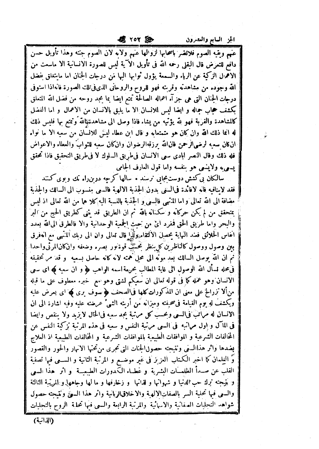 فقد لا ينافيه فانه لا فائدة في السعى بدون الجذبة الالهية فالسعى منسوب الى السالك والجذبة مضافة الى الله تعالى واما المنتهى فالسعى والجذبة بالنسبة اليه كلا هما من الله تعالى إذ ليس بمتحقق من لم يكن حركاته وسكناته بالله ثم ان الطريق قد يثنى كطريق الحج من البر والبحر واما طريق الحق فمفرد اى من حيث الجمعية الوحدانية والا فالطرق الى الله بعدد أنفاس الخلائق فعند النهاية يحصل الالتقاء ولذا قال تعالى وان الى ربك المنتهى مع انه فرق بين وصول ووصول كالناظرين كل ينظر بحسب قوة نور بصره وضعفه وان كان المرئي واحدا ثم ان الله يوصل السالك بعد موته الى محل همته لانه كانه حاصل بسعيه وقد مر تحقيقه فى محله نسأل الله الوصول الى غاية المطالب بحرمة اسمه الواهب وَأَنَّ سَعْيَهُ اى سعى الإنسان وهو عمله كما في قوله تعالى ان سعيكم لشتى وهو مع خبره معطوف على ما قبله من ألا تزر إلخ على معنى ان المذكورات كلها في الصحف سَوْفَ يُرى اى يعرض عليه ويكشف له يوم القيامة في صحيفته وميزانه من أريته الشيء عرضته عليه وفيه اشارة الى ان الإنسان له مراتب في السعى وبحسب كل مرتبة يجد سعيه في الحال لا يزيد ولا ينقص وايضا فى المآل وأول مراتبه في السعى مرتبة النفس وسعيه في هذه المرتبة تزكية النفس عن المخالفات الشرعية والموافقات الطبيعية بالموافقات الشرعية والمخالفات الطبيعية إذ العلاج بضدها واثر هذا السعى ونتيجته حصول الجنات التي تجرى من تحتها الأنهار والحور والقصور والغلمان كما اخبر الكتاب العزيز في غير موضع والمرتبة الثانية والسعى فيها تصفية القلب عن صدأ الظلمات البشرية وغطاء الكدورات الطبيعية واثر هذا السعى ونتيجته ترك حب الدنيا وشهواتها ولذاتها وزخارفها ومالها وجاهها والمرتبة الثالثة والسعى فيها تحلية السر بالصفات الالهية والأخلاق الربانية واثر هذا السعى ونتيجته حصول شواهد التجليات الصفاتية والاسمائية والمرتبة الرابعة والسعى فيها تحلية الروح بالتجليات