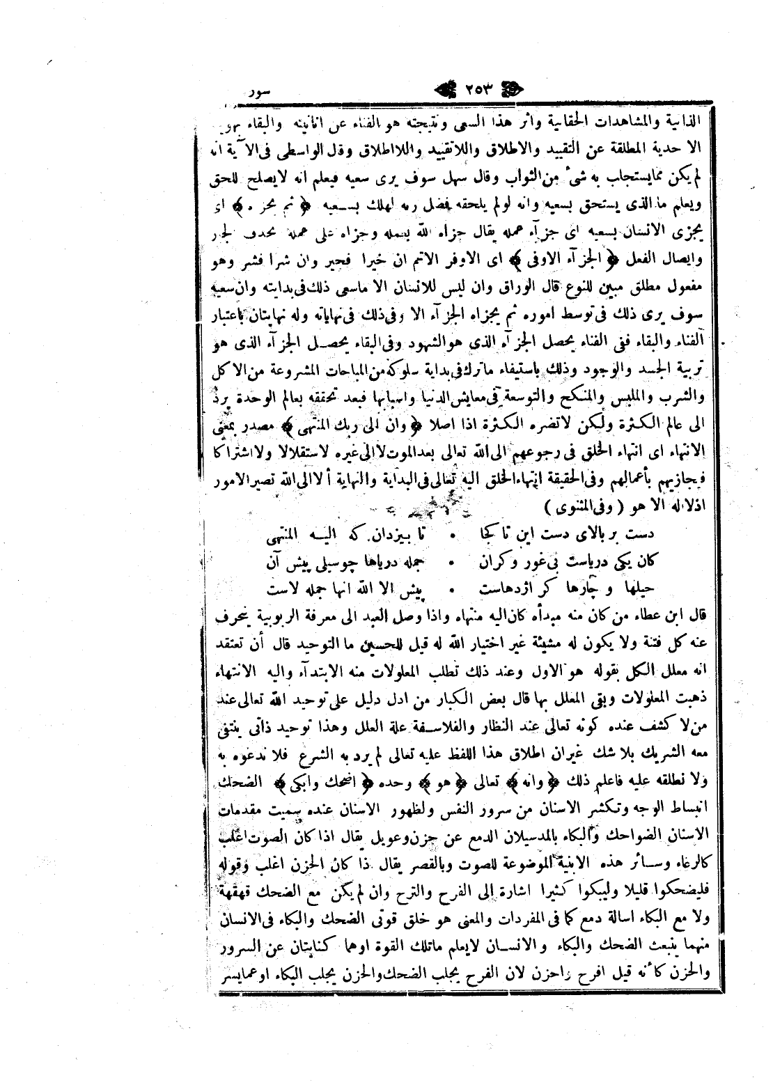 قال ابن عطاء من كان منه مبدأه كان اليه منتهاه وإذا وصل العبد الى معرفة الربوبية ينحرف عنه كل فتنة ولا يكون له مشيئة غير اختيار الله له قيل للحسين ما التوحيد قال أن تعتقد انه معلل الكل بقوله هو الاول وعند ذلك تطلب المعلولات منه الابتداء واليه الانتهاء ذهبت المعلولات وبقي المعلل بها قال بعض الكبار من ادل دليل على توحيد الله تعالى عند من لا كشف عنده كونه تعالى عند النظار والفلاسفة علة العلل وهذا توحيد ذاتى ينتفى معه الشريك بلا شك غير ان اطلاق هذا اللفظ عليه تعالى لم يرد به الشرع فلا ندعوه به ولا نطلقه عليه فاعلم ذلك وَأَنَّهُ تعالى هُوَ وحده أَضْحَكَ وَأَبْكى الضحك انبساط الوجه وتكشر الأسنان من سرور النفس ولظهور الأسنان عنده سميت مقدمات الأسنان الضواحك والبكاء بالمد سيلان الدمع عن حزن وعويل يقال إذا كان الصوت اغلب كالرغاء وسائر هذه الابنية الموضوعة للصوت وبالقصر يقال إذا كان الحزن اغلب وقوله فليضحكوا قليلا وليبكوا كثيرا اشارة الى الفرح والترح وان لم يكن مع الضحك قهقهة ولا مع البكاء اسالة دمع كما في المفردات والمعنى هو خلق قوتى الضحك والبكاء في الإنسان منهما ينبعث الضحك والبكاء والإنسان لا يعلم ما تلك القوة او هما كنايتان عن السرور والحزن كأنه قيل افرح واحزن لان الفرح يجلب الضحك والحزن يجلب البكاء او عما يسر