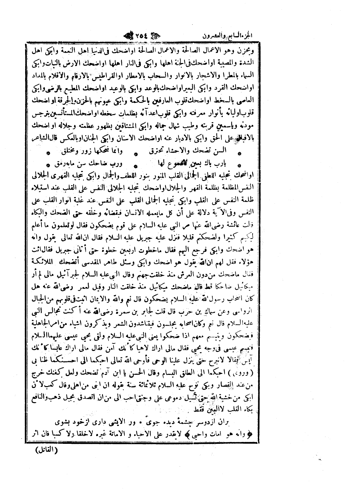 او اضحك بتجليه اللطفى الجمالي القلب المنور بنور اللطف والجمال وابكى بتجليه القهرى الجلالي النفس المظلمة بظلمة القهر والجلال او اضحك بتجليه الجلالي النفس على القلب عند استيلاء ظلمة النفس على القلب وابكى بتجليه الجمالي القلب على النفس عند غلبة أنوار القلب على النفس وفي الآية دلالة على أن كل ما يعمله الإنسان فبقضائه وخلقه حتى الضحك والبكاء قالت عائشة رضى الله عنها مر النبي عليه السلام على قوم يضحكون فقال لو تعلمون ما أعلم لبكيتم كثيرا ولضحكتم قليلا فنزل عليه جبريل عليه السلام فقال ان الله تعالى يقول وانه هو اضحك وابكى فرجع إليهم فقال ما خطوت أربعين خطوة حتى أتانى جبريل فقال ائت هؤلاء فقل لهم ان الله يقول هو اضحك وابكى وسئل طاهر المقدسي أتضحك الملائكة فقال ما ضحك من دون العرش منذ خلقت جهنم وقال النبي عليه السلام لجبرآئيل مالى لم أر ميكائيل ضاحكا قط قال ما ضحك ميكائيل منذ خلقت النار وقيل لعمر رضى الله عنه هل كان اصحاب رسول الله عليه السلام يضحكون قال نعم والله والايمان اثبت في قلوبهم من الجبال الرواسي وعن سماك بن حرب قال قلت لجابر بن سمرة رضى الله عنه أكنت تجالس النبي عليه السلام قال نعم وكان أصحابه يجلسون فيتناشدون الشعر ويذكرون أشياء من امر الجاهلية فيضحكون ويتبسم معهم إذا ضحكوا يعنى النبي عليه السلام ولقى يحيى عيسى عليهما السلام فتبسم عيسى في وجه يحيى فقال ما لي أراك لاهيا كأنك آمن فقال مالى أراك عابسا كأنك آيس فقالا لا نبرح حتى ينزل علينا الوحى فأوحى الله تعالى احبكما الى احسنكما ظنا بي (وروى) احبكما الى الطلق البسام وقال الحسن يا ابن آدم تضحك ولعل كفنك خرج من عند القصار وبكى نوح عليه السلام ثلاثمائة سنة بقوله ان ابني من أهلي وقال كعب لأن ابكى من خشية الله حتى تسيل دموعى على وجنتي أحب الى من ان أتصدق بجبل ذهب والنافع بكاء القلب لا العين فقط.
