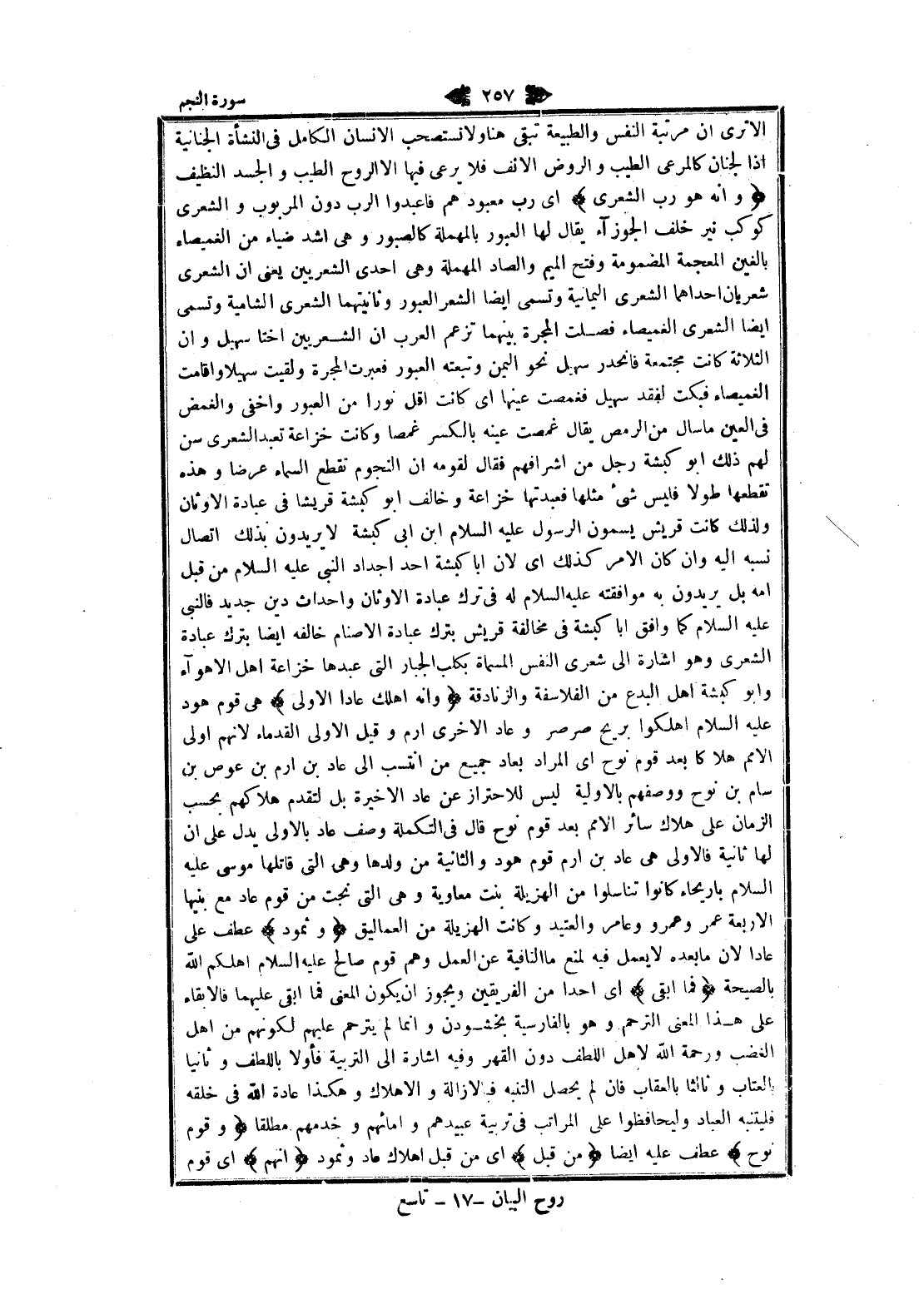 الا ترى ان مرتبة النفس والطبيعة تبقى هنا ولا تستصحب الإنسان الكامل في النشأة الجنانية إذا لجنان كالمرعى الطيب والروض الانف فلا يرعى فيها الا الروح الطيب والجسد النظيف وَأَنَّهُ هُوَ رَبُّ الشِّعْرى اى رب معبود هم فاعبدوا الرب دون المربوب والشعرى كوكب نير خلف الجوزاء يقال لها العبور بالمهملة كالصبور وهى أشد ضياء من الغميصاء بالغين المعجمة المضمومة وفتح الميم والصاد المهملة وهى احدى الشعريين يعنى ان الشعرى شعريان إحداهما الشعرى اليمانية وتسمى ايضا الشعر العبور وثانيتهما الشعرى الشامية وتسمى ايضا الشعرى الغميصاء فصلت المجرة بينهما تزعم العرب ان الشعريين أختا سهيل وان الثلاثة كانت مجتمعة فانحدر سهيل نحو اليمن وتبعته العبور فعبرت المجرة ولقيت سهيلا واقامت الغميصاء فبكت لفقد سهيل فغمصت عينها اى كانت اقل نورا من العبور وأخفى والغمض فى العين ما سال من الرمص يقال غمصت عينه بالكسر غمصا وكانت خزاعة تعبد الشعرى سن لهم ذلك ابو كبشة رجل من اشرافهم فقال لقومه ان النجوم تقطع السماء عرضا وهذه تقطعها طولا فليس شيء مثلها فعبدتها خزاعة وخالف ابو كبشة قريشا في عبادة الأوثان ولذلك كانت قريش يسمون الرسول عليه السلام ابن ابى كبشة لا يريدون بذلك اتصال نسبه اليه وان كان الأمر كذلك اى لان أبا كبشة أحد أجداد النبي عليه السلام من قبل امه بل يريدون به موافقته عليه السلام له في ترك عبادة الأوثان واحداث دين جديد فالنبى عليه السلام كما وافق أبا كبشة في مخالفة قريش بترك عبادة الأصنام خالفه ايضا بترك عبادة الشعرى وهو اشارة الى شعرى النفس المسماة بكلب الجبار التي عبدها خزاعة اهل الأهواء وابو كبشة اهل البدع من الفلاسفة والزنادقة وَأَنَّهُ أَهْلَكَ عاداً الْأُولى هى قوم هود عليه السلام اهلكوا بريح صرصر وعاد الاخرى ارم وقيل الاولى القدماء لانهم اولى الأمم هلاكا بعد قوم نوح اى المراد بعاد جميع من انتسب الى عاد بن ارم بن عوص بن سام بن نوح ووصفهم بالاولية ليس للاحتراز عن عاد الاخيرة بل لتقدم هلاكهم بحسب الزمان على هلاك سائر الأمم بعد قوم نوح قال في التكملة وصف عاد بالأولى يدل على ان لها ثانية فالاولى هى عاد بن ارم قوم هود والثانية من ولدها وهى التي قاتلها موسى عليه السلام بأريحاء كانوا تناسلوا من الهزيلة بنت معاوية وهى التي نجت من قوم عاد مع بنيها الاربعة عمر وعمرو وعامر والعتيد وكانت الهزيلة من العماليق وَثَمُودَ عطف على عادا لان ما بعده لا يعمل فيه لمنع ما النافية عن العمل وهم قوم صالح عليه السلام أهلكهم الله بالصيحة فَما أَبْقى اى أحدا من الفريقين ويجوز ان يكون المعنى فما أبقى عليهما فالابقاء على هذا المعنى الترحم وهو بالفارسية بخشودن وانما لم يترحم عليهم لكونهم من اهل الغضب ورحمة الله لاهل اللطف دون القهر وفيه اشارة الى التربية فأولا باللطف وثانيا بالعتاب وثالثا بالعقاب فان لم يحصل التنبه فبالازالة والإهلاك وهكذا عادة الله في خلقه فليتنبه العباد وليحافظوا على المراتب في تربية عبيدهم وامائهم وخدمهم مطلقا وَقَوْمَ نُوحٍ عطف عليه ايضا مِنْ قَبْلُ اى من قبل إهلاك عاد وثمود إِنَّهُمْ اى قوم