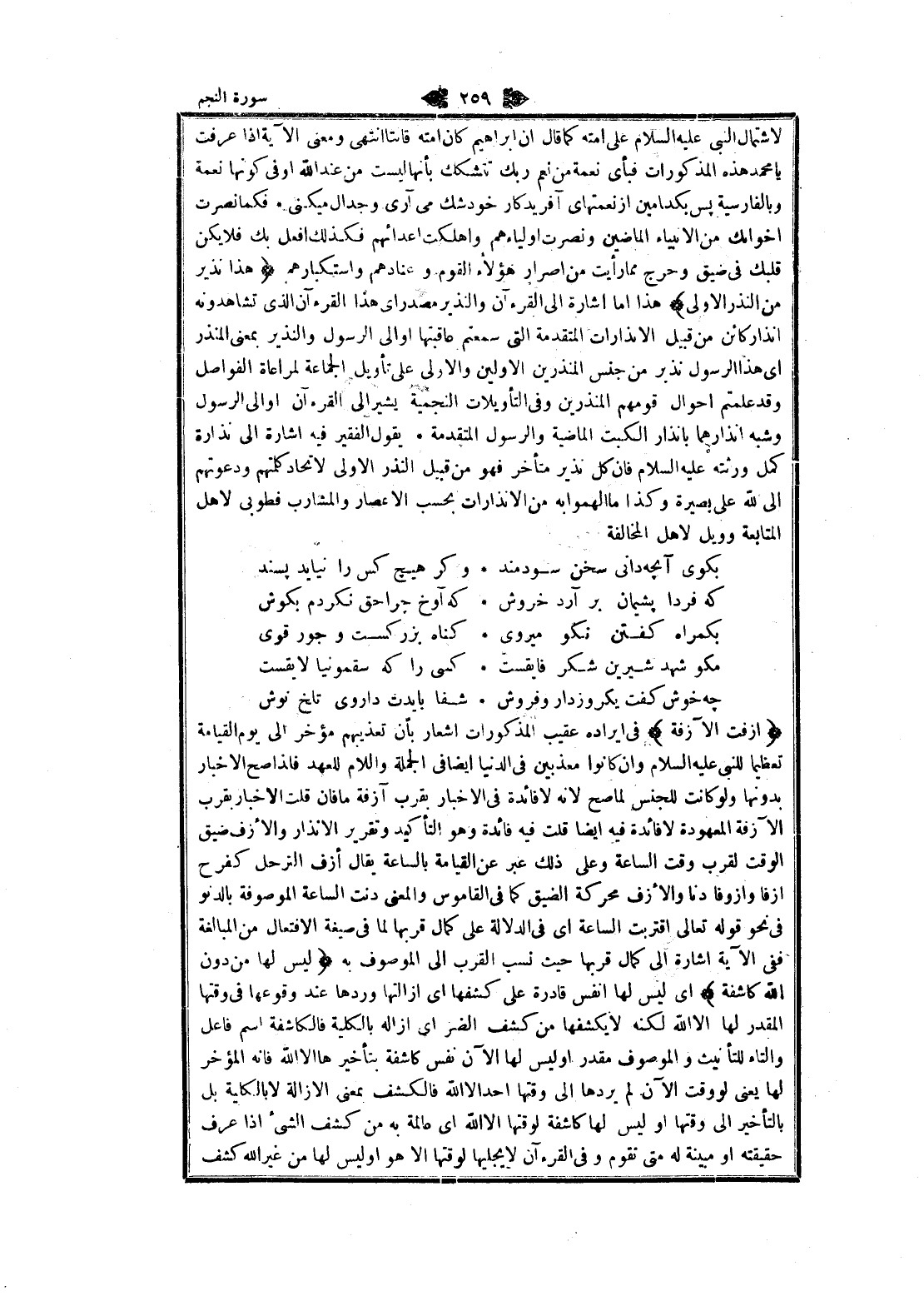 لاشتمال النبي عليه السلام على أمته كما قال ان ابراهيم كان أمته قانتا انتهى ومعنى الآية إذا عرفت يا محمد هذه المذكورات فبأى نعمة من نعم ربك تتشكك بأنها ليست من عند الله او في كونها نعمة وبالفارسية پس بكدامين از نعمتهاى آفريدگار خود شك مى آرى وجدال ميكنى فكما نصرت اخوانك من الأنبياء الماضين ونصرت أولياءهم وأهلكت أعدائهم فكذلك افعل بك فلا يكن قلبك في ضيق وحرج مما رأيت من اصرار هؤلاء القوم وعنادهم واستكبارهم هذا نَذِيرٌ مِنَ النُّذُرِ الْأُولى هذا اما اشارة الى القرآن والنذير مصدر اى هذا القرآن الذي تشاهدونه إنذار كائن من قبيل الانذارات المتقدمة التي سمعتم عاقبتها او الى الرسول والنذير بمعنى المنذر اى هذا الرسول نذير من جنس المنذرين الأولين والاولى على تأويل الجماعة لمراعاة الفواصل وقد علمتم احوال قومهم المنذرين وفي التأويلات النجمية يشير الى القرآن او الى الرسول وشبه انذارهما بانذار الكبت الماضية والرسول المتقدمة يقول الفقير فيه اشارة الى نذارة كمل ورثته عليه السلام فان كل نذير متأخر فهو من قبيل النذر الاولى لاتحاد كلمتهم ودعوتهم الى الله على بصيرة وكذا ما ألهموا به من الانذارات بحسب الاعصار والمشارب فطوبى لاهل المتابعة وويل لاهل المخالفة