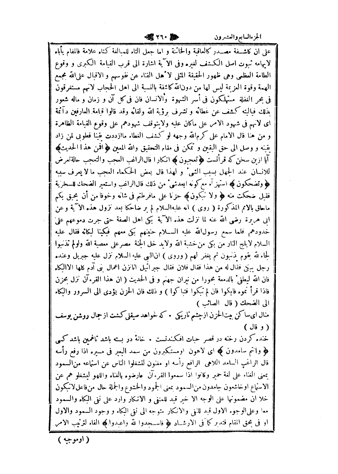 على ان كاشفة مصدر كالعاقبة والخائنة واما جعل التاء للمبالغة كتاء علامة فالمقام يأباه لا يهامه ثبوت اصل الكشف لغيره وفي الآية اشارة الى قرب القيامة الكبرى ووقوع الطامة العظمى وهى ظهور الحقيقة المثلى لأهل الفناء عن نفوسهم والإقبال على الله بجمع الهمة وقوة العزيمة ليس لها من دون الله كاشفة بالنسبة الى اهل الحجاب لانهم مستغرقون فى بحر الغفلة مستهلكون في أسر الشهوة والإنسان فان في كل آن وزمان وماله شعور بذلك فياليته كشف عن غطائه وتشرف برؤية الله ولقائه وقد قالوا قيامة العارفين دائمة اى لانهم في شهود الأمر على ما كان عليه ولا يتوقف شهودهم على وقوع القيامة الظاهرة ومن هنا قال الامام على كرم الله وجهه لو كشف الغطاء ما ازددت يقينا فطوبى لمن زاد يقينه ووصل الى حق اليقين وتمكن في مقام التحقيق والله المعين أَفَمِنْ هذَا الْحَدِيثِ آيا ازين سخن كه قرآنست تَعْجَبُونَ