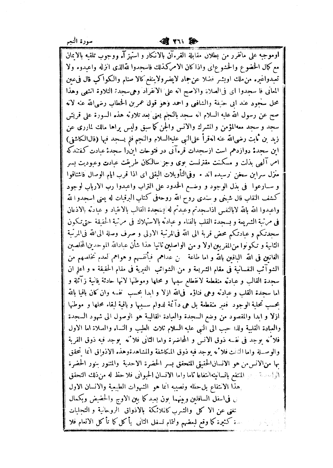 على التراب واعبدوا رب الأرباب لوجود كشف النقاب قال شيخى وسندى روح الله روحه في كتاب البرقيات له يعنى اسجدوا لله واعبدوا الله بالله لا بالنفس إذا سجدتم وعبدتم له بسجدة القالب بالانقياد وعبادته بالإذعان فى مرتبة الشريعة وبسجدة القلب بالفناء وعبادته بالاستهلاك في مرتبة الحقيقة حتى تكون سجدتكم وعبادتكم محض قربة الى الله في المرتبة الاولى وصرف وصلة الى الله في المرتبة الثانية وتكونوا من المقربين اولا ومن الواصلين ثانيا هذا شأن عباد الله الموحدين المخلصين الفانين في الله الباقين بالله واما طاعة من عداهم فبأنفسهم وهواهم لعدم تخلصهم من الشوائب النفسانية في مقام الشريعة ومن الشوائب الغيرية في مقام الحقيقة واعلم ان سجدة القالب وعبادته منقطعة لانقطاع سببها ومحلها وموطنها لانها حادثة فانية زائلة واما سجدة القلب وعبادته وهى فناؤه في الله ازلا وابدا بحسب نفسه وان كان باقيا بالله بحسب تحلية الوجود فغير منقطعة بل هى دائمة لدوام سببها وباقية لبقاء محلها وموطنها ازلا وابدا والمقصود من وضع السجدة والعبادة القالبية هو الوصول الى شهود السجدة والعبادة القلبية ولذا حبب الى النبي عليه السلام ثلاث الطيب والنساء والصلاة اما الاول فلأنه يوجد في نفسه ذوق الانس والمحاضرة واما الثاني فلأنه يوجد فيه ذوق القربة والوصلة واما الثالث فلأنه يوجد فيه ذوق المكاشفة والمشاهدة وهذه الأذواق انما يتحقق بها من الانس من هو الإنسان الحقيقي المتحقق بسر الحضرة الاحدية والمتنور بنور الحضرة الواحدية وهو المنتفع بانسانيته انتفاعا تاما واما الإنسان الحيواني فلاحظ له من ذلك التحقق ولا نصيب له من هذا الانتفاع بل حظه ونصيبه انما هو الشهوات الطبيعية والإنسان الاول فى أعلى عليين والثاني في أسفل السافلين وبينهما بون بعيد كما بين الأوج والحضيض وبكمال علو الاول قد يستغنى عن الاكل والشرب كالملائكة بالاذواق الروحانية والتجليات الربانية وذلك مدة كثيرة كما وقع لبعضهم ولتمام تسفل الثاني يأكل كما تأكل الانعام فلا