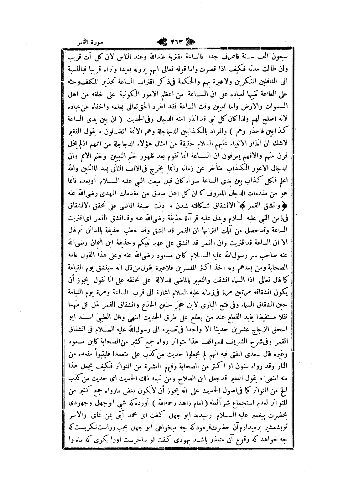 فلا عبرة بقول من قال انه سينشق يوم القيامة كما قال تعالى إذا السماء انشقت والتعبير بالماضي للدلالة على تحققه على انا نقول يجوز أن يكون انشقاقه مرتين مرة في زمانه عليه السلام اشارة الى قرب الساعة ومرة يوم القيامة حين انشقاق السماء وفي فتح الباري لابن حجر حنين الجذع وانشقاق القمر نقل كل منهما نقلا مستفيضا يفيد القطع عند من يطلع على طرق الحديث انتهى وقال الطيبي أسند ابو اسحق الزجاج عشرين حديثا الا واحدا في تفسيره الى رسول الله عليه السلام في انشقاق القمر وفي شرح الشريف للمواقف هذا متواتر رواه جمع كثير من الصحابة كابن مسعود وغيره قال سعدى المفتى فيه انهم لم يجعلوا حديث من كذب على متعمدا فليتبوأ مقعده من النار وقد رواه ستون او اكثر من الصحابة وفيهم العشرة من المتواتر فكيف يجعل هذا منه انتهى يقول الفقير قد جعل ابن الصلاح ومن تبعه ذلك الحديث اى حديث من كذب إلخ من المتواتر كما في اصول الحديث على انه يجوز أن لا يكون بعض ما رواه جمع كثير من المتواتر لعدم استجماع شرائطه (امام زاهد رحمه الله) آورده كه شبى ابو جهل وجهودى بحضرت پيغمبر عليه السلام رسيدند ابو جهل كفت اى محمد آيتي بمن نماى والاسر تو بشمشير برميدارم آن حضرت فرمود كه چهـ ميخواهى ابو جهل بجب وراست نكريست كه چهـ خواهد كه وقوع آن متعذر باشد يهودى گفت او ساحرست او را بكوى كه ماه را