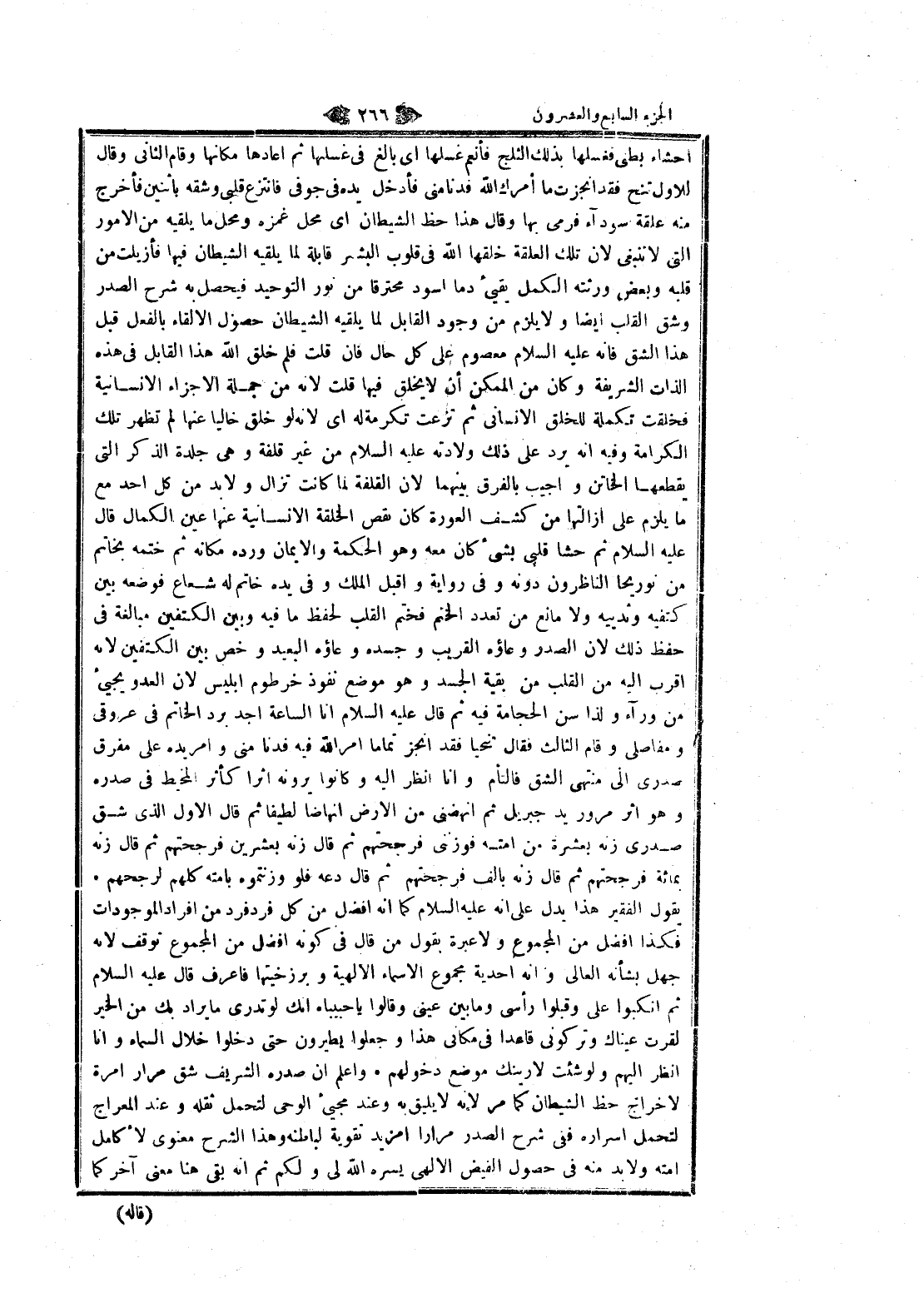 أحشاء بطني فغسلها بذلك الثلج فأنعم غسلها اى بالغ في غسلها ثم أعادها مكانها وقام الثاني وقال للاول تنح فقد أنجزت ما أمرك الله فدنا منى فأدخل يده في جوفى فانتزع قلبى وشقه باثنين فأخرج منه علقة سوداء فرمى بها وقال هذا حظ الشيطان اى محل غمزه ومحل ما يلقيه من الأمور التي لا ننبغى لان تلك العلقة خلقها الله في قلوب البشر قابلة لما يلقيه الشيطان فيها فأزيلت من قلبه وبعض ورثته الكمل يقيئ دما اسود محترقا من نور التوحيد فيحصل به شرح الصدر وشق القلب ايضا ولا يلزم من وجود القابل لما يلقيه الشيطان حصول الإلقاء بالفعل قبل هذا الشق فانه عليه السلام معصوم على كل حال فان قلت فلم خلق الله هذا القابل في هذه الذات الشريفة وكان من الممكن أن لا يخلق فيها قلت لانه من جملة الاجزاء الانسانية فخلقت تكملة للخلق الإنساني ثم تزعت تكرمة له اى لانه لو خلق خاليا عنها لم تظهر تلك الكرامة وفيه انه يرد على ذلك ولادته عليه السلام من غير قلفة وهى جلدة الذكر التي يقطعها الخاتن وأجيب بالفرق بينهما لان القلفة لما كانت تزال ولا بد من كل أحد مع ما يلزم على إزالتها من كشف العورة كان نقص الخلقة الانسانية عنها عين الكمال قال عليه السلام ثم حشا قلبى بشيء كان معه وهو الحكمة والايمان ورده مكانه ثم ختمه بخاتم من نوريحا الناظرون دونه وفي رواية واقبل الملك وفي يده خاتم له شعاع فوضعه بين كتفيه وثدييه ولا مانع من تعدد الختم فختم القلب لحفظ ما فيه وبين الكتفين مبالغة في