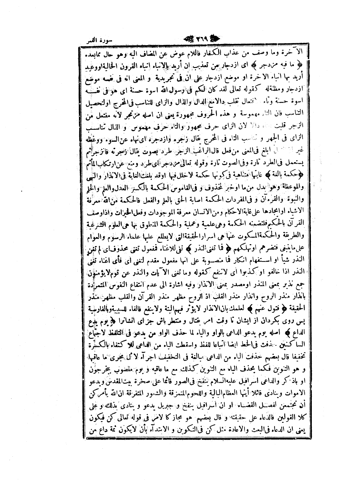الآخرة وما وصف من عذاب الكفار فاللام عوض عن المضاف اليه وهو حال مما بعده ما فِيهِ مُزْدَجَرٌ اى ازدجار من تعذيب ان أريد بالانباء انباء القرون الخالية او وعيد أريد بها انباء الاخرة او موضع ازدجار على ان في تجريدية والمعنى انه في نفسه موضع ازدجار ومظنة له كقوله تعالى لقد كان لكم في رسول الله أسوة حسنة اى هو في نفسه أسوة حسنة وتاء الافتعال تقلب دالا مع الدال والذال والزاى للتناسب في المخرج او لتحصيل التناسب فان التاء مهموسة وهذه الحروف مجهورة يعنى ان أصله مزتجر لانه مفتعل من الزجر قلبت التاء ذالا لان الزاى حرف مجهور والتاء حرف مهموس والذال تناسب الزاى في الجهر وتناسب التاء في المخرج يقال زجره وازدجره اى نهاه عن السوء ووعظه غير ان افتعل ابلغ في المعنى من فعل قال الراغب الزجر طرد بصوت يقال زجرته فانزجر ثم يستعمل في الطرد تارة وفي الصوت تارة وقوله تعالى مزدجر اى طرد ومنع عن ارتكاب المأثم حِكْمَةٌ بالِغَةٌ غايتها متناهية في كونها حكمة لا خلل فيها او قد بلغت الغاية في الانذار والنهى والموعظة وهو بدل من ما او خبر لمحذوف وفي القاموس الحكمة بالكسر العدل والعلم والحلم والنبوة والقرآن وفي المفردات الحكمة إصابة الحق بالعلم والفعل فالحكمة من الله معرفة الأشياء او إيجادها على غاية الاحكام ومن الإنسان معرفة الموجودات وفعل الخيرات وإذا وصف القرآن بالحكيم فلتضمنه الحكمة وهى علمية وعملية والحكمة المنطوق بها هى العلوم الشرعية والطريقة والحكمة المسكوت عنها هى اسرار الحقيقة التي لا يطلع عليها علماء الرسوم والعوام على ما ينبغى فتضرهم او تهلكهم فَما تُغْنِ النُّذُرُ نفى للاغناء فمفعول تغنى محذوف اى لم تغن النذر شيئا او استفهام انكار فما منصوبة على انها مفعول مقدم لتغنى اى فأى إغناء تغنى النذر إذا خالفو او كذبوا اى لا تنفع كقوله وما تغنى الآيات والنذر عن قوم لا يؤمنون جمع نذير بمعنى المنذر او مصدر بمعنى الانذار وفيه اشارة الى عدم انتفاع النفوس المتمردة بانذار منذر الروح وإنذار منذر القلب إذ الروح مظهر منذر القرآن والقلب مظهر منذر الحقيقة فَتَوَلَّ عَنْهُمْ لعلمك بان الانذار لا يؤثر فيهم البتة ولا ينفع فالفاء للسببية وبالفارسية پس روى بگردان از ايشان تا وقت امر بقتال ومنتظر باش جزاى ايشانرا يَوْمَ يَدْعُ الدَّاعِ أصله يوم يدعو الداعي بالواو والياء لما حذف الواو من يدعو في التلفظ لاجتماع الساكنين حذفت في الخط ايضا اتباعا للفظ وأسقطت الياء من الداعي للاكتفاء بالكسرة تخفيفا قال بعضهم حذفت الياء من الداعي مبالغة في التخفيف إجراء لأل مجرى ما عاقبها وهو التنوين فكما يحذف الياء مع التنوين كذلك مع ما عاقبه ويوم منصوب بيخرجون او باذكر والداعي اسرافيل عليه السلام ينفخ في الصور قائما على صخرة بيت المقدس ويدعو الأموات وينادى قائلا أيتها العظام البالية واللحوم المتمزقة والشعور المتفرقة ان الله يأمركن أن تجتمعن لفصل القضاء او ان اسرافيل ينفخ وجبريل يدعو وينادى بذلك وعلى كلا القولين فالدعاء على حقيقته وقال بعضهم هو مجاز كالامر في قوله تعالى كن فيكون يعنى ان الدعاء في البعث والاعادة مثل كن في التكوين والابتداء بأن لا يكون ثمة داع من