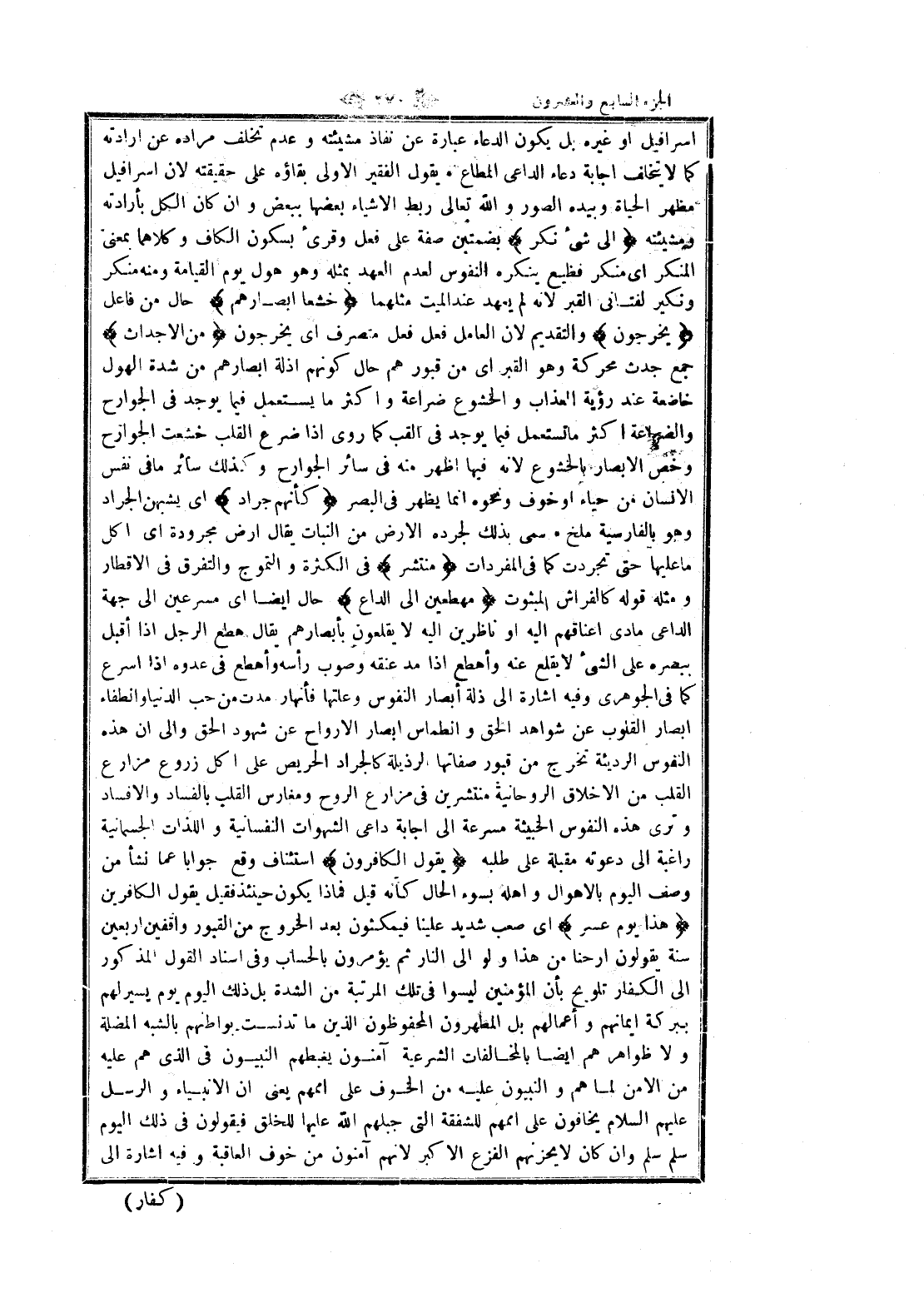 اسرافيل او غيره بل يكون الدعاء عبارة عن نفاذ مشيئته وعدم تخلف مراده عن إرادته كما لا يتخلف اجابة دعاء الداعي المطاع يقول الفقير الاولى بقاؤه على حقيقته لان اسرافيل مظهر الحياة وبيده الصور والله تعالى ربط الأشياء بعضها ببعض وان كان الكل بأرادته ومشيئته إِلى شَيْءٍ نُكُرٍ بضمتين صفة على فعل وقرئ بسكون الكاف وكلاهما بمعنى المنكر اى منكر فظيع ينكره النفوس لعدم العهد بمثله وهو هول يوم القيامة ومنه منكر ونكير لفتانى القبر لانه لم يعهد عند الميت مثلهما خُشَّعاً أَبْصارُهُمْ حال من فاعل يَخْرُجُونَ والتقديم لان العامل فعل فعل متصرف اى يخرجون مِنَ الْأَجْداثِ جمع جدث محركة وهو القبر اى من قبورهم حال كونهم اذلة أبصارهم من شدة الهول خاضعة عند رؤية العذاب والخشوع ضراعة واكثر ما يستعمل فيما يوجد في الجوارح والضراعة اكثر ما تستعمل فيما يوجد في القلب كما روى إذا ضرع القلب خشعت الجوارح وخص الابصار بالخشوع لانه فيها اظهر منه فى سائر الجوارح وكذلك سائر ما في نفس الإنسان من حياء او خوف ونحوه انما يظهر في البصر كَأَنَّهُمْ جَرادٌ اى يشبهن الجراد وهو بالفارسية ملخ سمى بذلك لجرده الأرض من النبات يقال ارض مجرودة اى أكل ما عليها حتى تجردت كما في المفردات مُنْتَشِرٌ فى الكثرة والتموج والتفرق في الأقطار ومثله قوله كالفراش المبثوث مُهْطِعِينَ إِلَى الدَّاعِ حال ايضا اى مسرعين الى جهة الداعي مادى أعناقهم اليه او ناظرين اليه لا يقلعون بأبصارهم يقال هطع الرجل إذا أقبل ببصره على الشيء لا يقلع عنه وأهطع إذا مد عنقه وصوب رأسه وأهطع في عدوه إذا اسرع كما في الجوهري وفيه اشارة الى ذلة أبصار النفوس وعلتها فأنهار مدت من حب الدنيا وانطفاء أبصار القلوب عن شواهد الحق وانطماس أبصار الأرواح عن شهود الحق والى ان هذه النفوس الرديئة تخرج من قبور صفاتها الرذيلة كالجراد الحريص على أكل زروع مزارع القلب من الأخلاق الروحانية منتشرين في مزارع الروح ومغارس القلب بالفساد والإفساد وترى هذه النفوس الخبيثة مسرعة الى اجابة داعى الشهوات النفسانية واللذات الجسمانية راغبة الى دعوته مقبلة على طلبه يَقُولُ الْكافِرُونَ استئناف وقع جوابا عما نشأ من وصف اليوم بالاهوال واهله بسوء الحال كأنه قيل فماذا يكون حينئذ فقيل يقول الكافرين هذا يَوْمٌ عَسِرٌ اى صعب شديد علينا فيمكثون بعد الخروج من القبور واقفين أربعين سنة يقولون أرحنا من هذا ولو الى النار ثم يؤمرون بالحساب وفي اسناد القول المذكور الى الكفار تلويح بأن المؤمنين ليسوا في تلك المرتبة من الشدة بل ذلك اليوم يوم يسير لهم ببركة ايمانهم وأعمالهم بل المطهرون المحفوظون الذين ما تدنست بواطنهم بالشبه المضلة ولا ظواهرهم ايضا بالمخالفات الشرعية آمنون يغبطهم النبيون في الذي هم عليه من الامن لما هم والنبيون عليه من الخوف على أممهم يعنى ان الأنبياء والرسل عليهم السلام يخافون على أممهم للشفقة التي جبلهم الله عليها للخلق فيقولون في ذلك اليوم سلم سلم وان كان لا يحزنهم الفزع الأكبر لانهم آمنون من خوف العاقبة وفيه اشارة الى