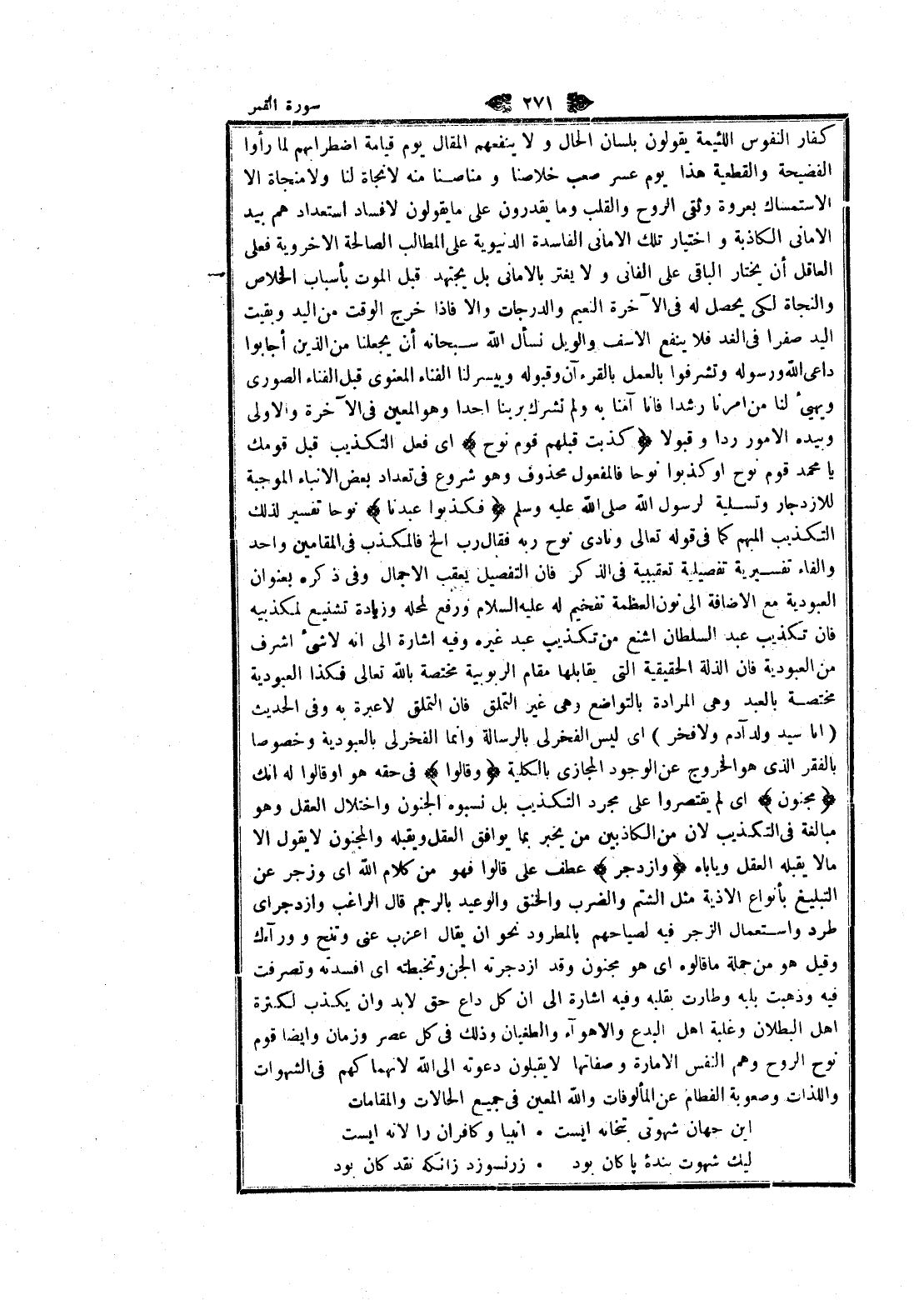كفار النفوس اللئيمة يقولون بلسان الحال ولا ينفعهم المقال يوم قيامة اضطرابهم لما رأوا الفضيحة والقطعية هذا يوم عسر صعب خلاصنا ومناصنا منه لا نجاة لنا ولا منجاة الا الاستمساك بعروة وثقى الروح والقلب وما يقدرون على ما يقولون لافساد استعداد هم بيد الأماني الكاذبة واختيار تلك الأماني الفاسدة الدنيوية على المطالب الصالحة الاخروية فعلى العاقل أن يختار الباقي على الفاني ولا يغتر بالأماني بل يجتهد قبل الموت بأسباب الخلاص والنجاة لكى يحصل له في الآخرة النعيم والدرجات والا فاذا خرج الوقت من اليد وبقيت اليد صفرا في الغد فلا ينفع الأسف والويل نسأل الله سبحانه أن يجعلنا من الذين أجابوا داعى الله ورسوله وتشرفوا بالعمل بالقرءان وقبوله وييسر لنا الفناء المعنوي قبل الفناء الصوري ويهيئ لنا من أمرنا رشدا فانا آمنا به ولم نشرك بربنا أحدا وهو المعين في الآخرة والاولى وبيده الأمور ردا وقبولا كَذَّبَتْ قَبْلَهُمْ قَوْمُ نُوحٍ اى فعل التكذيب قبل قومك يا محمد قوم نوح او كذبوا نوحا فالمفعول محذوف وهو شروع في تعداد بعض الانباء الموجبة للازدجار وتسلية لرسول الله صلّى الله عليه وسلّم فَكَذَّبُوا عَبْدَنا نوحا تفسير لذلك التكذيب المبهم كما في قوله تعالى ونادى نوح ربه فقال رب إلخ فالمكذب في المقامين واحد والفاء تفسيرية تفصيلية تعقيبية في الذكر فان التفصيل يعقب الإجمال وفي ذكره بعنوان العبودية مع الاضافة الى نون العظمة تفخيم له عليه السلام ورفع لمحله وزيادة تشنيع لمكذبيه فان تكذيب عبد السلطان اشنع من تكذيب عبد غيره وفيه اشارة الى انه لا شيء اشرف من العبودية فان الذلة الحقيقية التي يقابلها مقام الربوبية مختصة بالله تعالى فكذا العبودية مختصة بالعبد وهى المرادة بالتواضع وهى غير التملق فان التملق لا عبرة به وفي الحديث (انا سيد ولد آدم ولا فخر) اى ليس الفخر لى بالرسالة وانما الفخر لى بالعبودية وخصوصا بالفقر الذي هو الخروج عن الوجود المجازى بالكلية وَقالُوا فى حقه هو او قالوا له انك مَجْنُونٌ اى لم يقتصروا على مجرد التكذيب بل نسبوه الجنون واختلال العقل وهو مبالغة في التكذيب لان من الكاذبين من يخبر بما يوافق العقل ويقبله والمجنون لا يقول الا مالا يقبله العقل ويأباه وَازْدُجِرَ عطف على قالوا فهو من كلام الله اى وزجر عن التبليغ بأنواع الاذية مثل الشتم والضرب والخنق والوعيد بالرجم قال الراغب وازدجر اى طرد واستعمال الزجر فيه لصياحهم بالمطرود نحو ان يقال اعزب عنى وتنح ووراءك وقيل هو من جملة ما قالوه اى هو مجنون وقد ازدجرته الجن وتخبطته اى أفسدته وتصرفت فيه وذهبت بلبه وطارت بقلبه وفيه اشارة الى ان كل داع حق لا بد وان يكذب لكثرة اهل البطلان وغلبة اهل البدع والأهواء والطغيان وذلك في كل عصر وزمان وايضا قوم نوح الروح وهم النفس الامارة وصفاتها لا يقبلون دعوته الى الله لانهما كهم في الشهوات واللذات وصعوبة الفطام عن المألوفات والله المعين في جميع الحالات والمقامات