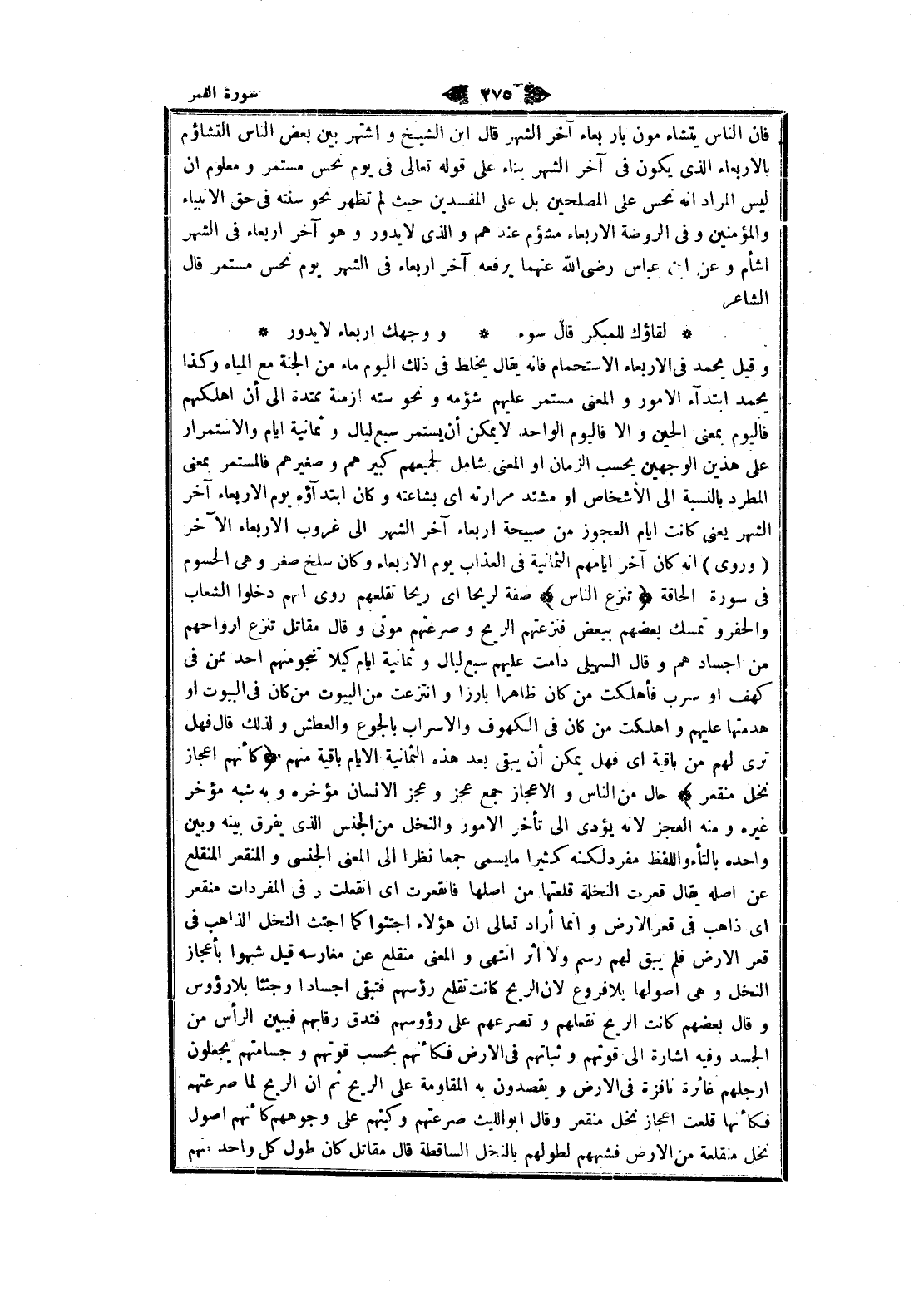 فان الناس يتشاءمون بأربعاء آخر الشهر قال ابن الشيخ واشتهر بين بعض الناس التشاؤم بالأربعاء الذي يكون في آخر الشهر بناء على قوله تعالى في يوم نحس مستمر ومعلوم ان ليس المراد انه نحس على المصلحين بل على المفسدين حيث لم تظهر نحو سنته في حق الأنبياء والمؤمنين وفي الروضة الأربعاء مشؤم عندهم والذي لا يدور وهو آخر أربعاء في الشهر أشأم وعن ابن عباس رضى الله عنهما يرفعه آخر أربعاء في الشهر يوم نحس مستمر قال الشاعر