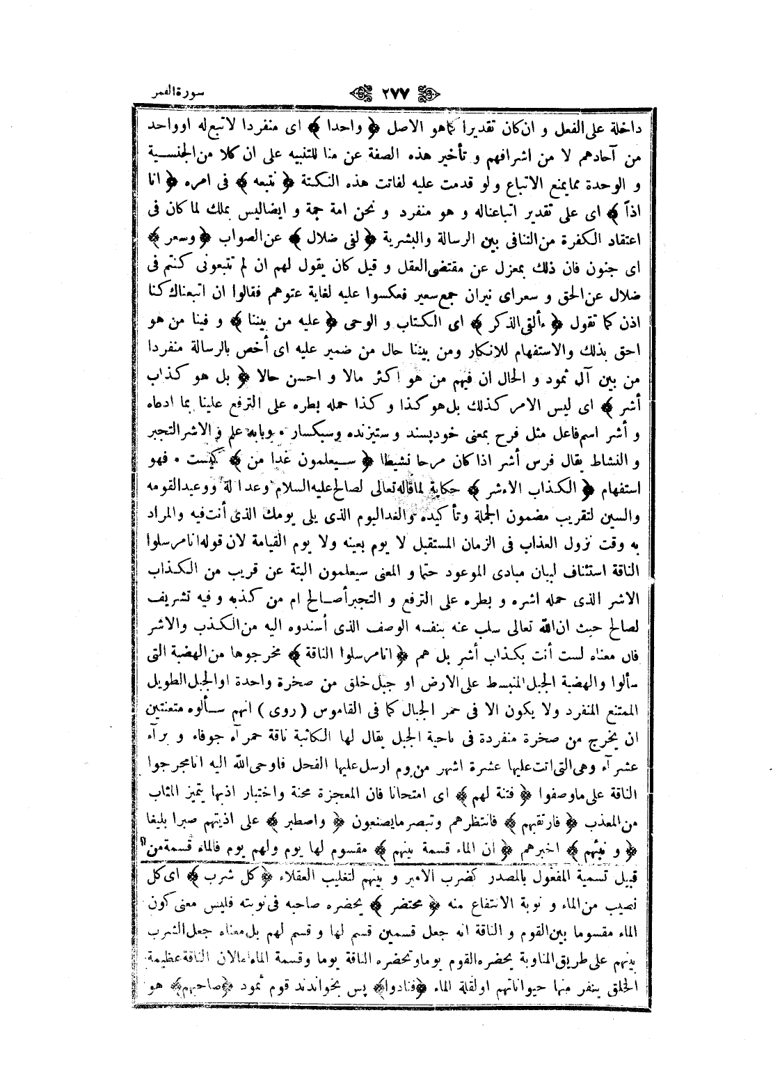 داخلة على الفعل وان كان تقديرا كما هو الأصل واحِداً اى منفردا لاتبع له او واحد من آحادهم لا من اشرافهم وتأخير هذه الصفة عن منا للتنبيه على ان كلا من الجنسية والوحدة مما يمنع الاتباع ولو قدمت عليه لفاتت هذه النكتة نَتَّبِعُهُ فى امره إِنَّا إِذاً اى على تقدير اتباعنا له وهو منفرد ونحن امة جمة وايضا ليس بملك لما كان في اعتقاد الكفرة من التنافي بين الرسالة والبشرية لَفِي ضَلالٍ عن الصواب وَسُعُرٍ اى جنون فان ذلك بمعزل عن مقتضى العقل وقيل كان يقول لهم ان لم تتبعونى كنتم في ضلال عن الحق وسعراى نيران جمع سعير فعكسوا عليه لغاية عتوهم فقالوا ان اتبعناك كنا اذن كما تقول أَأُلْقِيَ الذِّكْرُ اى الكتاب والوحى عَلَيْهِ مِنْ بَيْنِنا وفينا من هو أحق بذلك والاستفهام للانكار ومن بيننا حال من ضمير عليه اى أخص بالرسالة منفردا من بين آل ثمود والحال ان فيهم من هو اكثر مالا واحسن حالا بَلْ هُوَ كَذَّابٌ أَشِرٌ اى ليس الأمر كذلك بل هو كذا وكذا حمله بطره على الترفع علينا بما ادعاه وأشر اسم فاعل مثل فرح بمعنى خود پسند وستيزنده وسبكسار وبابه علم والأشر التجبر والنشاط يقال فرس أشر إذا كان مرحا نشيطا سَيَعْلَمُونَ غَداً مَنِ كيست فهو استفهام الْكَذَّابُ الْأَشِرُ حكاية لما قاله تعالى لصالح عليه السلام وعدا له ووعيد القومة والسين لتقريب مضمون الجملة وتأكيده والغد اليوم الذي يلى يومك الذي أنت فيه والمراد به وقت نزول العذاب في الزمان المستقبل لا يوم بعينه ولا يوم القيامة لان قوله انا مرسلوا الناقة استئناف لبيان مبادى الموعود حتما والمعنى سيعلمون البتة عن قريب من الكذاب الأشر الذي حمله أشره وبطره على الترفع والتجبر أصالح أم من كذبه وفيه تشريف لصالح حيث ان الله تعالى سلب عنه بنفسه الوصف الذي أسندوه اليه من الكذب والأشر فان معناه لست أنت بكذاب أشر بل هم إِنَّا مُرْسِلُوا النَّاقَةِ مخرجوها من الهضبة التي سألوا والهضبة الجبل المنبسط على الأرض او جبل خلق من صخرة واحدة او الجبل الطويل الممتنع المنفرد ولا يكون الا في حمر الجبال كما في القاموس (روى) انهم سألوه متعنتين ان يخرج من صخرة منفردة في ناحية الجبل يقال لها الكاثبة ناقة حمراء جوفاء وبرآء عشراء وهى التي أتت عليها عشرة أشهر من يوم أرسل عليها الفحل فاوحى الله اليه انا مجرجوا الناقة على ما وصفوا فِتْنَةً لَهُمْ اى امتحانا فان المعجزة محنة واختبار إذ بها يتميز المثاب من المعذب فَارْتَقِبْهُمْ فانتظرهم وتبصر ما يصنعون وَاصْطَبِرْ على اذيتهم صبرا بليغا وَنَبِّئْهُمْ أخبرهم أَنَّ الْماءَ قِسْمَةٌ بَيْنَهُمْ مقسوم لها يوم ولهم يوم فالمآء قسمة من قبيل تسمية المفعول بالمصدر كضرب الأمير وبينهم لتغليب العقلاء كُلُّ شِرْبٍ اى كل نصيب من الماء ونوبة الانتفاع منه مُحْتَضَرٌ يحضره صاحبه في نوبته فليس معنى كون الماء مقسوما بين القوم والناقة انه جعل قسمين قسم لها وقسم لهم بل معناه جعل الشرب بينهم على طريق المناوبة يحضره القوم يوما وتحضره الناقة يوما وقسمة الماء إما لأن الناقة عظيمة الخلق ينفر منها حيواناتهم او لقلة الماء فَنادَوْا پس بخواندند قوم ثمود صاحِبَهُمْ هو