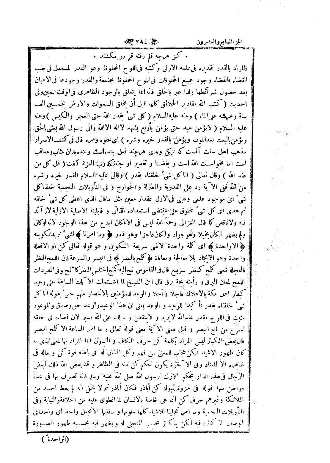 كز هر چهـ قلم رفته قلم در نكشند فالمراد بالقدر تقديره في علمه الأزلي وكتبه في اللوح المحفوظ وهو القدر المستعمل في جنب القضاء فالقضاء وجود جميع المخلوقات في اللوح المحفوظ مجتمعة والقدر وجودها في الأعيان بعد حصول شرائطها ولذا عبر بالخلق فانه انما يتعلق بالوجود الظاهري في الوقت المعين وفي الحديث (كتب الله مقادير الخلائق كلها قبل أن يخلق السموات والأرض بخمسين الف سنة وعرشه على الماء) وعنه عليه السلام (كل شيء بقدر الله حتى العجز والكيس) وعنه عليه السلام (لا يؤمن عبد حتى يؤمن بأربع يشهد لا اله الا الله وانى رسول الله بعثني بالحق ويؤمن بالبعث بعد الموت ويؤمن بالقدر خيره وشره) اى حلوه ومره قال في كشف الاسرار مذهب اهل سنت آنست كه نيكى وبدى هر چند فعل بنده است وبنده بدان مثاب ومعاقب است اما بخواست الله است وبقضا وتقدير او چنانكه رب العزة كفت (قل كل من عند الله) وقال تعالى (انا كل شيء خلقناه بقدر) وقال عليه السلام القدر خيره وشره من الله ففى الآية رد على القدرية والمعتزلة والخوارج وفي التأويلات النجمية خلقنا كل شيء اى موجود علمى وعينى في الأزل بمقدار معين مثل ما قال الذي اعطى كل شيء خلقه ثم هدى اى كل شيء مخلوق على مقتضى استعداده الذاتي وقابليته الاصلية الازلية لا زائد فيه ولا ناقص كما قال الغزالي رحمه الله ليس في الإمكان أبدع من هذا الوجود لانه لو كان ولم يظهر لكان بخيلا وهو جواد ولكان عاجزا وهو قادر وَما أَمْرُنا لشيء نريد تكوينه إِلَّا واحِدَةٌ اى كلمة واحدة لا تثنى سريعة التكوين وهو قوله تعالى كن او إلا فعلة واحدة وهو الإيجاد بلا معالجة ومعاناة كَلَمْحٍ بِالْبَصَرِ فى اليسر والسرعة فان اللمح النظر بالعجلة فمعنى كلمح كنظر سريع قال في القاموس لمح اليه كمنع اختلس النظر كألمح وفي المفردات اللمح لمعان البرق ورأيته لمحة برق قال ابن الشيخ لما اشتملت الآيات السابقة على وعيد كفار اهل مكة بالإهلاك عاجلا وآجلا والوعد للمؤمنين بالانتصار منهم جيئ بقوله إنا كل شيء خلقناه بقدر تأكيدا للوعيد والوعيد يعنى ان هذا الوعيد والوعد حق وصدق والموعد مثبت في اللوح مقدر عند الله لا يزيد ولا ينقص وذلك على الله يسير لان قضاءه في خلقه اسرع من لمح البصر وقيل معنى الآية معنى قوله تعالى وما امر الساعة الا كلمح البصر قال بعض الكبار ليس المراد بكلمة كن حرف الكاف والنون انما المراد بها المعنى الذي به كان ظهور الأشياء فكن حجاب للمعنى لمن فهم وكل انسان له في باطنه قوة كن وماله في ظاهره الا المعتاد وفي الآخرة يكون حكم كن منه في الظاهر وقد يعطى الله ذلك لبعض الرجال في هذه الدار بحكم الإرث لرسول الله صلّى الله عليه وسلّم فانه تصرف بها في عدة مواطن منها قوله في غزوة تبوك كن أباذر فكان أباذر ثم لا يخفى انه لم يعط أحد من الملائكة وغيرهم حرف كن انما هى خاصة بالإنسان لما انطوى عليه من الخلافة والنيابة وفي التأويلات النجمية وما امر تجلينا للاشياء كلها علويها وسفليها إلا جعل واحد اى وحداني الوصف لا كثرة فيه لكن يتكثر بحسب المتجلى له ويظهر فيه بحسبه ظهور الصورة