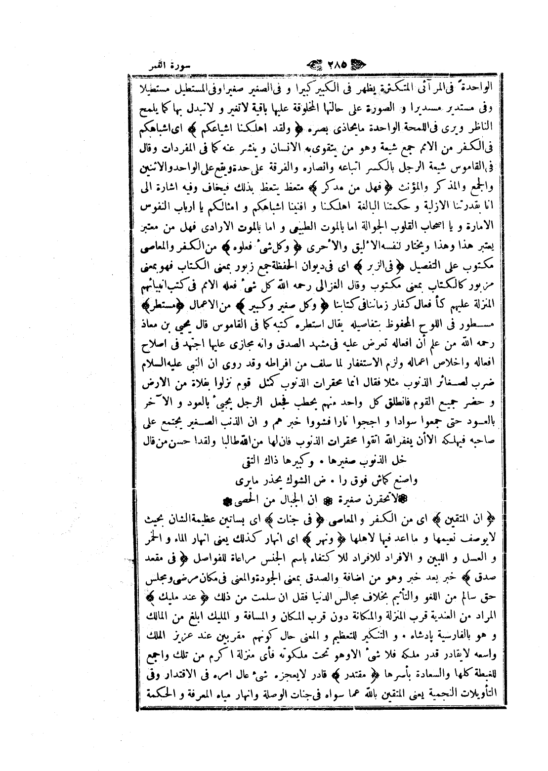 الواحدة في المرائى المتكثرة يظهر في الكبير كبيرا وفي الصغير صغيرا وفي المستطيل مستطيلا وفي مستدير مسديرا والصورة على حالتها المخلوقة عليها باقية لا تغير ولا تبدل بها كما يلمح الناظر ويرى في اللمحة الواحدة ما يحاذى بصره وَلَقَدْ أَهْلَكْنا أَشْياعَكُمْ اى اشباهكم فى الكفر من الأمم جمع شيعة وهو من يتقوى به الإنسان وينشر عنه كما في المفردات وقال فى القاموس شيعة الرجل بالكسر اتباعه وأنصاره والفرقة على حدة ويقع على الواحد والاثنين والجمع والمذكر والمؤنث فَهَلْ مِنْ مُدَّكِرٍ متعظ يتعظ بذلك فيخاف وفيه اشارة الى انا بقدرتنا الازلية وحكمتنا البالغة أهلكنا وأفنينا اشباهكم وأمثالكم يا ارباب النفوس الامارة ويا اصحاب القلوب الجوالة اما بالموت الطبيعي واما بالموت الإرادي فهل من معتبر يعتبر هذا وهذا ويختار لنفسه الأليق والأحرى وَكُلُّ شَيْءٍ فَعَلُوهُ من الكفر والمعاصي مكتوب على التفصيل فِي الزُّبُرِ اى في ديوان الحفظة جمع زبور بمعنى الكتاب فهو بمعنى مزبور كالكتاب بمعنى مكتوب وقال الغزالي رحمه الله كل شيء فعله الأمم في كتب أنبيائهم المنزلة عليهم كأفعال كفار زماننا في كتابنا وَكُلُّ صَغِيرٍ وَكَبِيرٍ من الأعمال مُسْتَطَرٌ مسطور في اللوح المحفوظ بتفاصيله يقال استطره كتبه كما في القاموس قال يحيى بن معاذ رحمه الله من علم أن أفعاله تعرض عليه في مشهد الصدق وانه مجازى عليها اجتهد في إصلاح أفعاله واخلاص اعماله ولزم الاستغفار لما سلف من افراطه وقد روى ان النبي عليه السلام ضرب لصغائر الذنوب مثلا فقال انما محقرات الذنوب كمثل قوم نزلوا بفلاة من الأرض وحضر جميع القوم فانطلق كل واحد منهم يحطب فجعل الرجل يجيئ بالعود والآخر بالعود حتى جمعوا سوادا وأججوا نارا فشووا خبرهم وان الذنب الصغير يجتمع على صاحبه فيهلكه الا أن يغفر الله اتقوا محقرات الذنوب فان لها من الله طالبا ولقدا حسن من قال