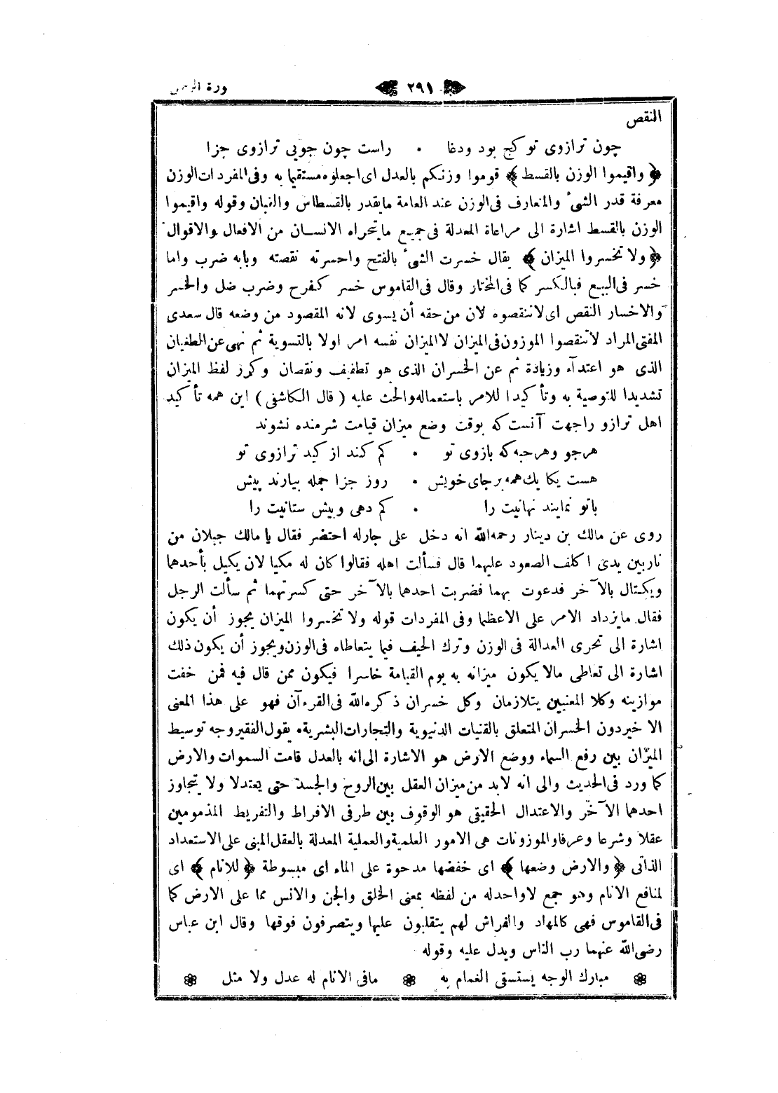 وَأَقِيمُوا الْوَزْنَ بِالْقِسْطِ قوموا وزنكم بالعدل اى اجعلوه مستقيما به وفي المفردات الوزن معرفة قدر الشيء والمتعارف في الوزن عند العامة ما يقدر بالقسطاس والقبان وقوله واقيموا الوزن بالقسط اشارة الى مراعاة المعدلة في جميع ما يتحراه الإنسان من الافعال والأقوال وَلا تُخْسِرُوا الْمِيزانَ يقال خسرت الشيء بالفتح وأخسرته نقصته وبابه ضرب واما خسر في البيع فبالكسر كما في المختار وقال في القاموس خسر كفرح وضرب ضل والخسر والاخسار النقص اى لا تنقصوه لان من حقه أن يسوى لانه المقصود من وضعه قال سعدى المفتى المراد لا تنقصوا الموزون في الميزان لا الميزان نفسه امر اولا بالتسوية ثم نهى عن الطغيان الذي هو اعتداء وزيادة ثم عن الخسران الذي هو تطفيف ونقصان وكرر لفظ الميزان تشديدا للتوصية به وتأكيدا للامر باستعماله والحث عليه (قال الكاشفى) اين همه تأكيد اهل ترازو را جهت آنست كه بوقت وضع ميزان قيامت شرمنده نشوند