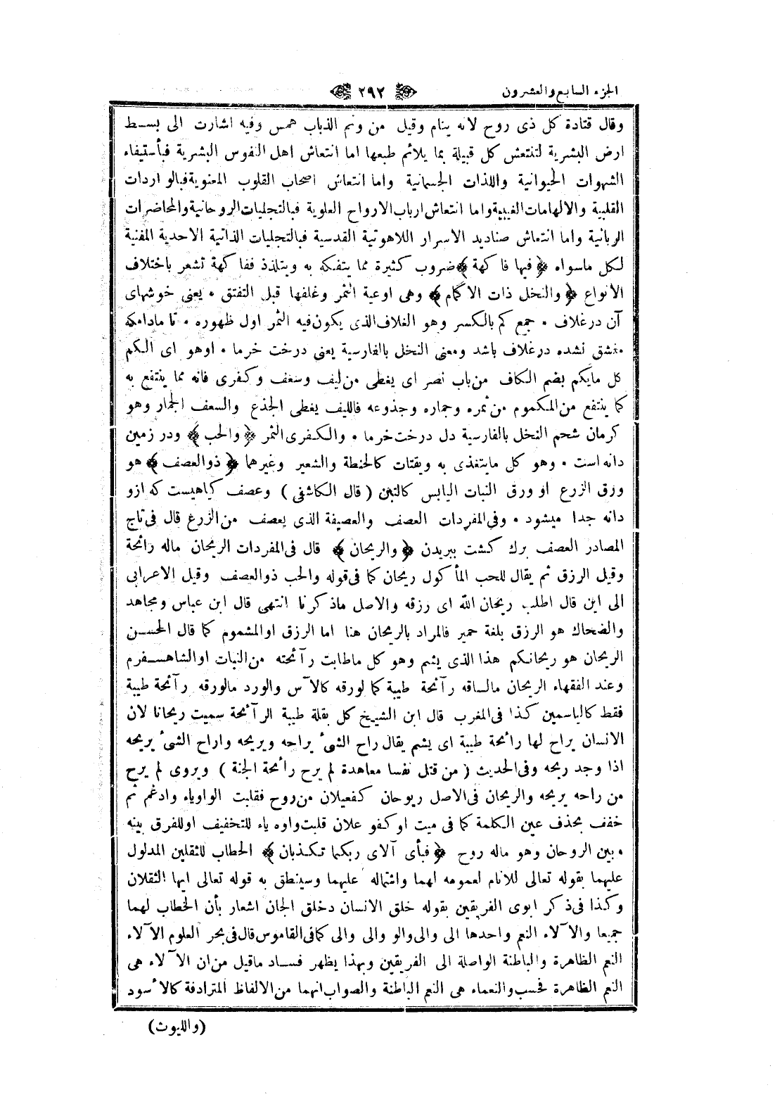 وقال قتادة كل ذى روح لانه ينام وقيل من ونم الذباب همس وفيه اشارت الى بسط ارض البشرية لتنتعش كل قبيلة بما يلائم طبعها اما انتعاش اهل النفوس البشرية فبأستيفاء الشهوات الحيوانية واللذات الجسمانية واما انتعاش اصحاب القلوب المعنوية فبالوا إرادات القلبية والإلهامات الغيبية واما انتعاش ارباب الأرواح العلوية فبالتجليات الروحانية والمحاضرات الربانية واما انتعاش صناديد الاسرار اللاهوتية القدسية فبالتجليات الذاتية الاحدية المفنية لكل ما سواه فِيها فاكِهَةٌ ضروب كثيرة مما يتفكه به ويتلذذ ففاكهة تشعر باختلاف الأنواع وَالنَّخْلُ ذاتُ الْأَكْمامِ وهى اوعية الثمر وغلفها قبل التفتق يعنى خوشهاى آن در غلاف جمع كم بالكسر وهو الغلاف الذي يكون فيه الثمر أول ظهوره تا مادامكه مغشق نشده در غلاف باشد ومعنى النخل بالفارسية يعنى درخت خرما او هو اى الكم كل ما يكم بضم الكاف من باب نصر اى يغطى من ليف وسعف وكفرى فانه مما ينتفع به كما ينتفع من المكموم من ثمره وجماره وجذوعه فالليف يغطى الجذع والسعف الجمار وهو كرمان شحم النخل بالفارسية دل درخت خرما والكفرى الثمر وَالْحَبُّ ودر زمين دانه است وهو كل ما يتغذى به ويقتات كالحنطة والشعير وغيرهما ذُو الْعَصْفِ هو ورق الزرع او ورق النبات اليابس كالتبن (قال الكاشفى) وعصف كياهيست كه ازو دانه جدا ميشود وفي المفردات العصف والعصيفة الذي يعصف من الزرع قال في تاج المصادر العصف برك كشت ببريدن وَالرَّيْحانُ قال في المفردات الريحان ماله رائحة وقيل الرزق ثم يقال للحب المأكول ريحان كما في قوله والحب ذو العصف وقيل الاعرابى الى اين قال اطلب ريحان الله اى رزقه والأصل ما ذكرنا انتهى قال ابن عباس ومجاهد والضحاك هو الرزق بلغة حمير فالمراد بالريحان هنا اما الرزق او المشموم كما قال الحسن الريحان هو ريحانكم هذا الذي يشم وهو كل ما طابت رائحته من النبات او الشاهسفرم وعند الفقهاء الريحان مالساقه رائحة طيبة كما لورقه كالآس والورد مالورقه رائحة طيبة فقط كالياسمين كذا في المغرب قال ابن الشيخ كل بقلة طيبة الرائحة سميت ريحانا لان الإنسان يراح لها رائحة طيبة اى يشم يقال راح الشيء يراحه ويرحه وأراح الشيء يريحه إذا وجد ريحه وفي الحديث (من قتل نفسا معاهدة لم يرح رائحة الجنة) ويروى لم يرح من راحه يريحه والريحان في الأصل ريوحان كفعيلان من روح فقلبت الواو ياء وادغم ثم خفف بحذف عين الكلمة كما في ميت او كفو علان قلبت واوه ياء للتخفيف او للفرق بينه وبين الروحان وهو ماله روح فَبِأَيِّ آلاءِ رَبِّكُما تُكَذِّبانِ الحطاب للثقلين المدلول عليهما بقوله تعالى للانام لعمومه لهما واشتماله عليهما وسينطق به قوله تعالى ايها الثقلان وكذا في ذكر أبوي الفريقين بقوله خلق الإنسان وخلق الجان اشعار بأن الخطاب لهما جميعا والآلاء النعم واحدها الى والى والو والى والى كما في القاموس قال في بحر العلوم الآلاء النعم الظاهرة والباطنة الواصلة الى الفريقين وبهذا يظهر فساد ما قيل من ان الآلاء هى النعم الظاهرة فحسب والنعماء هى النعم الباطنة والصواب انهما من الألفاظ المترادفة كالأسود
