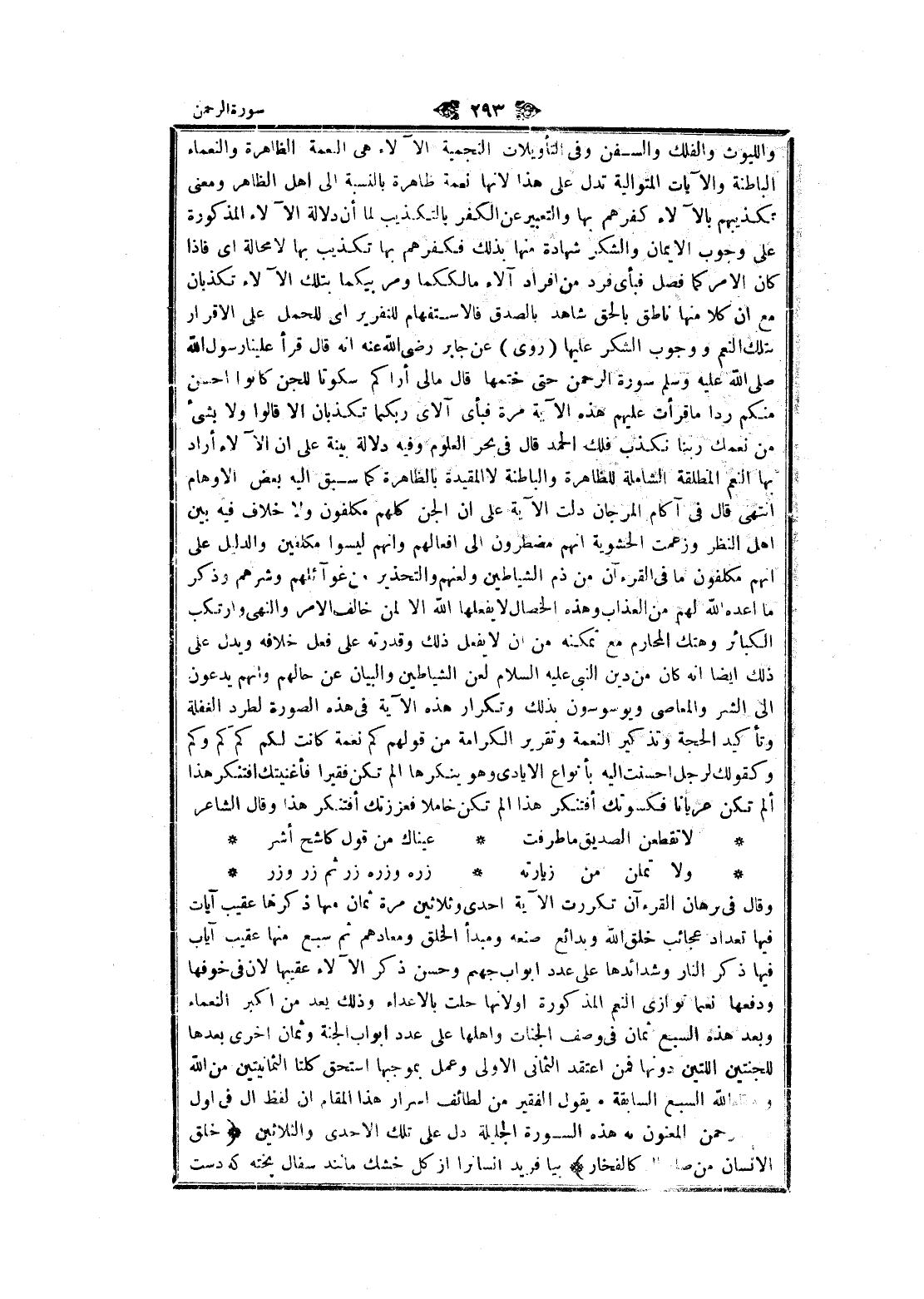 وقال في برهان القرآن تكررت الآية احدى وثلاثين مرة ثمان منها ذكرها عقيب آيات فيها تعداد عجائب خلق الله وبدائع صنعه ومبدأ الخلق ومعادهم ثم سبع منها عقيب آياب فيها ذكر النار وشدائدها على عدد أبواب جهنم وحسن ذكر الآلاء عقيبها لان في خوفها ودفعها نعما توازى النعم المذكورة أو لأنها حلت بالأعداء وذلك يعد من اكبر النعماء وبعد هذه السبع ثمان في وصف الجنات وأهلها على عدد أبواب الجنة وثمان اخرى بعدها للجنتين اللتين دونها فمن اعتقد الثماني الاولى وعمل بموجبها استحق كلتا الثمانيتين من الله ووقاه الله السبع السابقة يقول الفقير من لطائف اسرار هذا المقام ان لفظ ال في أول اسم الرحمن المعنون به هذه السورة الجليلة دل على تلك الاحدى والثلاثين خَلَقَ الْإِنْسانَ مِنْ صَلْصالٍ كَالْفَخَّارِ بيافريد انسان را از كل خشك مانند سفال پخته كه دست