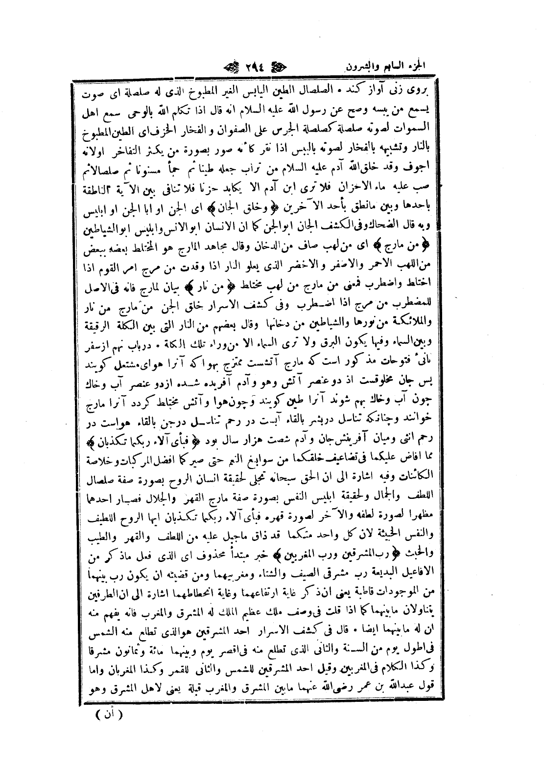يروى زنى آواز كند الصلصال الطين اليابس الغير المطبوخ الذي له صلصلة اى صوت يسمع من يبسه وصح عن رسول الله عليه السلام انه قال إذا تكلم الله بالوحى سمع اهل السموات لصوته صلصلة كصلصلة الجرس على الصفوان والفخار الخزف اى الطين المطبوخ بالنار وتشبيهه بالفخار لصوته باليبس إذا نقر كأنه صور بصورة من يكثر التفاخر أو لأنه أجوف وقد خلق الله آدم عليه السلام من تراب جعله طينا ثم جمأ مسنونا ثم صلصالا ثم صب عليه ماء الأحزان فلا ترى ابن آدم الا يكابد حزنا فلا تنافى بين الآية الناطقة بأحدها وبين ما نطق بأحد الآخرين وَخَلَقَ الْجَانَّ اى الجن او أبا الجن او إبليس وبه قال الضحاك وفي الكشف الجان ابو الجن كما ان الإنسان ابو الانس وإبليس ابو الشياطين مِنْ مارِجٍ اى من لهب صاف من الدخان وقال مجاهد المارج هو المختلط بعضه ببعض من اللهب الأحمر والأصفر والأخضر الذي يعلو النار إذا وقدت من مرج امر القوم إذا اختلط واضطرب فمعنى من مارج من لهب مختلط مِنْ نارٍ بيان لمارج فانه في الأصل للمضطرب من مرج إذا اضطرب وفي كشف الاسرار خلق الجن من مارج من نار والملائكة من نورها والشياطين من دخانها وقال بعضهم من النار التي بين الكلة الرقيقة وبين السماء وفيها يكون البرق ولا ترى السماء الا من وراء تلك الكلة در باب نهم از سفر نانئ فتوحات مذكور است كه مارج آتشست ممتزج بهوا كه آنرا هواى مشتعل كويند پس جان مخلوقست إذ دو عنصر آتش وهو وآدم آفريده شده از دو عنصر آب وخاك چون آب وخاك بهم شوند آنرا طين كويند و چون هوا وآتش مختلط كردد آنرا مارج خوانند و چنانكه تناسل در بشر بإلقاء آبست در رحم تناسل در جن بإلقاء هواست در رحم أنثى وميان آفرينش جان وآدم شصت هزار سال بود فَبِأَيِّ آلاءِ رَبِّكُما تُكَذِّبانِ مما أفاض عليكما في تضاعيف خلقكما من سوابغ النعم حتى صيركما أفضل المركبات وخلاصة الكائنات وفيه اشارة الى ان الحق سبحانه تجلى لحقيقة انسان الروح بصورة صفة صلصال اللطف والجمال ولحقيقة إبليس النفس بصورة صفة مارج القهر والجلال فصار أحدهما مظهرا لصورة لطفه والآخر لصورة قهره فبأى آلاء ربكما تكذبان ايها الروح اللطيف والنفس الخبيثة لان كل واحد منكما قد ذاق ما جبل عليه من اللطف والقهر والطيب والخبث رَبُّ الْمَشْرِقَيْنِ وَرَبُّ الْمَغْرِبَيْنِ خبر مبتدأ محذوف اى الذي فعل ما ذكر من الأفاعيل البديعة رب مشرقى الصيف والشتاء ومغربيهما ومن قضيته ان يكون رب بينهما من الموجودات قاطبة يعنى ان ذكر غاية ارتفاعهما وغاية انحطاطهما اشارة الى ان الطرفين يتناولان ما بينهما كما إذا قلت في وصف ملك عظيم الملك له المشرق والمغرب فانه يفهم منه ان له ما بينهما ايضا قال في كشف الاسرار أحد المشرقين هو الذي تطلع منه الشمس فى أطول يوم من السنة والثاني الذي تطلع منه في اقصر يوم وبينهما مائة وثمانون مشرقا وكذا الكلام في المغربين وقيل أحد المشرقين للشمس والثاني للقمر وكذا المغربان واما قول عبد الله بن عمر رضى الله عنهما ما بين المشرق والمغرب قبلة يعنى لاهل المشرق وهو