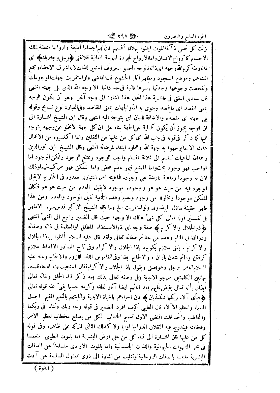 نزلت كل نفس ذائقة الموت أيقنوا بهلاك أنفسهم فان لهم أجساما لطيفة وأرواحا متعلقة بتلك الأجسام كأرواح الإنسان واما الأرواح المجردة المهيمة العالية فلا تفنى وَيَبْقى وَجْهُ رَبِّكَ اى ذاته ومنه كرم الله وجهه اى ذاته فالوجه العضو المعروف استعير للذات لانه اشرف الأعضاء ومجمع المشاعر وموضع السجود ومظهر آثار الخشوع قال القاضي ولو استقريت جهات الموجودات وتفحصت وجوهها وجدتها بأسرها فانية في حد ذاتها الا وجه الله الذي يلى جهته انتهى قال سعدى المفتى في حاشية هذا المحل هذا اشارة الى وجه آخر وهو أن يكون الوجه بمعنى القصد اى ما يقصد وينوى به الله والجهات بمعنى المقاصد وفي العبارة نوع تسامح وقوله يلى جهته اى مقصده والاضافة للبيان اى يتوجه اليه انتهى وقال ابن الشيخ اشارة الى ان الوجه يجوز أن يكون كناية عن الجهة بناء على ان كل جهة لا تخلو عن وجهه يتوجه إليها كما ذكر في قوله في جنب الله اى كل من عليها من الثقلين واما اكتسبوه من الأعمال هالك الا ما توجهوا به جهة الله وعملوه ابتغاء لمرضاته انتهى وقال الشيخ ابن نور الدين رحمه الله الماهيات تنقسم الى ثلاثة اقسام واجب الوجود وممتنع الوجود وممكن الوجود اما الواجب فهو وجود بحت واما الممتنع فهو عدم محض واما الممكن فهو مركب منهما وذلك لان له وجودا وماهية عارضة على وجوده فماهيته امر اعتباري معدوم في الخارج لا يقبل الوجود فيه من حيث هو هو ووجوده موجود لا يقبل العدم من حيث هو هو فكان الممكن موجودا ومخلوقا من وجود وعدم وهذه الجمعية تقبل الوجود والعدم ومن هذا ظهر حقيقة ما قال البيضاوي ولو استقريت إلخ وما قاله الشيخ الأكبر قدس سره الأطهر فى تفسير قوله تعالى كل شيء هالك الا وجهه حيث قال الضمير راجع الى الشيء انتهى ذُو الْجَلالِ وَالْإِكْرامِ صفة وجه اى ذو الاستغناء المطلق او العظمة في ذاته وصفاته وذو الفضل التام وهذه من عظائم صفاته تعالى ولقد قال عليه السلام ألظوا بيا ذا الجلال ولاكرام يعنى ملازم بگوييد يا ذا الجلال والإكرام وفي تاج المصادر الالظاظ ملازم كرفتن ودائم شدن باران والإلحاح ايضا وفي القاموس اللظ اللزوم والإلحاح وعنه عليه السلام انه مر برجل وهو يصلى ويقول يا ذا الجلال والإكرام فقال استجيب لك الدعاء فالدعاء بهاتين الكلمتين مرجو الاجابة وفي وصفه تعالى بذلك بعد ذكر فناء الخلق وبقائه تعالى إيذان بأنه تعالى يفيض عليهم بعد فنائهم ايضا آثار لطفه وكرمه حسبما ينبئ عنه قوله تعالى فَبِأَيِّ آلاءِ رَبِّكُما تُكَذِّبانِ فان احياءهم بالحياة الابدية واثابتهم بالنعيم المقيم أجل النعماء وأعظم الآلاء قال الطيبي كيف أفرد الضمير في قوله وجه ربك وثناه في ربكما والمخاطب واحد قلت اقتضى الاول تعميم الخطاب لكل من يصلح للخطاب لعظم الأمر وفخامته فيندرج فيه الثقلان اندراجا أوليا ولا كذلك الثاني فتركه على ظاهره وفي قوله كل من عليها فان اشارة الى فناء كل من على ارض البشرية اما بالموت الطبيعي منغمسا فى بحر الشهوات الحيوانية واللذات الجسمانية واما بالموت الإرادي منسلخا عن الصفات البشرية ملتبسا بالصفات الروحانية وتغليب من اشارة الى ذوى العقول السليمة عن آفات