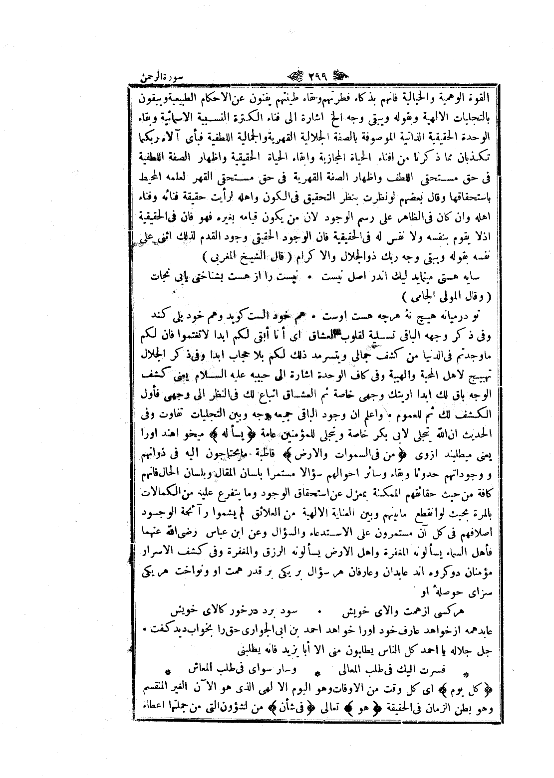 القوة الوهمية والخيالية فانهم بذكاء فطرتهم وبقاء طينتهم يفنون عن الاحكام الطبيعية ويبقون بالتجليات الالهية وبقوله ويبقى وجه إلخ اشارة الى فناء الكثرة النسبية الاسمائية وبقاء الوحدة الحقيقية الذاتية الموصوفة بالصفة الجلالية القهرية والجمالية اللطفية فبأى آلاء ربكما تكذبان مما ذكرنا من إفناء الحياة المجازية وابقاء الحياة الحقيقية واظهار الصفة اللطفية فى حق مستحقى اللطف واظهار الصفة القهرية في حق مستحقى القهر لعلمه المحيط باستحقاقها وقال بعضهم لو نظرت بنظر التحقيق في الكون واهله لرأيت حقيقة فنائه وفناء اهله وان كان في الظاهر على رسم الوجود لان من يكون قيامه بغيره فهو فان في الحقيقية إذ لا يقوم بنفسه ولا نفس له في الحقيقية فان الوجود الحقيقي وجود القدم لذلك اثنى على نفسه بقوله ويبقى وجه ربك ذو الجلال والإكرام (قال الشيخ المغربي)