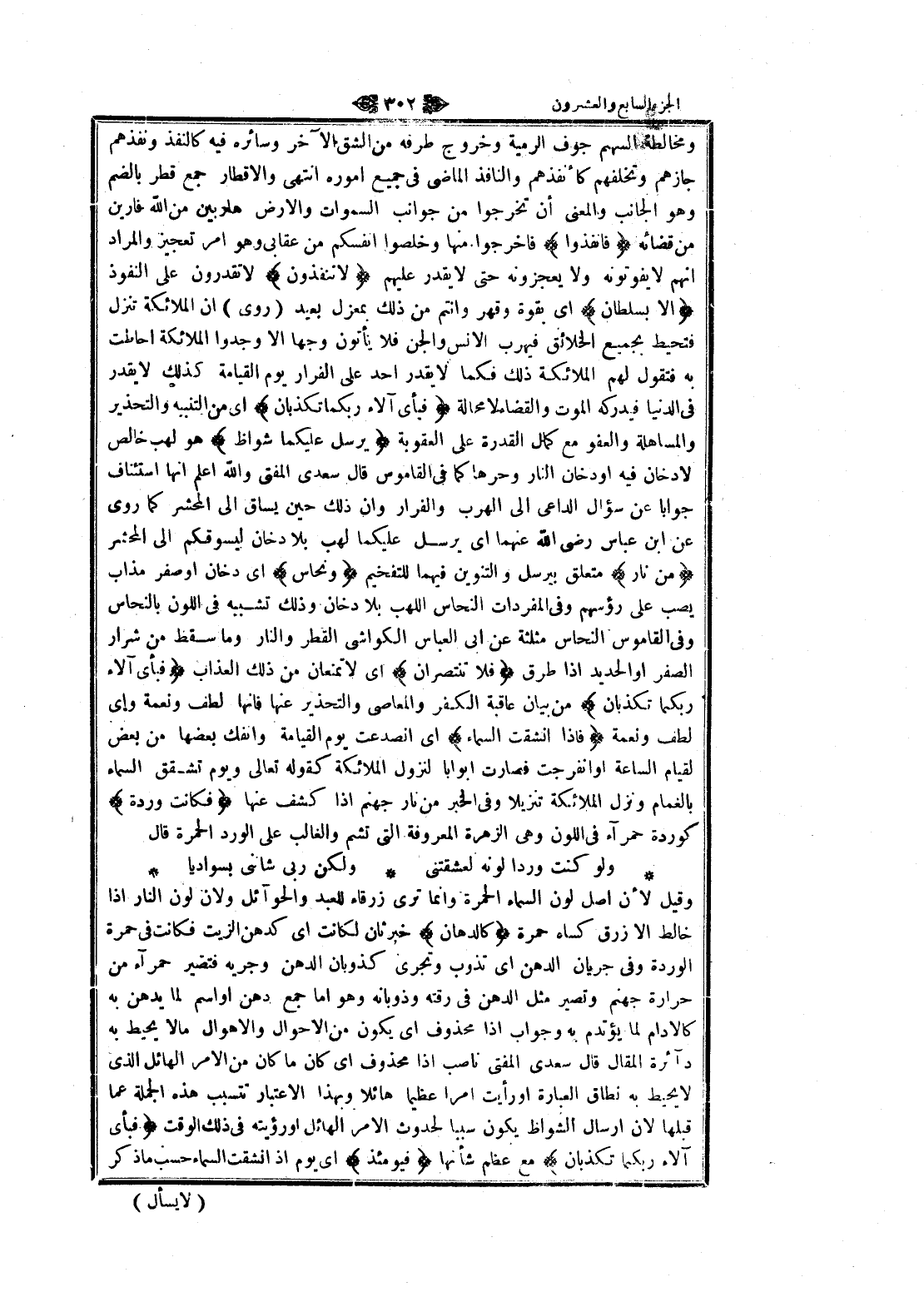 ومخالطة السهم جوف الرمية وخروج طرفه من الشق الآخر وسائره فيه كالنفذ ونفذهم جازهم وتخلفهم كأنفذهم والنافذ الماضي في جميع أموره انتهى والأقطار جمع قطر بالضم وهو الجانب والمعنى أن تخرجوا من جوانب السموات والأرض هاربين من الله فارين من قضائه فَانْفُذُوا فاخرجوا منها وخلصوا أنفسكم من عقابى وهو امر تعجيز والمراد انهم لا يفوتونه ولا يعجزونه حتى لا يقدر عليهم لا تَنْفُذُونَ لا تقدرون على النفوذ إِلَّا بِسُلْطانٍ اى بقوة وقهر وأنتم من ذلك بمعزل بعيد (روى) ان الملائكة تنزل فتحيط بجميع الخلائق فيهرب الانس والجن فلا يأتون وجها الا وجدوا الملائكة أحاطت به فتقول لهم الملائكة ذلك فكما لا يقدر أحد على الفرار يوم القيامة كذلك لا يقدر فى الدنيا فيدركه الموت والقضاء لا محالة فَبِأَيِّ آلاءِ رَبِّكُما تُكَذِّبانِ اى من التنبيه والتحذير والمساهلة والعفو مع كمال القدرة على العقوبة يُرْسَلُ عَلَيْكُما شُواظٌ هو لهب خالص لا دخان فيه او دخان النار وحرها كما في القاموس قال سعدى المفتى والله اعلم انها استئناف جوابا عن سؤال الداعي الى الهرب والفرار وان ذلك حين يساق الى المحشر كما روى عن ابن عباس رضى الله عنهما اى يرسل عليكما لهب بلا دخان ليسوقكم الى المحشر مِنْ نارٍ متعلق بيرسل والتنوين فيهما للتفخيم وَنُحاسٌ اى دخان او صفر مذاب يصب على رؤسهم وفي المفردات النحاس اللهب بلا دخان وذلك تشبيه في اللون بالنحاس وفي القاموس النحاس مثلثة عن ابى العباس الكواشي القطر والنار وما سقط من شرار الصفر او الحديد إذا طرق فَلا تَنْتَصِرانِ اى لا تمنعان من ذلك العذاب فَبِأَيِّ آلاءِ رَبِّكُما تُكَذِّبانِ من بيان عاقبة الكفر والمعاصي والتحذير عنها فانها لطف ونعمة واى لطف ونعمة فَإِذَا انْشَقَّتِ السَّماءُ اى انصدعت يوم القيامة وانفك بعضها من بعض لقيام الساعة او انفرجت فصارت أبوابا لنزول الملائكة كقوله تعالى ويوم تشقق السماء بالغمام ونزل الملائكة تنزيلا وفي الخبر من نار جهنم إذا كشف عنها فَكانَتْ وَرْدَةً كوردة حمراء في اللون وهى الزهرة المعروفة التي تشم والغالب على الورد الحمرة قال