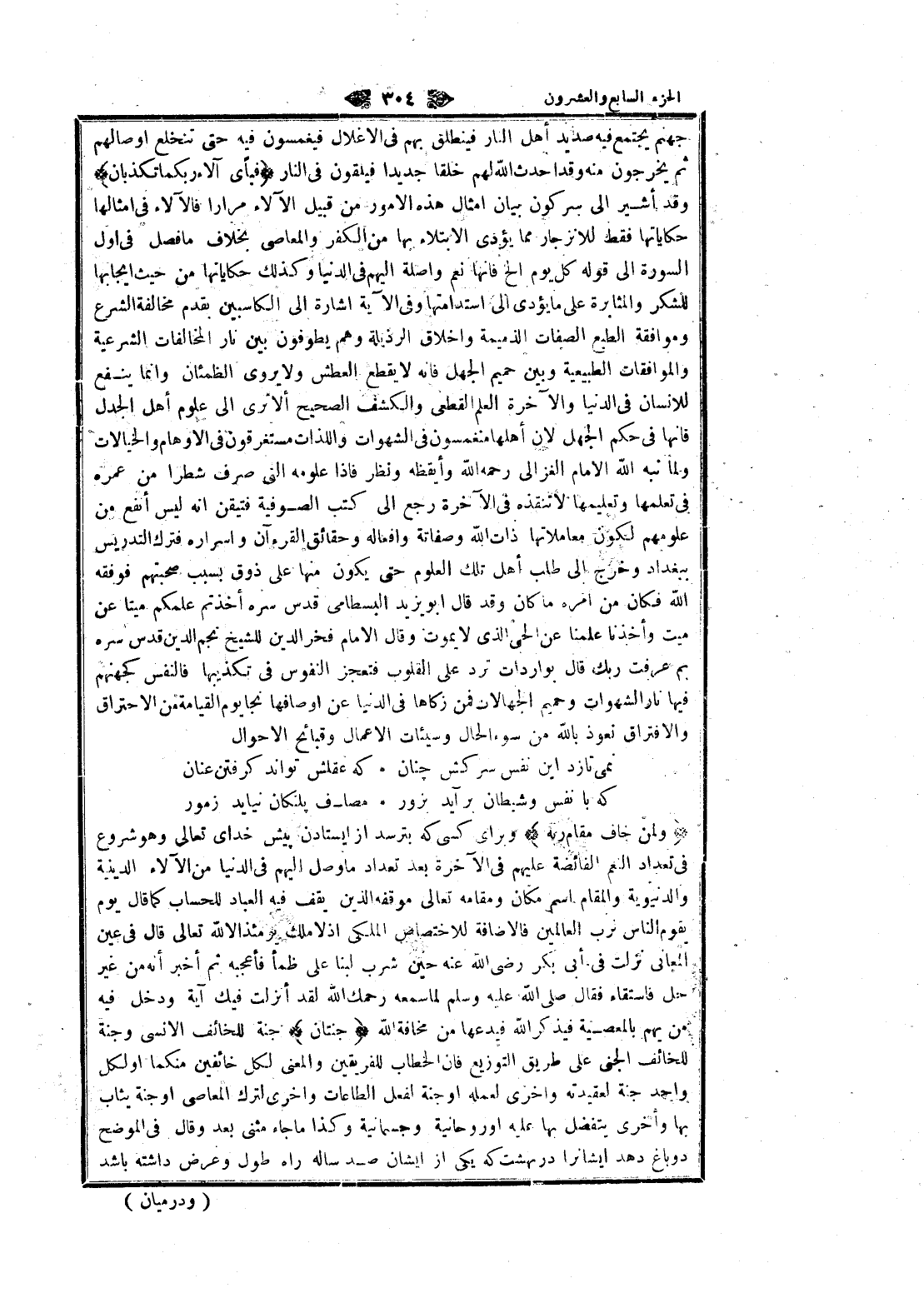 جهنم يجتمع فيه صديد أهل النار فينطلق بهم في الاغلال فيغمسون فيه حتى تنخلع او صالهم ثم يخرجون منه وقد أحدث الله لهم خلقا جديدا فيلقون في النار فَبِأَيِّ آلاءِ رَبِّكُما تُكَذِّبانِ وقد أشير الى سركون بيان أمثال هذه الأمور من قبيل الآلاء مرارا فالآلاء في أمثالها حكاياتها فقط للانزجار مما يؤدى الابتلاء بها من الكفر والمعاصي بخلاف ما فصل في أول السورة الى قوله كل يوم إلخ فانها نعم واصلة إليهم في الدنيا وكذلك حكاياتها من حيث إيجابها للشكر والمثابرة على ما يؤدى الى استدامتها وفي الآية اشارة الى الكاسبين بقدم مخالفة الشرع وموافقة الطبع الصفات الذميمة واخلاق الرذيلة وهم يطوفون بين نار المخالفات الشرعية والموافقات الطبيعية وبين حميم الجهل فانه لا يقطع العطش ولا يروى الظمآن وانما ينفع للانسان في الدنيا والآخرة العلم القطعي والكشف الصحيح ألا ترى الى علوم أهل الجدل فانها في حكم الجهل لان أهلها منغمسون في الشهوات واللذات مستغرقون في الأوهام والخيالات ولما نبه الله الامام الغزالي رحمه الله وأيقظه ونظر فاذا علومه التي صرف شطرا من عمره فى تعلمها وتعليمها لا تنقذه في الآخرة رجع الى كتب الصوفية فتيقن انه ليس أنفع من علومهم لكون معاملاتها ذات الله وصفاته وأفعاله وحقائق القرآن وأسراره فترك التدريس ببغداد وخرج الى طلب أهل تلك العلوم حتى يكون منها على ذوق بسبب صحبتهم فوفقه الله فكان من امره ما كان وقد قال ابو يزيد البسطامي قدس سره أخذتم علمكم ميتا عن ميت وأخذنا علمنا عن الحي الذي لا يموت وقال الامام فخر الدين للشيخ نجم الدين قدس سره بم عرفت ربك قال بواردات ترد على القلوب فتعجز النفوس في تكذيبها فالنفس كجهنهم فيها نار الشهوات وحميم الجهالات فمن زكاها في الدنيا عن أوصافها نجا يوم القيامة من الاحتراق والافتراق نعوذ بالله من سوء الحال وسيئات الأعمال وقبائح الأحوال