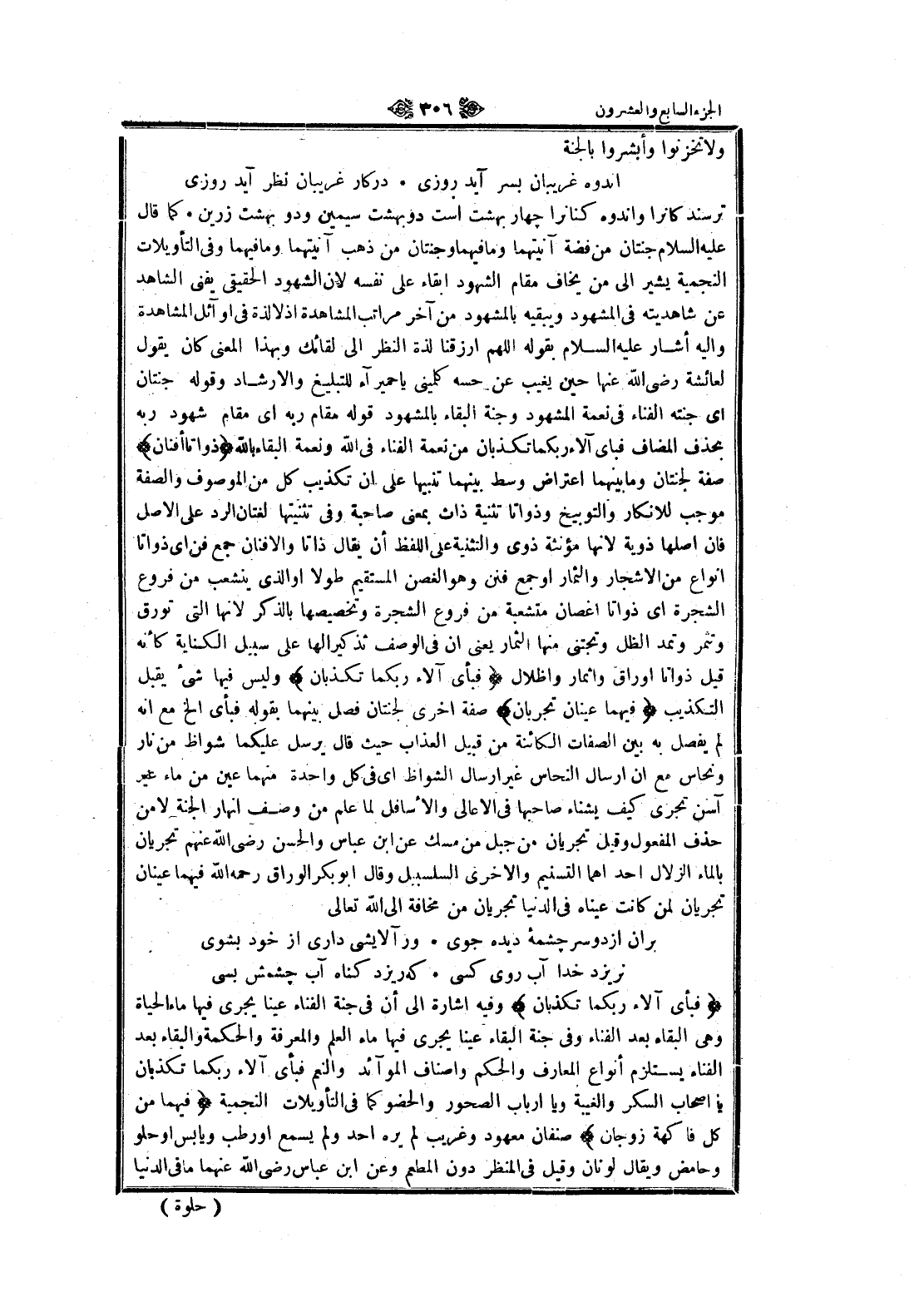 ترسند كانرا واندوه كنانرا چهار بهشت است دو بهشت سيمين ودو بهشت زرين كما قال عليه السلام جنتان من فضة آنيتهما وما فيهما وجنتان من ذهب آنيتهما وما فيهما وفي التأويلات النجمية يشير الى من يخاف مقام الشهود ابقاء على نفسه لان الشهود الحقيقي يفنى الشاهد عن شاهديته في المشهود ويبقيه بالمشهود من آخر مراتب المشاهدة إذ لا لذة في أوائل المشاهدة واليه أشار عليه السلام بقوله اللهم ارزقنا لذة النظر الى لقائك وبهذا المعنى كان يقول لعائشة رضى الله عنها حين يغيب عن حسه كلمينى يا حميراء للتبليغ والإرشاد وقوله جنتان اى جنته الفناء في نعمة المشهود وجنة البقاء بالمشهود قوله مقام ربه اى مقام شهود ربه بحذف المضاف فباى آلاء ربكما تكذبان من نعمة الفناء في الله ونعمة البقاء بالله ذَواتا أَفْنانٍ صفة لجنتان وما بينهما اعتراض وسط بينهما تنبيها على ان تكذيب كل من الموصوف والصفة موجب للانكار والتوبيخ وذواتا تثنية ذات بمعنى صاحبة وفي تثنيتها لغتان الرد على الأصل فان أصلها ذوية لانها مؤنثة ذوى والتثنية على اللفظ أن يقال ذاتا والأفنان جمع فن اى ذواتا انواع من الأشجار والثمار او جمع فنن وهو الغصن المستقيم طولا او الذي ينشعب من فروع الشجرة اى ذواتا أغصان متشعبة من فروع الشجرة وتخصيصها بالذكر لانها التي تورق وتثمر وتمد الظل وتجتنى منها الثمار يعنى ان في الوصف تذكيرا لها على سبيل الكناية كأنه قيل ذواتا أوراق واثمار واظلال فَبِأَيِّ آلاءِ رَبِّكُما تُكَذِّبانِ وليس فيها شيء يقبل التكذيب فِيهِما عَيْنانِ تَجْرِيانِ صفة اخرى لجنتان فصل بينهما بقوله فبأى إلخ مع انه لم يفصل به بين الصفات الكائنة من قبيل العذاب حيث قال يرسل عليكما شواظ من نار ونحاس مع ان إرسال النحاس غير إرسال الشواظ اى في كل واحدة منهما عين من ماء غير آسن تجرى كيف يشناء صاحبها في الأعالي والأسافل لما علم من وصف انهار الجنة لا من حذف المفعول وقيل تجريان من جبل من مسك عن ابن عباس والحسن رضى الله عنهم تجريان بالماء الزلال إحداهما التسنيم والاخرى السلسبيل وقال ابو بكر الوراق رحمه الله فيهما عينان تجريان لمن كانت عيناه في الدنيا تجريان من مخافة الى الله تعالى
