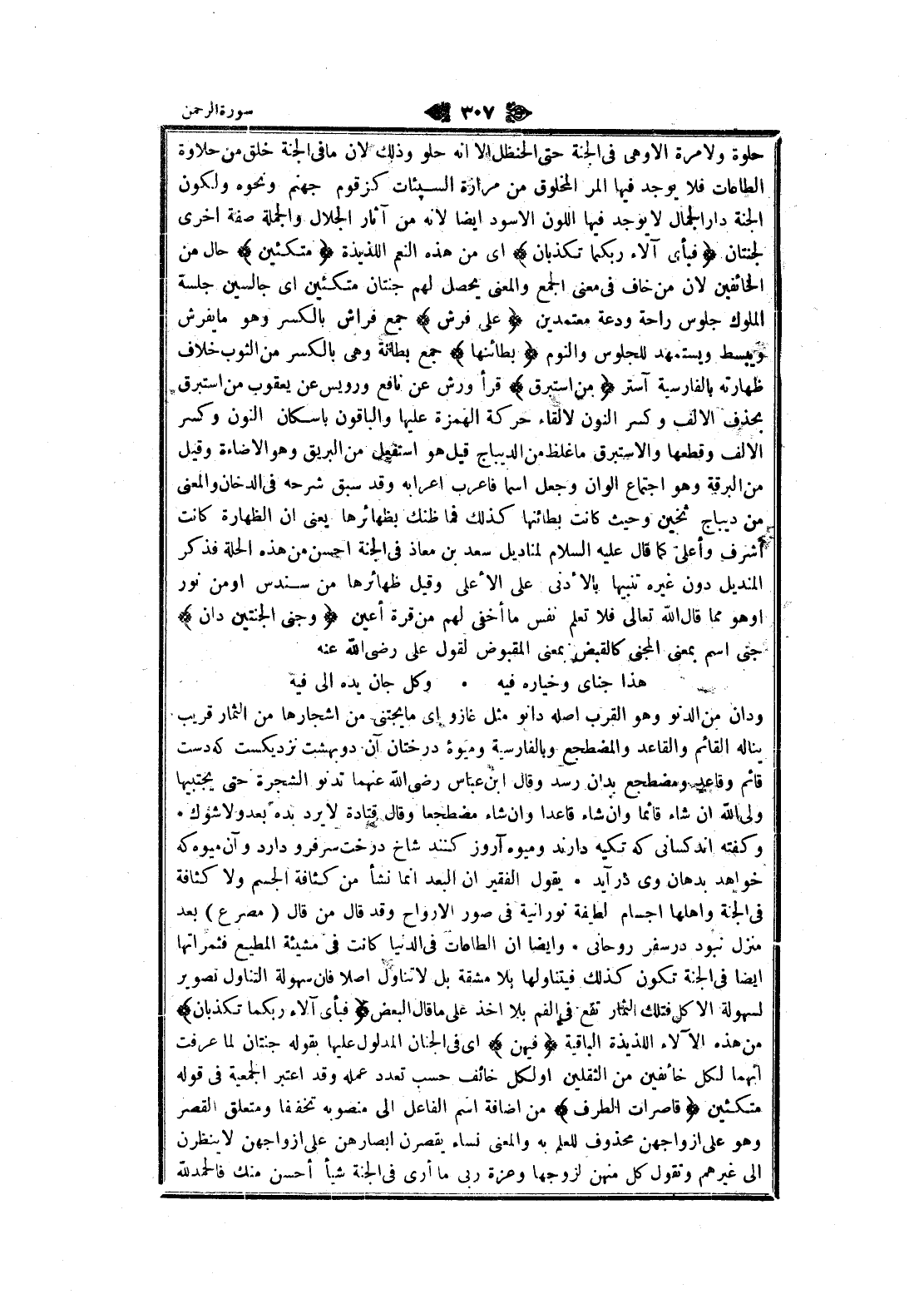 حلوة ولا مرة الا وهى في الجنة حتى الحنظل الا انه حلو وذلك لان ما في الجنة خلق من حلاوة الطاعات فلا يوجد فيها المر المخلوق من مرارة السيئات كزقوم جهنم ونحوه ولكون الجنة دار الجمال لا يوجد فيها اللون الأسود ايضا لانه من آثار الجلال والجملة صفة اخرى لجنتان فَبِأَيِّ آلاءِ رَبِّكُما تُكَذِّبانِ اى من هذه النعم اللذيذة مُتَّكِئِينَ حال من الخائفين لان من خاف في معنى الجمع والمعنى يحصل لهم جنتان متكئين اى جالسين جلسة الملوك جلوس راحة ودعة معتمدين عَلى فُرُشٍ جمع فراش بالكسر وهو ما يفرش ويبسط ويستمهد للجلوس والنوم بَطائِنُها جمع بطانة وهى بالكسر من الثوب خلاف ظهارته بالفارسية آستر مِنْ إِسْتَبْرَقٍ قرأ ورش عن نافع ورويس عن يعقوب من إستبرق بحذف الالف وكسر النون لالقاء حركة الهمزة عليها والباقون بإسكان النون وكسر الالف وقطعها والإستبرق ما غلظ من الديباج قيل هو استفعل من البريق وهو الاضاءة وقيل من البرقة وهو اجتماع ألوان وجعل اسما فاعرب إعرابه وقد سبق شرحه في الدخان والمعنى من ديباج ثخين وحيث كانت بطائنها كذلك فما ظنك بظهائرها يعنى ان الظهارة كانت أشرف وأعلى كما قال عليه السلام لمناديل سعد بن معاذ في الجنة احسن من هذه الحلة فذكر المنديل دون غيره تنبيها بالأدنى على الأعلى وقيل ظهائرها من سندس او من نور او هو مما قال الله تعالى فلا تعلم نفس ما أخفى لهم من قرة أعين وَجَنَى الْجَنَّتَيْنِ دانٍ جنى اسم بمعنى المجنى كالقبض بمعنى المقبوض لقول على رضى الله عنه