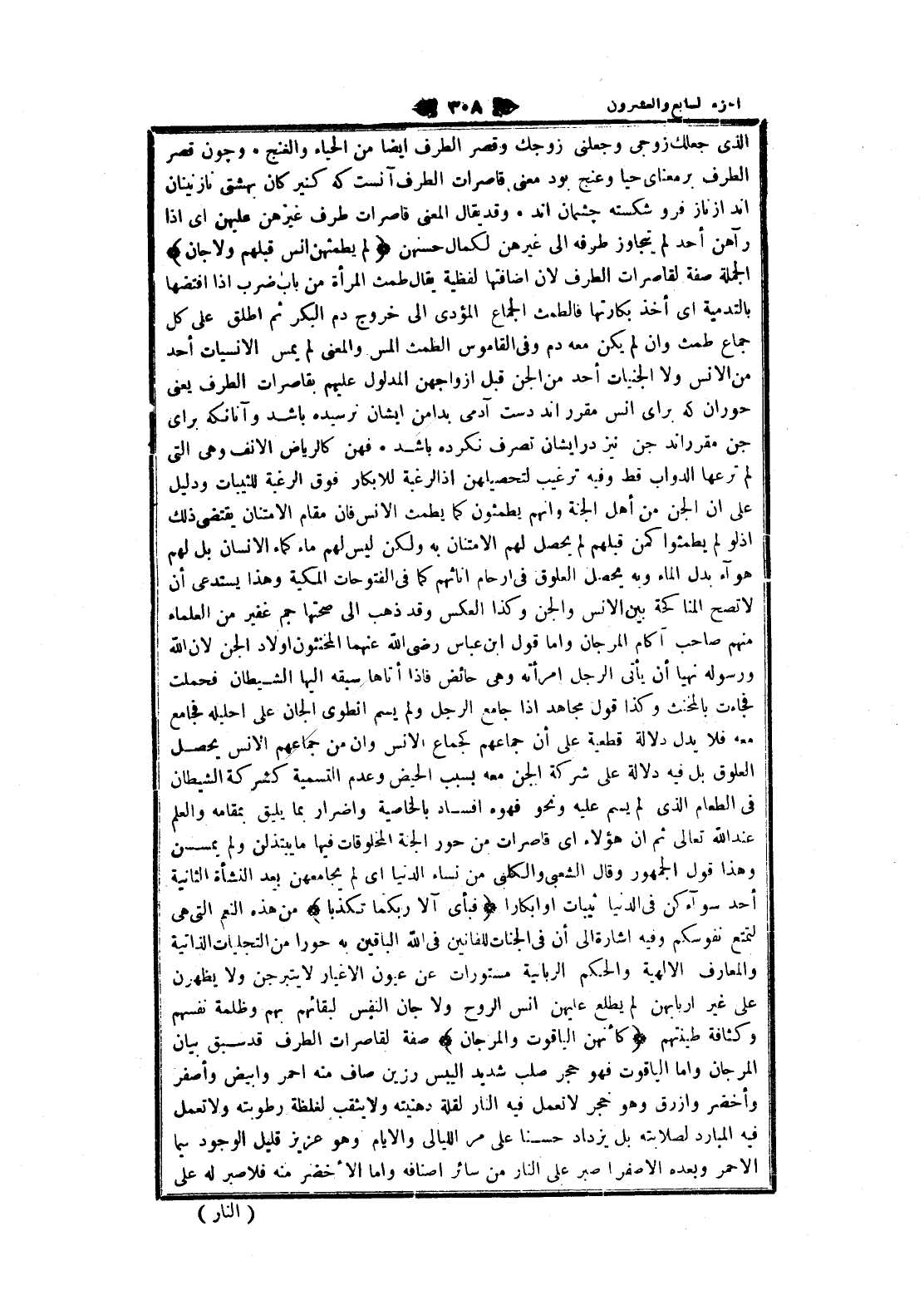 الذي جعلك زوجى وجعلنى زوجك وقصر الطرف ايضا من الحياء والغنج و چون قصر الطرف بر معناى حيا وعنج بود معنى قاصرات الطرف آنست كه كنيزكان بهشتى نازنينان اند از ناز فرو شكسته چشمان اند وقد يقال المعنى قاصرات طرف غيرهن عليهن اى إذا رآهن أحد لم يتجاوز طرفه الى غيرهن لكمال حسنهن لَمْ يَطْمِثْهُنَّ إِنْسٌ قَبْلَهُمْ وَلا جَانٌّ الجملة صفة لقاصرات الطرف لان اضافتها لفظية يقال طمث المرأة من باب ضرب إذا افتضها بالتدمية اى أخذ بكارتها فالطمث الجماع المؤدى الى خروج دم البكر ثم اطلق على كل جماع طمث وان لم يكن معه دم وفي القاموس الطمث المس والمعنى لم يمس الانسيات أحد من الانس ولا الجنيات أحد من الجن قبل أزواجهن المدلول عليهم بقاصرات الطرف يعنى حوران كه براى انس مقرراند دست آدمي بدامن ايشان نرسيده باشد وآنانكه براى جن مقرراند جن نيز در ايشان تصرف نكرده باشد فهن كالرياض الانف وهى التي لم ترعها الدواب قط وفيه ترغيب لتحصيلهن إذ الرغبة للابكار فوق الرغبة للثيبات ودليل على ان الجن من أهل الجنة وانهم يطمثون كما يطمث الانس فان مقام الامتنان يقتضى ذلك إذ لو لم يطمثوا كمن قبلهم لم يحصل لهم الامتنان به ولكن ليس لهم ماء كماء الإنسان بل لهم هواء بدل الماء وبه يحصل العلوق في أرحام إناثهم كما في الفتوحات المكية وهذا يستدعى أن لا تصح المناكحة بين الانس والجن وكذا العكس وقد ذهب الى صحتها جم غفير من العلماء منهم صاحب آكام المرجان واما قول ابن عباس رضى الله عنهما المخنثون أولاد الجن لان الله ورسوله نهيا أن يأتى الرجل امرأته وهى حائض فاذا أتاها سبقه إليها الشيطان فحملت فجاءت بالمخنث وكذا قول مجاهد إذا جامع الرجل ولم يسم انطوى الجان على إحليله فجامع معه فلا يدل دلالة قطعية على أن جماعهم كجماع الانس وان من جماعهم الانس يحصل العلوق بل فيه دلالة على شركة الجن معه بسبب الحيض وعدم التسمية كشركة الشيطان فى الطعام الذي لم يسم عليه ونحو فهوه إفساد بالخاصية وإضرار بما يليق بمقامه والعلم عند الله تعالى ثم ان هؤلاء اى قاصرات من حور الجنة المخلوقات فيها ما يبتذلن ولم يمسسن وهذا قول الجمهور وقال الشعبي والكلبي من نساء الدنيا اى لم يجامعهن بعد النشأة الثانية أحد سواءكن في الدنيا ثيبات او أبكارا فَبِأَيِّ آلاءِ رَبِّكُما تُكَذِّبانِ من هذه النعم التي هى لتمتع نفوسكم وفيه اشارة الى أن في الجنات للفانين في الله الباقين به حورا من التجليات الذاتية والمعارف الالهية والحكم الربانية مستورات عن عيون الأغيار لا يتبرجن ولا يظهرن على غير اربابهن لم يطلع عليهن انس الروح ولا جان النفس لبقائهم بهم وظلمة نفسهم وكثافة طينتهم كَأَنَّهُنَّ الْياقُوتُ وَالْمَرْجانُ صفة لقاصرات الطرف قد سبق بيان المرجان واما الياقوت فهو حجر صلب شديد اليبس رزين صاف منه احمر وابيض وأصفر وأخضر وازرق وهو حجر لا تعمل فيه النار لقلة دهنيته ولا يثقب لغلظة رطوبته ولا تعمل فيه المبارد لصلابته بل يزداد حسنا على مر الليالى والأيام وهو عزيز قليل الوجود سيما الأحمر وبعده الأصفر أصبر على النار من سائر اصنافه واما الأخضر منه فلاصبر له على