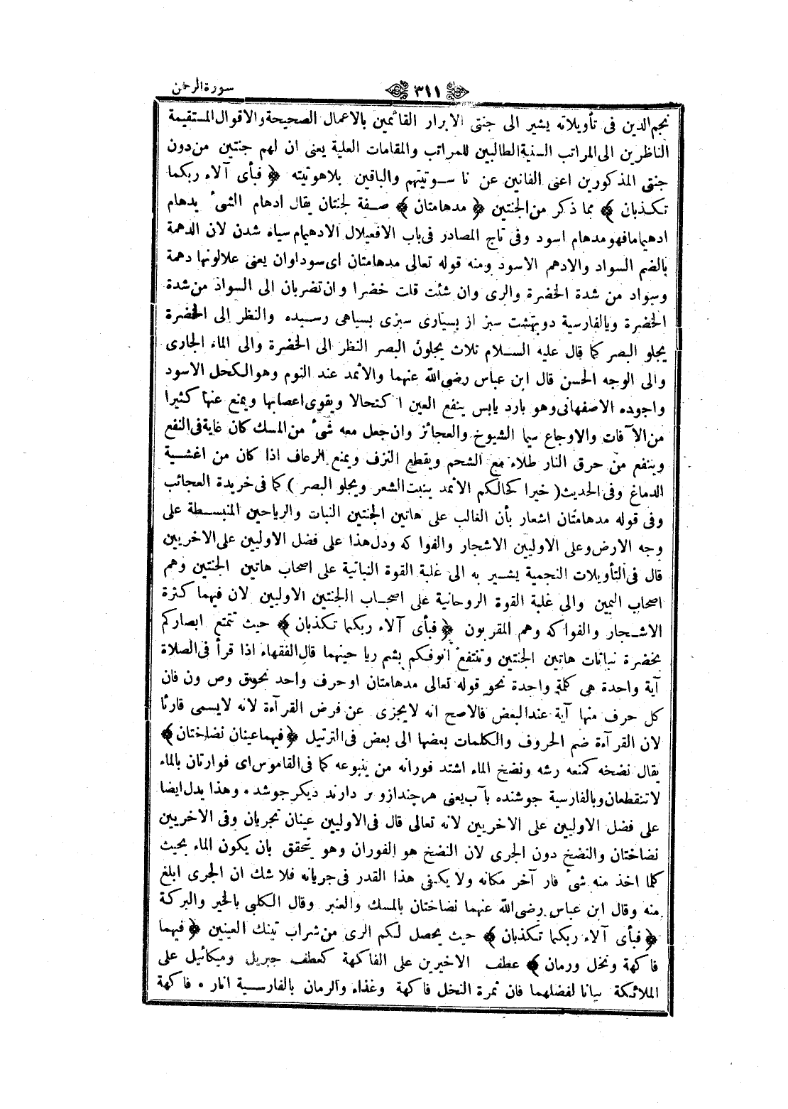نجم الدين في تأويلاته يشير الى جنتى الأبرار القائمين بالأعمال الصحيحة والأقوال المستقيمة الناظرين الى المراتب السنية الطالبين للمراتب والمقامات العلية يعنى ان لهم جنتين من دون جنتى المذكورين اعنى الفانين عن ناسوتيتهم والباقين بلا هو تيته فَبِأَيِّ آلاءِ رَبِّكُما تُكَذِّبانِ مما ذكر من الجنتين مُدْهامَّتانِ صفة لجنتان يقال ادهام الشيء يدهام ادهيماما فهو مدهام اسود وفي تاج المصادر في باب الافعيلال الادهيمام سياه شدن لان الدهمة بالضم السواد والأدهم الأسود ومنه قوله تعالى مدهامتان اى سوداوان يعنى علالونها دهمة وسواد من شدة الخضرة والري وان شئت قلت خضرا وان تضربان الى السواد من شدة الخضرة وبالفارسية دو بهشت سبز از بسيارى سبزى بسياهى رسيده والنظر الى الخضرة يجلو البصر كما قال عليه السلام ثلاث يجلون البصر النظر الى الخضرة والى الماء الجاري والى الوجه الحسن قال ابن عباس رضى الله عنهما والإثمد عند النوم وهو الكحل الأسود وأجوده الاصفهانى وهو بارد يابس ينفع العين اكتحالا ويقوى أعصابها ويمنع عنها كثيرا من الآفات والأوجاع سيما الشيوخ والعجائز وان جعل معه شيء من المسك كان غاية في النفع وينفع من حرق النار طلاء مع الشحم ويقطع النزف ويمنع الرعاف إذا كان من اغشية الدماغ وفي الحديث (خيرا كحالكم الإثمد ينبت الشعر ويجلو البصر) كما في خريدة العجائب وفي قوله مدهامتان اشعار بأن الغالب على هاتين الجنتين النبات والرياحين المنبسطة على وجه الأرض وعلى الأوليين الأشجار والفواكه ودل هذا على فضل الأوليين على الأخريين قال في التأويلات النجمية يشير به الى غلبة القوة النباتية على اصحاب هاتين الجنتين وهم اصحاب اليمين والى غلبة القوة الروحانية على اصحاب الجنتين الأوليين لان فيهما كثرة الأشجار والفواكه وهم المقربون فَبِأَيِّ آلاءِ رَبِّكُما تُكَذِّبانِ حيث تتمتع أبصاركم بخضرة نباتات هاتين الجنتين وتنتفع انوفكم بشم رياحينهما قال الفقهاء إذا قرأ في الصلاة آية واحدة هى كلمة واحدة نحو قوله تعالى مدهامتان او حرف واحد نحوق وص ون فان كل حرف منها آية عند البعض فالاصح انه لا يجزى عن فرض القراءة لانه لا يسمى قارئا لان القراءة ضم الحروف والكلمات بعضها الى بعض في الترتيل يهِما عَيْنانِ نَضَّاخَتانِ