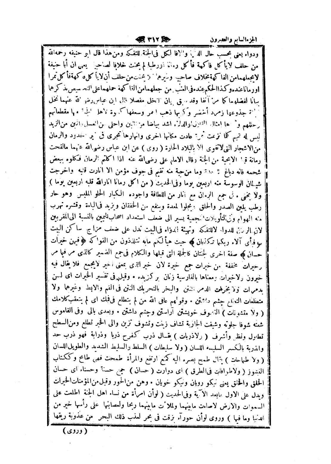 ودواء يعنى بحسب حال الدنيا وإلا فالكل في الجنة للتفكه ومن هذا قال ابو حنيفة رحمه الله من حلف لا يأكل فاكهة فأكل رمانا او رطبا لم يحنث خلافا لصاحبيه يعنى ان أبا حنيفة لا يجعلهما من الفاكهة بخلاف صاحبيه وغيرهما فلا يحنث من حلف أن لا يأكل فاكهة فأكل تمرا او رمانا عنده وكذا الحكم عنده في العنب من جعلهما من الفاكهة حملهما على التحصيص بذكرهما بيانا لفضلهما كما مر آنفا وقد سبق بيان النخل مفصلا قال ابن عباس رضى الله عنهما نخل الجنة جذوعها زمرد أخضر وكربها ذهب احمر وسعفها كسوة لاهل الجنة منها مقطعاتهم وحللهم وتمرها أمثال القلال او الدلاء أشد بياضا من اللبن واحلى من العسل وألين من الزبد ليس له عجم كلما نزعت ثمرة عادت مكانها اخرى وأنهارها تجرى في غير حدود والرمان من الأشجار التي لا تقوى الا بالبلاد الحارة (روى) عن ابن عباس رضى الله عنهما ما لقحت رمانة قبل إلا بحبة من الجنة وقال الامام على رضى الله عنه إذا أكلتم الرمان فكلوه ببعض شحمه فانه دباغ للمعدة وما من حبة منه تقيم في جوف مؤمن الا أنارت قلبه وأخرجت شيطان الوسوسة منه أربعين يوما وفي الحديث (من أكل رمانا أنار الله قلبه أربعين يوما) ولا يخفى ما فى جمع الرمان مع أنار من اللطافة وأجوده الكبار الحلو المليس وهو حار رطب يلين الصدر والحلق ويجلوا لمعدة وينفع من الخفقان ويزيد في الباءة وقشره تهرب منه الهوام وفي التأويلات النجمية يشير الى ضعف استعداد اصحاب اليمين بالنسبة الى المقربين لان الرمان للدواء لا للتفكه وتهيئة الدواء في البيت تدل على ضعف مزاج ساكن البيت فَبِأَيِّ آلاءِ رَبِّكُما تُكَذِّبانِ حيث هيأ لكم ما به تتلذذون من الفواكه فِيهِنَّ خَيْراتٌ حِسانٌ صفة اخرى لجنتان كالجملة التي قبلها والكلام في جمع الضمير كالذى مر فيما مر وخيرات مخففة من خيرات جمع خيرة لان خير الذي بمعنى أخير لا يجمع فلا يقال فيه خيرون ولا خيرات ومعناها بالفارسية زنان برگزيده وقيل في تفسير الخيرات اى لسن بدمرات ولا بخرات الدمر النتن والبخر بالتحريك النتن في الفم والإبط وغيرهما ولا متطلعات التطلع چشم داشتن وقولهم عافى الله من لم يتطلع في فمك اى لم يتعقب كلامك (ولا متشوفات) التصوف خويشتن آراستن و چشم داشتن ويعدى بالى وفي القاموس شفته شوفا جلوته وشيفت الجارية تشاف زينت وتشوف تزين والى الخير تطلع ومن السطح تطاول ونظر وأشرف (رلاذربات) يقال ذرب كفرح ذربا وذرابة فهو ذرب حد والذربة بالكسر السليطة اللسان (ولا سليطات) السلط والسليط الشديد والطويل اللسان (ولا طنماحات) يقال طمح بصره اليه كمنع ارتفع والمرأة طمحت فهى طامح وككتاب النشوز (ولا طوافات في الطرق) اى دوارت (حسان) جمع حسنة وحسناء اى حسان الخلق والخلق يعنى نيكو رويان ونيكو خويان وهن من الحور وقيل من المؤمنات الخيرات ويدل على الاول ما بعد الآية وفي الحديث (لو أن امرأة من نساء اهل الجنة اطلعت على السموات والأرض لاصاءت ما بينهما ولملأت ما بينهما ريحا ولعصابتها على رأسها خير من الدنيا وما فيها) وروى لو أن حوراء بزقت في بحر لعذب ذلك البحر من عذوبة ريقها