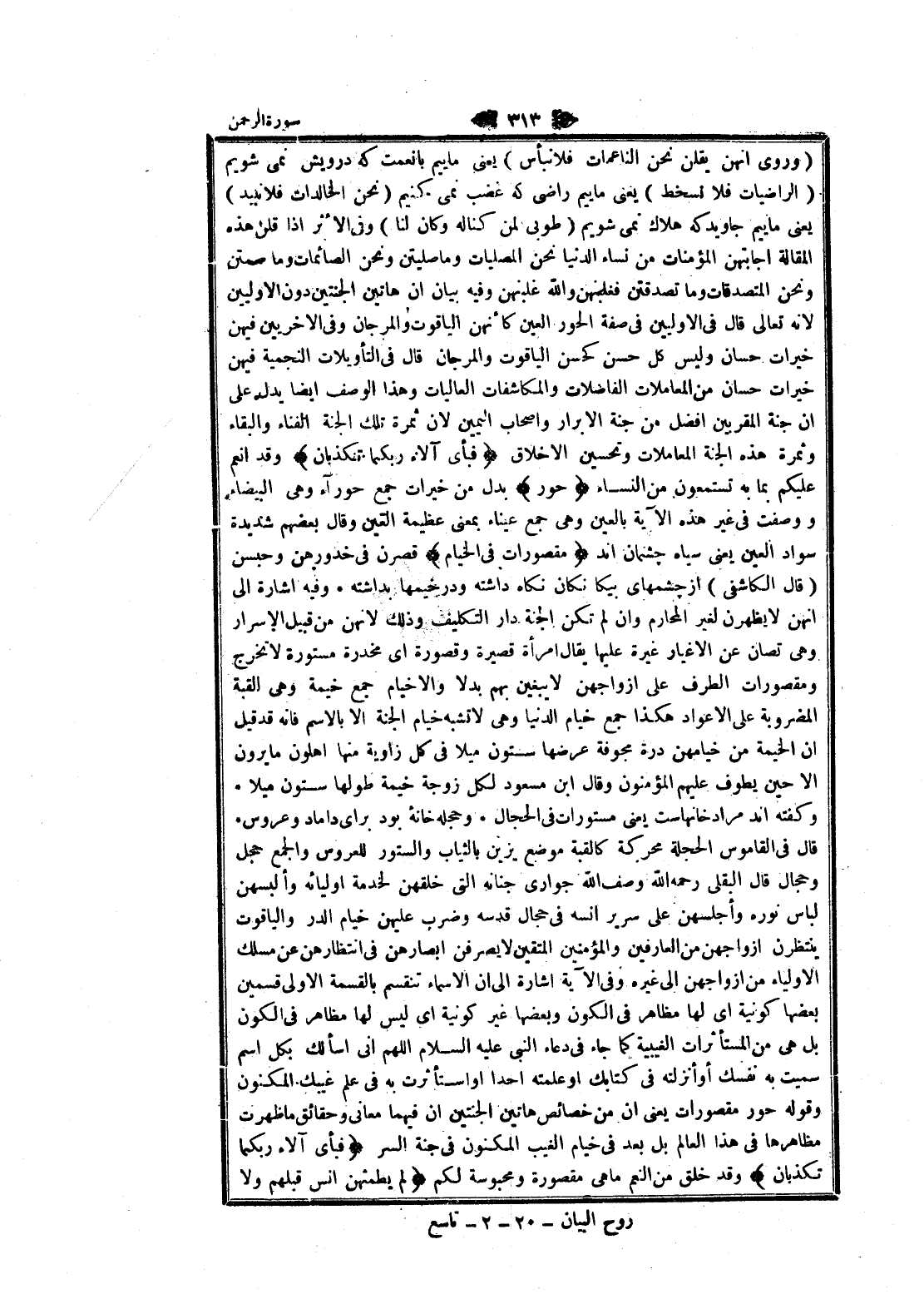(وروى انهن يقلن نحن الناعمات فلا نبأس) يعنى ماييم با نعمت كه درويش نمى شويم (الراضيات فلا تسخط) يعنى ماييم راضى كه غضب نمى كنيم (نحن الخالدات فلا نببد) يعنى ماييم جاويد كه هلاك نمى شويم (طوبى لمن كناله وكان لنا) وفي الأثر إذا قلن هذه المقالة اجابتهن المؤمنات من نساء الدنيا نحن المصليات وما صليتن ونحن الصائمات وما صمتن ونحن المتصدقات وما تصدقتن فغلبنهن والله غلبنهن وفيه بيان ان هاتين الجنتين دون الأوليين لانه تعالى قال في الأوليين في صفة الحور العين كأنهن الياقوت والمرجان وفي الأخريين فيهن خيرات حسان وليس كل حسن كحسن الياقوت والمرجان قال في التأويلات النجمية فيهن خيرات حسان من المعاملات الفاضلات والمكاشفات العاليات وهذا الوصف ايضا يدل على ان جنة المقربين أفضل من جنة الأبرار واصحاب اليمين لان ثمرة تلك الجنة الفناء والبقاء وثمرة هذه الجنة المعاملات وتحسين الأخلاق فَبِأَيِّ آلاءِ رَبِّكُما تُكَذِّبانِ وقد أنعم عليكم بما به تستمعون من النساء حُورٌ بدل من خيرات جمع حوراء وهى البيضاء ووصفت في غير هذه الآية بالعين وهى جمع عيناء بمعنى عظيمة العين وقال بعضهم شديدة سواد العين يعنى سياه چشمان اند مَقْصُوراتٌ فِي الْخِيامِ قصرن في خدورهن وحبسن (قال الكاشفى) از چشمهاى بيكانكان نكاه داشته ودر خيمها بداشته وفيه اشارة الى انهن لا يظهرن لغير المحارم وان لم تكن الجنة دار التكليف وذلك لانهن من قبيل الإسرار وهى تصان عن الأغيار غيرة عليها يقال امرأة قصيرة وقصورة اى مخدرة مستورة لا تخرج ومقصورات الطرف على أزواجهن لا يبغين بهم بدلا والاخيام جمع خيمة وهى القبة المضروبة على الأعواد هكذا جمع خيام الدنيا وهى لا تشبه خيام الجنة الا بالاسم فانه قد قيل ان الخيمة من خيامهن درة مجوفة عرضها ستون ميلا في كل زاوية منها اهلون ما يرون الا حين يطوف عليهم المؤمنون وقال ابن مسعود لكل زوجة خيمة طولها ستون ميلا وكفته اند مراد خانهاست يعنى مستورات في الحجال وحجله خانه بود براى داماد وعروس قال في القاموس الحجلة محركة كالقبة موضع يزين بالثياب والستور للعروس والجمع حجل وحجال قال البقلى رحمه الله وصف الله جوارى جنانه التي خلقهن لخدمة أوليائه وألبسهن لباس نوره وأجلسهن على سرير أنسه في حجال قدسه وضرب عليهن خيام الدر والياقوت ينتظرن أزواجهن من العارفين والمؤمنين المتقين لا يصرفن أبصارهن في انتظار هن عن مسلك الأولياء من أزواجهن الى غيره وفي الآية اشارة الى ان الأسماء تنقسم بالقسمة الاولى قسمين بعضها كونية اى لها مظاهر في الكون وبعضها غير كونية اى ليس لها مظاهر في الكون بل هى من المستأثرات الغيبية كما جاء في دعاء النبي عليه السلام اللهم انى اسألك بكل اسم سميت به نفسك أو أنزلته في كتابك او علمته أحدا او استأثرت به في علم غيبك المكنون وقوله حور مقصورات يعنى ان من خصائص هاتين الجنتين ان فيهما معانى وحقائق ما ظهرت مظاهرها في هذا العالم بل بعد في خيام الغيب المكنون في جنة السر فَبِأَيِّ آلاءِ رَبِّكُما تُكَذِّبانِ وقد خلق من النعم ما هى مقصورة ومحبوسة لكم لَمْ يَطْمِثْهُنَّ إِنْسٌ قَبْلَهُمْ وَلا جَانٌّ