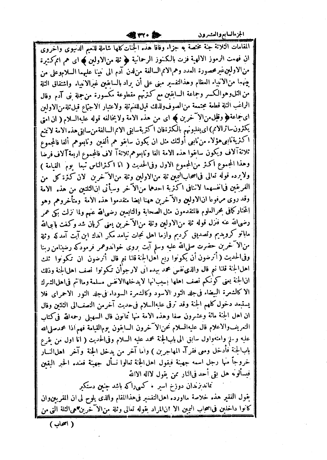 يقول الفقير هذه خلاصة ما أورده اهل التفسير في هذا المقام والذي يلوح لى ان المقربين وان كانوا داخلين في اصحاب اليمين الا ان المراد بقوله تعالى وثلة من الآخرين هى الثلة التي من