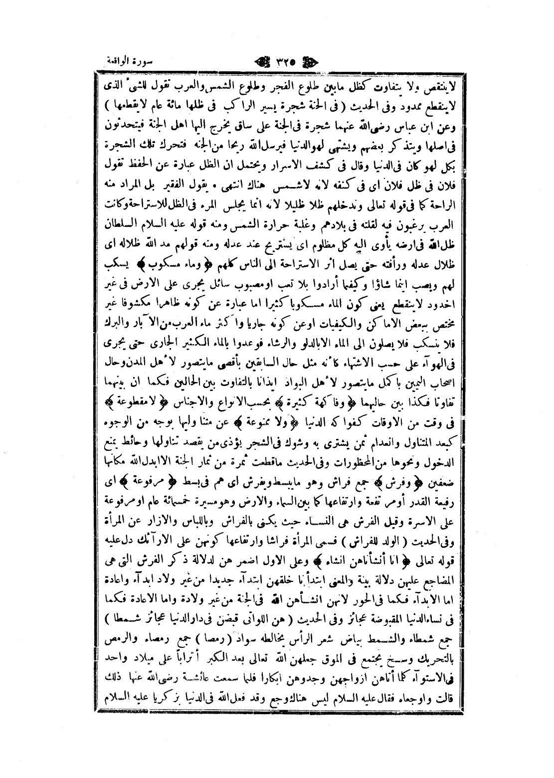 لا ينتقص ولا يتفاوت كظل ما بين طلوع الفجر وطلوع الشمس والعرب تقول للشيء الذي لا ينقطع ممدود وفي الحديث (فى الحنة شجرة يسير الراكب في ظلها مائة عام لا يقطعها) وعن ابن عباس رضى الله عنهما شجرة في الجنة على ساق يخرج إليها اهل الجنة فيتحدثون فى أصلها ويتذكر بعضهم ويشتهى لهو الدنيا فيرسل الله ريحا من الجنة فتحرك تلك الشجرة بكل لهو كان في الدنيا وقال في كشف الاسرار ويحتمل ان الظل عبارة عن الحفظ تقول فلان في ظل فلان اى في كنفه لانه لا شمس هناك انتهى يقول الفقير بل المراد منه الراحة كما في قوله تعالى وندخلهم ظلا ظليلا لانه انما يجلس المرء في الظل للاستراحة وكانت العرب يرغبون فيه لقلته في بلادهم وغلبة حرارة الشمس ومنه قوله عليه السلام السلطان ظل الله في ارضه يأوى اليه كل مظلوم اى يستريح عند عدله ومنه قولهم مد الله ظلاله اى ظلال عدله ورأفته حتى يصل اثر الاستراحة الى الناس كلهم وَماءٍ مَسْكُوبٍ يسكب لهم ويصب أينما شاؤا وكيفما أرادوا بلا تعب او مصبوب سائل يجرى على الأرض في غير أخدود لا ينقطع يعنى كون الماء مسكوبا كثيرا اما عبارة عن كونه ظاهرا مكشوفا غير مختص ببعض الأماكن والكيفيات او عن كونه جاريا واكثر ماء العرب من الآبار والبرك فلا ينسكب فلا يصلون الى الماء الا بالدلو والرشاء فوعدوا بالماء الكثير الجاري حتى يجرى فى الهولء على حسب الاشتهاء كأنه مثل حال السابقين بأقصى ما يتصور لأهل المدن وحال اصحاب اليمين بأكمل ما يتصور لأهل البواد إيذانا بالتفاوت بين الحالين فكما ان بينهما تفاوتا فكذا بين حاليهما وَفاكِهَةٍ كَثِيرَةٍ بحسب الأنواع والأجناس لا مَقْطُوعَةٍ فى وقت من الأوقات كفواكه الدنيا وَلا مَمْنُوعَةٍ عن متناوليها بوجه من الوجوه كبعد المتناول وانعدام ثمن يشترى به وشوك في الشجر يؤذى من يقصد تناولها وحائط يمنع الدخول ونحوها من المحظورات وفي الحديث ما قطعت ثمرة من ثمار الجنة الا أبدل الله مكانها ضعفين وَفُرُشٍ جمع فراش وهو ما يبسط ويفرش اى هم في بسط مَرْفُوعَةٍ اى رفيعة القدر أو مرتفعة وارتفاعها كما بين السماء والأرض وهو مسيرة خمسمائة عام او مرفوعة على الاسرة وقيل الفرش هى النساء حيث يكنى بالفراش وباللباس والإزار عن المرأة وفي الحديث (الولد للفراش) فسمى المرأة فراشا وارتفاعها كونهن على الأرائك دل عليه قوله تعالى إِنَّا أَنْشَأْناهُنَّ إِنْشاءً وعلى الاول أضمر هن لدلالة ذكر الفرش التي هى المضاجع عليهن دلالة بينة والمعنى ابتدأنا خلقهن ابتداء جديدا من غير ولاد ابداء وإعادة اما الإبداء فكما في الحور لانهن انشأهن الله في الجنة من غير ولادة واما الاعادة فكما فى نساء الدنيا المقبوضة عجائز وفي الحديث (هن اللواتى قبض في دار الدنيا عجائز شمطا) جمع شمطاء والشمط بياض شعر الرأس يخالطه سواد (رمصا) جمع رمصاء والرمص بالتحريك وسخ يجتمع في الموق جعلهن الله تعالى بعد الكبر أترابا على ميلاد واحد فى الاستواء كلما أتاهن أزواجهن وجدوهن أبكارا فلما سمعت عائشة رضى الله عنها ذلك قالت وأوجعاه فقال عليه السلام ليس هناك وجع وقد فعل الله في الدنيا بزكريا عليه السلام