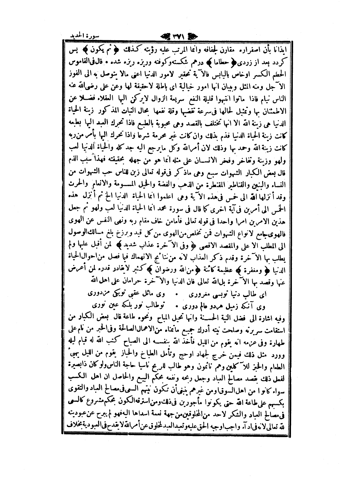 إيذانا بأن اصفراره مقارن لجفافه وانما المرتب عليه رؤيته كذلك ثُمَّ يَكُونُ پس كردد بعد از زردى حُطاماً درهم شكسته وكوفته وريزه ريزه شده قال في القاموس الحطم الكسر او خاص باليابس فالآية تحقير لامور الدنيا اعنى مالا يتوصل به الى الفوز الآجل ومنه المثل وببيان انها امور خيالية اى باطلة لا حقيقة لها وعن على رضى الله عنه الناس نيام فاذا ماتوا انتبهوا قليلة النفع سريعة الزوال لا يركن إليها العقلاء فضلا عن الاطمئنان بها وتمثيل لحالها في سرعة تقضيها وقلة نفعها بحال النبات المذكور زينة الحياة الدنيا هى زينة الله الا انها تختلف بالقصد وهى محبوبة بالطبع فاذا تحرك العبد إليها بطبعه كانت زينة الحياة الدنيا فذم بذلك وان كانت غير محرمة شرعا وإذا تحرك إليها بأمر من ربه كانت زينة الله وحمد بها وذلك لان أمر الله وكل ما يرجع اليه جد كله والحياة الدنيا لعب ولهو وزينة وتفاخر وفخر الإنسان على مثله انما هو من جهله بحقيقته فهذا سبب الذم قال بعض الكبار الشهوات سبع وهى ما ذكر في قوله تعالى زين للناس حب الشهوات من النساء والبنين والقناطير المقنطرة من الذهب والفضة والخيل المسومة والانعام والحرث وقد أنزلها الله الى خمس في هذه الآية وهى اعلموا انما الحياة الدنيا إلخ ثم أنزل هذه الخمس الى أمرين في آية اخرى كما قال في سورة محمد انما الحياة الدنيا لعب ولهو ثم جعل هذين الامرين امرا واحدا في قوله تعالى فأما من خاف مقام ربه ونهى النفس عن الهوى فالهوى جامع لانواع الشهوات فمن تخلص من الهوى من كل قيد وبرزخ بلغ مسالك الوصول الى المطلب الا على والمقصد الأقصى وَفِي الْآخِرَةِ عَذابٌ شَدِيدٌ لمن أقبل عليها ولم يطلب بها الآخرة وقدم ذكر العذاب لانه من نتائج الانهماك فيما فصل من احوال الحياة الدنيا وَمَغْفِرَةٌ عظيمة كائنة مِنَ اللَّهِ وَرِضْوانٌ كثير لا يقادر قدره لمن أعرض عنها وقصد بها الآخرة بل الله تعالى فان الدنيا والآخرة حرامان على اهل الله