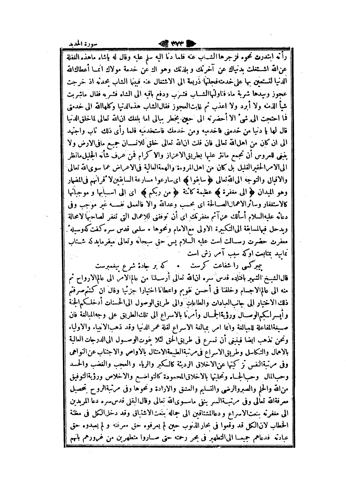 رأته ابتدرت نحوه فزجرها الشباب عنه فلما دنا اليه سلم عليه وقال له يا شاه ما هذه الغفلة عن الله اشتغلت بدنياك عن آخرتك وبلذتك وهواك عن خدمة مولاك انما أعطاك الله الدنيا لتستعين بها على خدمته فجلتها ذريعة الى الاشتغال عنه فبينما الشاب يحدثه إذ خرجت عجوز وبيدها شربة ماء فناولتها الشاب فشرب ودفع باقيه الى الشاه فشربه فقال ما شربت شيئا ألذ منه ولا أبرد ولا أعذب ثم غابت العجوز فقال الشاب هذه الدنيا ووكلها الله الى خدمتى فما احتجت الى شيء الا أحضرته الى حين يخطر ببالي اما بلغك ان الله تعالى لما خلق الدنيا قال لها يا دنيا من خدمنى فاخدميه ومن خدمك فاستخدميه فلما رأى ذلك تاب واجتهد الى ان كان من اهل الله تعالى فان قلت ان الله تعالى خلق للانسان جميع ما في الأرض ولا ينبغى للعروس أن تجمع ما نثر عليها بطريق الإعزاز والإكرام فمن عرف شأنه الجليل ما نظر الى الأمر الحقير القليل بل كان من اهل المروءة والهمة العالية في الاعراض عما سوى الله تعالى والإقبال والتوجه الى الله تعالى سابِقُوا اى سارعوا مسارعة السابقين لأقرانهم في المضمار وهو الميدان إِلى مَغْفِرَةٍ عظيمة كائنة مِنْ رَبِّكُمْ اى الى أسبابها وموجباتها كالاستغفار وسائر الأعمال الصالحة اى بحسب وعد الله والا فالعمل نفسه غير موجب وفي دعائه عليه السلام أسألك عزائم مغفرتك اى أن توفقنى للاعمال التي تغفر لصاحبها لا محالة ويدحل فيها المسابقة الى التكبيرة الاولى مع الامام ونحوها سلمى قدس سره كفت كه وسيله معفرت حضرت رسالت است عليه السلام پس حق سبحانه وتعالى ميفرمايد كه شتاب نماييد بمتابعت او كه سبب آمرزش است