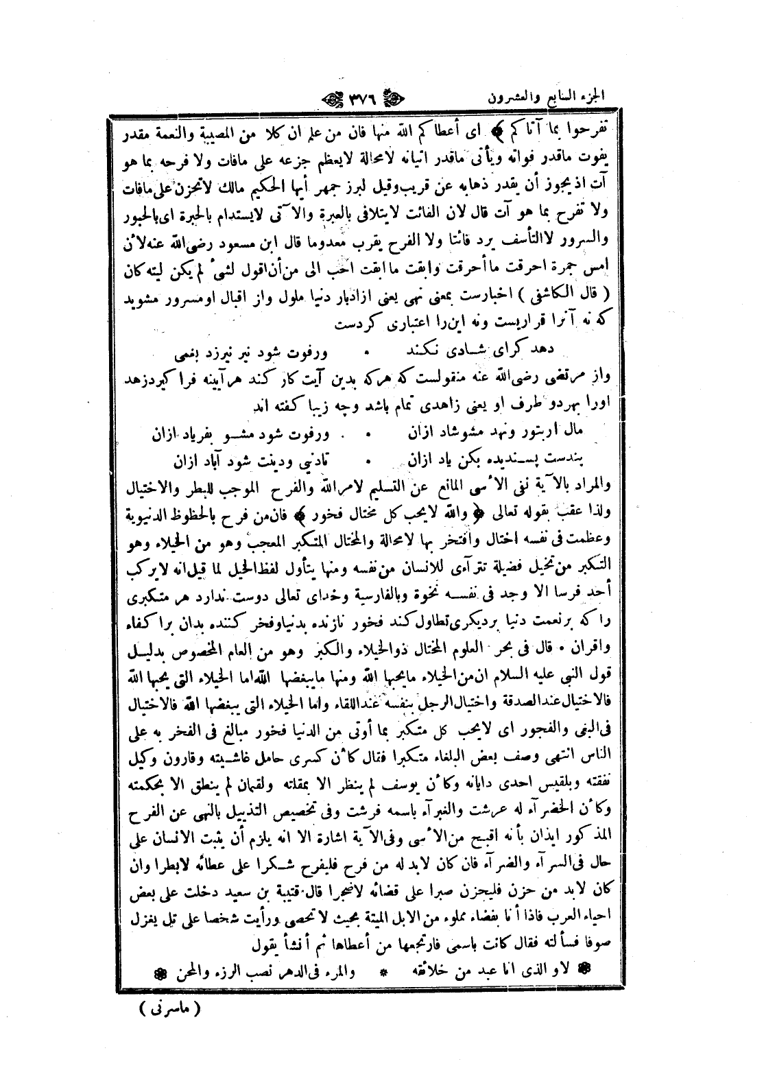 والمراد بالآية نفى الأسى المانع عن التسليم لامر الله والفرح الموجب للبطر والاختيال ولذا عقب بقوله تعالى وَاللَّهُ لا يُحِبُّ كُلَّ مُخْتالٍ فَخُورٍ فان من فرح بالحظوظ الدنيوية وعظمت في نفسه اختال وافتخر بها لا محالة والمختال المتكبر المعجب وهو من الخيلاء وهو التكبر من تخيل فضيلة تترآءى للانسان من نفسه ومنها يتأول لفظ الخيل لما قيل انه لا يركب أحد فرسا الا وجد في نفسه نخوة وبالفارسية وخداى تعالى دوست ندارد هر متكبرى را كه بر نعمت دنيا بر ديكرى تطاول كند فخور نازنده بدنيا وفخر كننده بدان بر اكفاء واقران قال في بحر العلوم المختال ذو الخيلاء والكبر وهو من العام المخصوص بدليل قول النبي عليه السلام ان من الخيلاء ما يحبها الله ومنها ما يبغضها الله اما الخيلاء التي يحبها الله فالاختيال عند الصدقة واختيال الرجل بنفسه عند اللقاء واما الخيلاء التي يبغضها الله فالاختيال فى البغي والفجور اى لا يحب كل متكبر بما أوتى من الدنيا فخور مبالغ في الفخر به على الناس انتهى وصف بعض البلغاء متكبرا فقال كأن كسرى حامل غاشيته وقارون وكيل نفقته وبلقيس احدى دايانه وكأن يوسف لم ينظر الا بمقلته ولقمان لم ينطق الا بحكمته وكأن الخضراء له عرشت والغبراء باسمه فرشت وفي تخصيص التذييل بالنهى عن الفرح المذكور إيذان بأنه أقبح من الأسى وفي الآية اشارة الا انه يلزم أن يثبت الإنسان على حال في السرآء والضراء فان كان لا بد له من فرح فليفرح شكرا على عطائه لا بطرا وان كان لا بد من حزن فليحزن صبرا على قضائه لا ضجرا قال قتيبة بن سعيد دخلت على بعض احياء العرب فاذا أنا بفضاء مملوء من الإبل الميتة بحيث لا تحصى ورأيت شخصا على تل يغزل صوفا فسألته فقال كانت باسمي فارتجعها من أعطاها ثم أنشأ يقول
