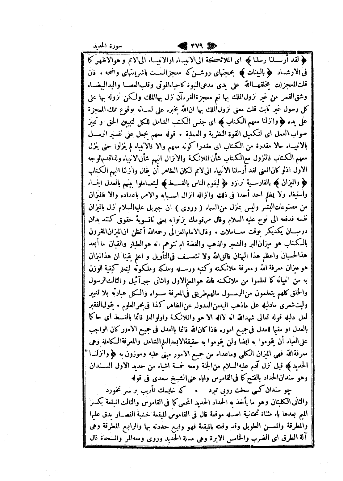 لَقَدْ أَرْسَلْنا رُسُلَنا اى الملائكة الى الأنبياء او الأنبياء الى الأمم وهو الأظهر كما فى الإرشاد بِالْبَيِّناتِ بحجتهاى روشن كه معجزاتست با شريعتهاى واضحه فان قلت المعجزات يخلقها الله على يدى مدعى النبوة كاحياء الموتى وقلب العصا واليد البيضاء وشق القمر من غير نزول الملك بها نعم معجزة القرآن نزل بها الملك ولكن نزوله بها على كل رسول غير ثابت قلت معنى نزول الملك بها ان الله يخبره على لسانه بوقوع تلك المعجزة على يده وَأَنْزَلْنا مَعَهُمُ الْكِتابَ اى جنس الكتب الشامل للكل لتبيين الحق وتمييز صواب العمل اى لتكميل القوة النظرية والعملية قوله معهم يجعل على تفسير الرسل بالأنبياء حالا مقدرة من الكتاب اى مقدرا كونه معهم والا فالانبياء لم ينزلوا حتى ينزل معهم الكتاب فالنزول مع الكتاب شأن الملائكة والانزال إليهم شأن الأنبياء ولذا قدم الوجه الاول إذ لو كان المعنى لقد أرسلنا الأنبياء الى الأمم لكان الظاهر أن يقال وأنزلنا إليهم الكتاب وَالْمِيزانَ بالفارسية ترازو لِيَقُومَ النَّاسُ بِالْقِسْطِ ليتعاملوا بينهم بالعدل إيفاء واستيفاء ولا يظلم أحد أحدا في ذلك وانزاله إنزال أسبابه والأمر باعداده والا فالميزان من مصنوعات البشر وليس بمنزل من السماء (وروى) ان جبريل عليه السلام نزل بالميزان نفسه فدفعه الى نوح عليه السلام وقال مرقومك يزنوا به يعنى تا تسويه حقوق كنند بدان در ميان يكديكر بوقت معاملات وقال الامام الغزالي رحمه الله أتظن ان الميزان المقرون بالكتاب هو ميزان البر والشعير والذهب والفضة أم تتوهم انه هو الطيار والقبان ما أبعد هذا الحسبان وأعظم هذا البهتان فاتق الله ولا تتعسف في التأويل واعلم يقينا ان هذا الميزان هو ميزان معرفة الله ومعرفة ملائكته وكتبه ورسله وملكه وملكوته ليتعلم كيفية الوزن به من أنبيائه كما تعلموا من ملائكته فالله هو المعلم الاول والثاني جبرائيل والثالث الرسول والخلق كلهم يتعلمون من الرسول ما لهم طريق في المعرفة سواه والكل عبارته بلا تغيير وليت شعرى ما دليله على ما ذهب اليه من العدول عن الظاهر كذا في بحر العلوم يقول الفقير لعل دليله قوله تعالى شهد الله انه لا اله الا هو والملائكة وأولو العلم قائما بالقسط اى حاكما بالعدل او مقيما للعدل في جميع أموره فاذا كان الله قائما بالعدل في جميع الأمور كان الواجب على العباد أن يقوموا به ايضا ولن يقوموا به حقيقة الا بعد العلم الشامل والمعرفة الكاملة وهى معرفة الله فهى الميزان الكلى وما عداه من جميع الأمور مبنى عليه وموزون به وَأَنْزَلْنَا الْحَدِيدَ قيل نزل آدم عليه السلام من الجنة ومعه خمسة أشياء من حديد الاول السندان وهو سندان الحداد بالفتح كما في القاموس وإياه عنى الشيخ سعدى في قوله