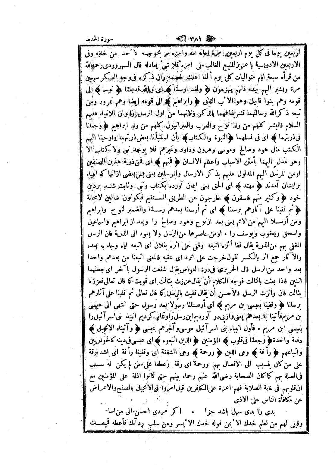 أربعين يوما في كل يوم أربعين مرة أعانه الله وأعزه فلم يحوجه لأحد من خلقه وفي الأربعين الادريسية يا عزيز المنيع الغالب ملى امره فلا شيء يعادله قال السهروردي رحمه الله من قرأه سبعة ايام متواليات كل يوم ألفا أهلك خصمه وان ذكره في وجه العسكر سبعين مرة ويشير إليهم بيده فانهم ينهزمون وَلَقَدْ أَرْسَلْنا اى وبالله قد بعثنا نُوحاً الى قومه وهم بنوا قابيل وهو الأب الثاني وَإِبْراهِيمَ الى قومه ايضا وهم نمرود ومن تبعه ذكر الله رسالتهما تشريفا لهما بالذكر ولانهما من أول الرسل وأبوان للانبياء عليهم السلام فالبشر كلهم من ولد نوح والعرب والعبرانيون كلهم من ولد ابراهيم وَجَعَلْنا فِي ذُرِّيَّتِهِمَا اى في نسلهما النُّبُوَّةَ وَالْكِتابَ بأن استنبأنا بعض ذريتهما وأوحينا إليهم الكتب مثل هود وصالح وموسى وهرون وداود وغيرهم فلا يوجد نبى ولا كتاب الا وهو مدل إليهما بأمتن الأسباب وأعظم الإنسان فَمِنْهُمْ اى فمن ذرية هذين الصنفين او من المرسل إليهم المدلول عليهم بذكر الإرسال والمرسلين يعنى پس بعضى از انها كه أنبياء بر ايشان آمدند مُهْتَدٍ اى الحق يعنى ايمان آورده بكتاب ونبى وثابت شد بر دين خود وَكَثِيرٌ مِنْهُمْ فاسِقُونَ خارجون عن الطريق المستقيم فيكونون ضالين لا محالة ثُمَّ قَفَّيْنا عَلى آثارِهِمْ بِرُسُلِنا اى ثم أرسلنا بعدهم رسلنا والضمير لنوح وابراهيم ومن أرسلا إليهم من الأمم يعنى بعد از نوح وهود وصالح را وبعد از ابراهيم وإسماعيل واسحق ويعقوب ويوسف را او من عاصرهما من الرسل ولا يعود الى الذرية فان الرسل المقفى بهم من الذرية يقال قفا أثره اتبعه وقفى على اثره بفلان اى اتبعه إياه وجاء به بعده والآثار جمع اثر بالكسر تقول خرجت على اثره اى عقبه فالمعنى اتبعنا من بعدهم واحدا بعد واحد من الرسل قال الحريري في درة الغواص يقال شفعت الرسول بآخر اى جعلتهما اثنين فاذا بعثت بالثالث فوجه الكلام أن يقال عززت بثالث اى قويت كما قال تعالى فعززنا بثالث فان واترت الرسل فالاحسن أن يقال قفيت بالرسل كما قال تعالى ثم قفينا على آثارهم برسلنا وَقَفَّيْنا بِعِيسَى ابْنِ مَرْيَمَ اى أرسلنا رسولا بعد رسول حتى انتهى الى عيسى بن مريم فأتينا به بعدهم يعنى واز پى در آورديم اين رسل را وتمام كرديم أنبياء بنى إسرائيل را بعيسى ابن مريم فأول أنبياء بنى إسرائيل موسى وآخرهم عيسى وَآتَيْناهُ الْإِنْجِيلَ دفعة واحدة وَجَعَلْنا فِي قُلُوبِ المؤمنين الَّذِينَ اتَّبَعُوهُ اى عيسى في دينه كالحواريين واتباعهم رَأْفَةً وهى اللين وَرَحْمَةً وهى الشفقة اى وقفينا رأفة اى أشد رقة على من كان يتسبب الى الاتصال بهم ورحمة اى رقة وعطفا على من لم يكن له سبب فى الصلة بهم كما كان الصحابة رضى الله عنهم رحماء بينهم حتى كانوا اذلة على المؤمنين مع ان قلوبهم في غاية الصلابة فهم اعزة على الكافرين قيل أمروا في الإنجيل بالصفح والاعراض عن مكافأة الناس على الأذى