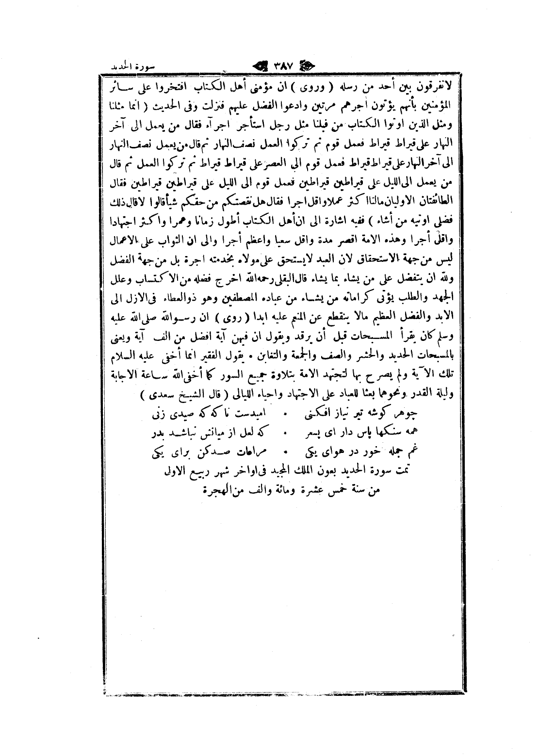 تمت سورة الحديد بعون الملك المجيد في اواخر شهر ربيع الاول من سنة خمس عشرة ومائة والف من الهجرة
