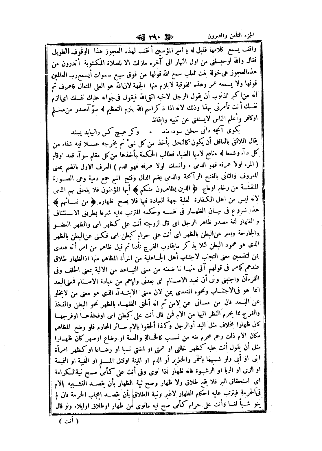 يقال اللائق بالعاقل أن يكون كالنحل يأخذ من كل شيء ثم يخرجه عسلا فيه شفاء من كل داء وشمعا له منافع لا سيما الضياء فطالب الحكمة يأخذها من كل مقام سوآء قعد أو قام (المرء لولا عرفه فهو الدمى والمسك لولا عرفه فهو الدم) العرف الاول بالضم بمعنى المعروف والثاني بالفتح الرائحة والدمى بضم الدال وفتح الميم جمع دمية وهى الصورة المنقشة من رخام أو عاج الَّذِينَ يُظاهِرُونَ مِنْكُمْ أيها المؤمنون فلا يلحق بهم الذمي لانه ليس من اهل الكفارة لغلبة جهة العبادة فيها فلا يصح ظهاره مِنْ نِسائِهِمْ هذا شروع في بيان الظهار في نفسه وحكمه المترتب عليه شرعا بطريق الاستئناف والظهار لغة مصدر ظاهر الرجل اى قال لزوجته أنت على كظهر أمي والظهر العضو والجارحة ويعبر عن البطن بالظهر اى أنت على حرام كبطن أمي فكنى عن البطن بالظهر الذي هو عمود البطن لئلا يذكر ما يقارب الفرج تأدبا ثم قيل ظاهر من امرأته فعدى بمن لتضمين معنى التجنب لاجتناب أهل الجاهلية من المرأة المظاهر منها إذ الظهار طلاق عندهم كما مر في قولهم آلى منها لما ضمنه من معنى التباعد من الالية بمعنى الحلف وفي القرآن واجنبنى وبنى أن نعبد الأصنام اى بعدنى وإياهم من عبادة الأصنام فمعنى البعد انما هو في الاجتناب ونحوه المتعدى بمن لان معنى الابتداء الذي هو معنى من لا يخلو عن البعد فان من معانى عن لامن ثم انه ألحق الفقهاء بالظهر نحو البطن والفخذ والفرج مما يحرم النظر إليها من الام فمن قال أنت على كبطن أمي او فخذها او فرجها كان ظهارا بخلاف مثل اليد أو الرجل وكذا ألحقوا بالأم سائر المحارم فلو وضع المظاهر مكان الام ذات رحم محرم منه من نسب كالخالة والعمة او رضاع او صهر كان ظهارا مثل أن يقول أنت عليه كظهر خالتى او عمتى او أختي نسبا او رضاعا او كظهر امرأة ابني او أبى ولو شبهها بالخمر والخنزير أو الدم او الميتة او قتل المسلم او الغيبة او النميمة او الزنى او الربا او الرشوة فانه ظهار إذا نوى وفى أنت على كأمى صح نية الكرامة اى استحقاق البر فلا يقع طلاق ولا ظهار وصح نية الظهار بأن يقصد التشبيه بالأم فى الحرمة فيترتب عليه احكام الظهار لا غير ونية الطلاق بأن يقصد إيجاب الحرمة فان لم ينو شيأ لغا وأنث على حرام كأمى صح فيه ما نوى من ظهار او طلاق أو إيلاء ولو قال
