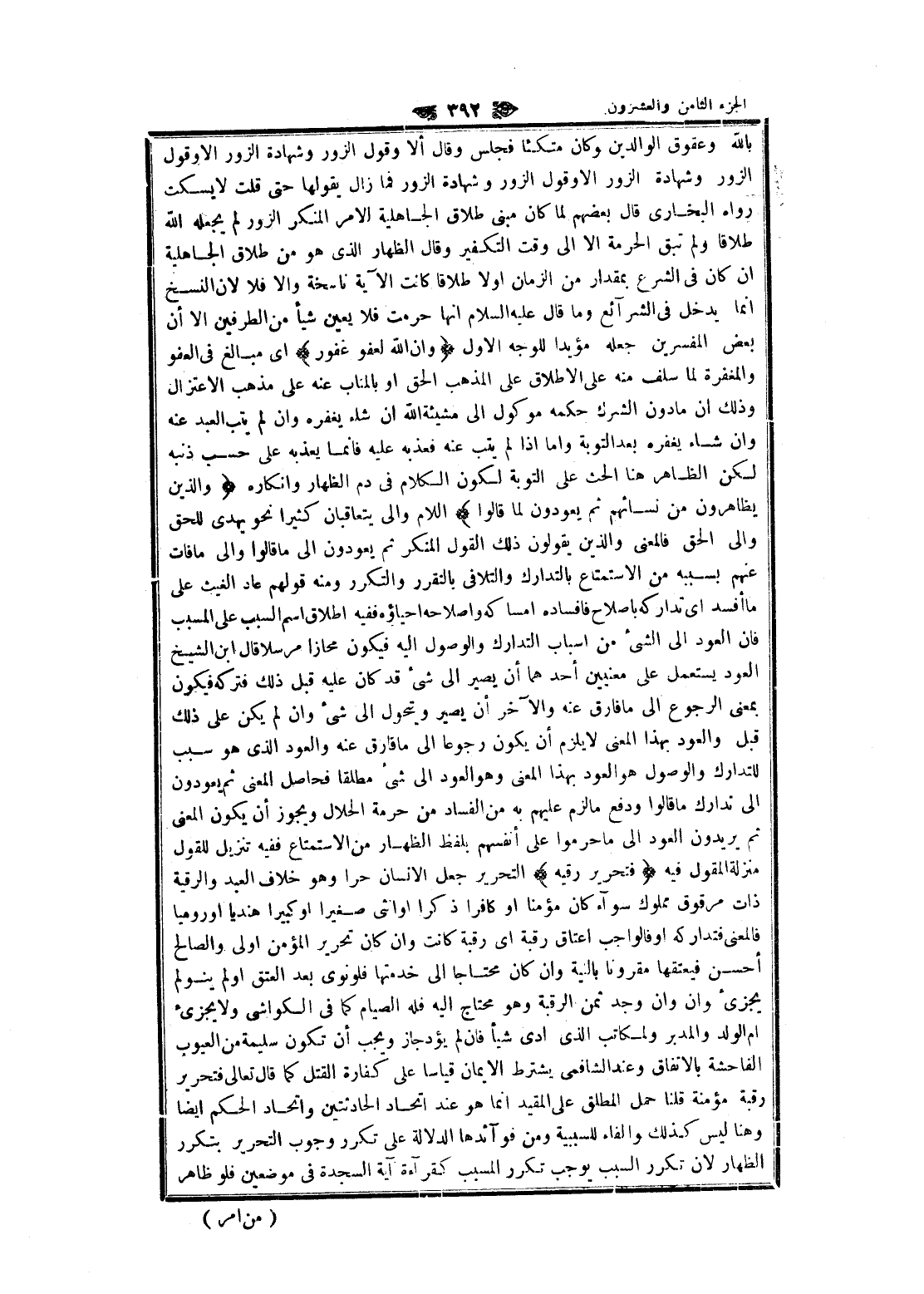 بالله وعقوق الوالدين وكان متكئا فجلس وقال ألا وقول الزور وشهادة الزور الا وقول الزور وشهادة الزور الا وقول الزور وشهادة الزور فما زال يقولها حتى قلت لا يسكت رواه البخاري قال بعضهم لما كان مبنى طلاق الجاهلية الأمر المنكر الزور لم يجعله الله طلاقا ولم تبق الحرمة الا الى وقت التكفير وقال الظهار الذي هو من طلاق الجاهلية ان كان في الشرع بمقدار من الزمان اولا طلاقا كانت الآية ناسخة والا فلا لان النسخ انما يدخل في الشرائع وما قال عليه السلام انها حرمت فلا يعين شيأ من الطرفين الا أن بعض المفسرين جعله مؤيدا للوجه الاول وَإِنَّ اللَّهَ لَعَفُوٌّ غَفُورٌ اى مبالغ في العفو والمغفرة لما سلف منه على الإطلاق على المذهب الحق او بالمناب عنه على مذهب الاعتزال وذلك ان ما دون الشرك حكمه موكول الى مشيئة الله ان شاء يغفره وان لم يتب العبد عنه وان شاء يغفره بعد التوبة واما إذا لم يتب عنه فعذبه عليه فانما يعذبه على حسب ذنبه لكن الظاهر هنا الحث على التوبة لكون الكلام في دم الظاهر وإنكاره وَالَّذِينَ يُظاهِرُونَ مِنْ نِسائِهِمْ ثُمَّ يَعُودُونَ لِما قالُوا اللام والى يتعاقبان كثيرا نحو يهدى للحق والى الحق فالمعنى والذين يقولون ذلك القول المنكر ثم يعودون الى ما قالوا والى ما فات عنهم بسببه من الاستمتاع بالتدارك والتلافي بالتقرر والتكرر ومنه قولهم عاد الغيث على ما أفسد اى تداركه بإصلاح فافساده إمساكه وإصلاحه إحياؤه ففيه اطلاق اسم السبب على المسبب فان العود الى الشيء من اسباب التدارك والوصول اليه فيكون محازا مرسلا قال ابن الشيخ العود يستعمل على معنيين أحدهما أن يصير الى شيء قد كان عليه قبل ذلك فتركه فيكون بمعنى الرجوع الى ما فارق عنه والآخر أن يصير ويتحول الى شيء وان لم يكن على ذلك قبل والعود بهذا المعنى لا يلزم أن يكون رجوعا الى ما قارق عنه والعود الذي هو سبب للتدارك والوصول هو العود بهذا المعنى وهو العود الى شيء مطلقا فحاصل المعنى ثم يعودون الى تدارك ما قالوا ودفع ما لزم عليهم به من الفساد من حرمة الحلال ويجوز أن يكون المعنى ثم يريدون العود الى ما حرموا على أنفسهم بلفظ الظهار من الاستمتاع ففيه تنزيل للقول منزلة المقول فيه فَتَحْرِيرُ رَقَبَةٍ التحرير جعل الإنسان حرا وهو خلاف العبد والرقية ذات مرقوق مملوك سوآء كان مؤمنا او كافرا ذكرا او أنثى صغيرا او كبيرا هنديا او روميا فالمعنى فتداركه او فالواجب اعتاق رقبة اى رقبة كانت وان كان تحرير المؤمن اولى والصالح أحسن فيعتقها مقرونا بالنية وان كان محتاجا الى خدمتها فلونوى بعد العتق او لم ينو لم يجزئ وان وجد ثمن الرقبة وهو محتاج اليه فله الصيام كما في الكواشي ولا يجزئ أم الولد والمدبر ولمكاتب الذي ادى شيأ فان لم يؤدجاز ويجب أن تكون سليمة من العيوب الفاحشة بالاتفاق وعند الشافعي يشترط الايمان قياسا على كفارة القتل كما قال تعالى فتحرير رقبة مؤمنة قلنا حمل المطلق على المقيد انما هو عند اتحاد الحادثتين واتحاد الحكم ايضا وهنا ليس كذلك والفاء للسببية ومن فوائدها الدلالة على تكرر وجوب التحرير بتكرر الظهار لان تكرر السبب يوجب تكرر المسبب كقرآءة آية السجدة في موضعين فلو ظاهر
