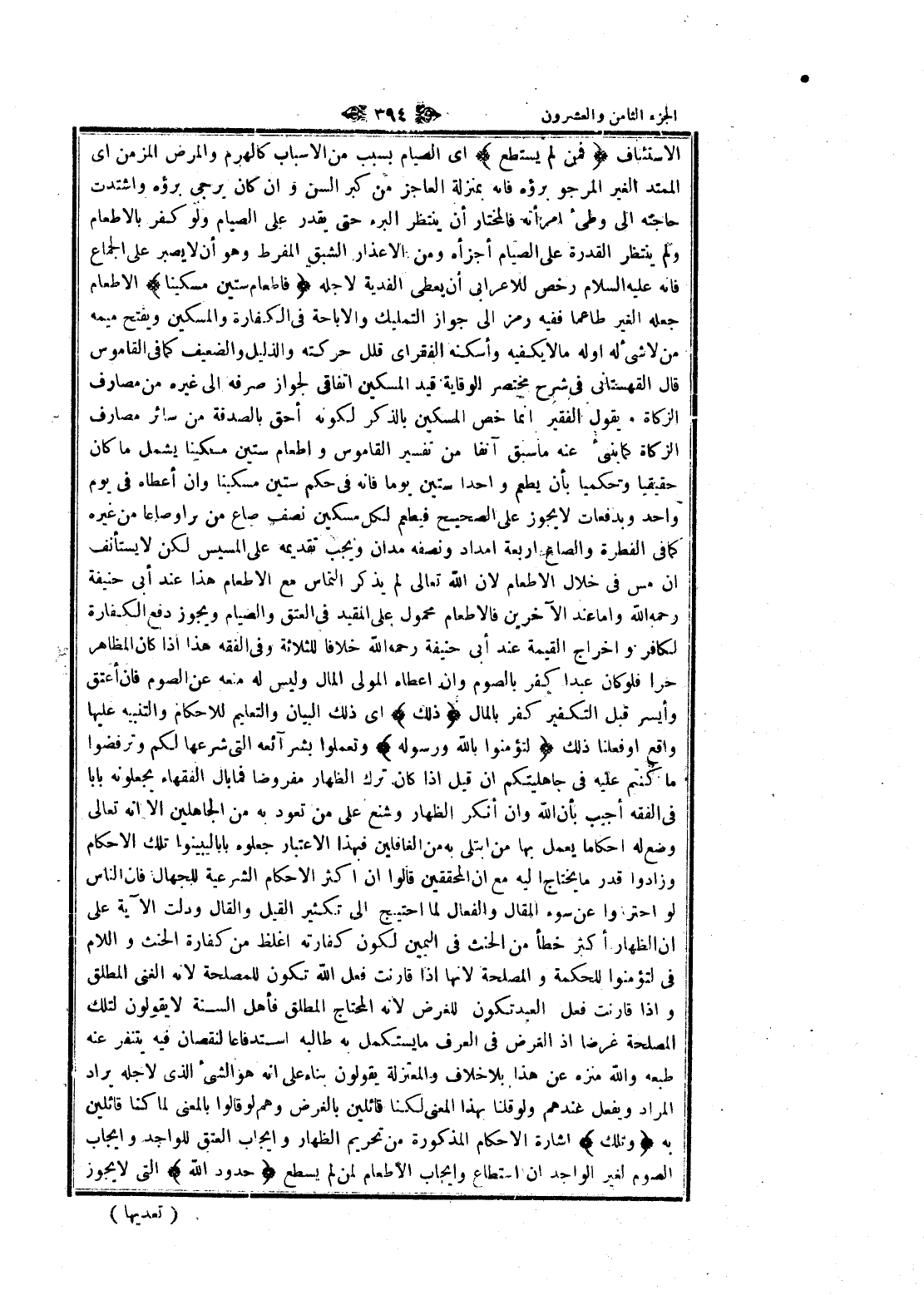 فانه في حكم ستين مسكينا وان أعطاه في يوم واحد وبدفعات لا يجوز على الصحيح فيطعم لكل مسكين نصف صاع من بر او صاعا من غيره كما في الفطرة والصاع اربعة امداد ونصفه مدان ويجب تقديمه على المسيس لكن لا يستأنف ان مس في خلال الإطعام لان الله تعالى لم يذكر التماس مع الإطعام هذا عند أبى حنيفة رحمه الله واما عند الآخرين فالاطعام محمول على المقيد في العتق والصيام ويجوز دفع الكفارة لكافر وإخراج القيمة عند أبى حنيفة رحمه الله خلافا للثلاثة وفي الفقه هذا إذا كان المظاهر حرا فلو كان عبدا كفر بالصوم وان أعطاه المولى المال وليس له منعه عن الصوم فان أعتق وأيسر قبل التكفير كفر بالمال ذلِكَ اى ذلك البيان والتعليم للاحكام والتنبيه عليها واقع او فعلنا ذلك لِتُؤْمِنُوا بِاللَّهِ وَرَسُولِهِ وتعملوا بشرائعه التي شرعها لكم وترفضوا ما كنتم عليه في جاهليتكم ان قيل إذا كان ترك الظهار مفروضا فما بال الفقهاء يجعلونه بابا فى الفقه أجيب بأن الله وان أنكر الظهار وشنع على من تعود به من الجاهلين الا انه تعالى وضع له احكاما يعمل بها من ابتلى به من الغافلين فبهذا الاعتبار جعلوه بابا ليبينوا تلك الاحكام وزادوا قدر ما يختاج اليه مع ان المحققين قالوا ان اكثر الاحكام الشرعية للجهال فان الناس لو احترزوا عن سوء المقال والفعال لما احتيج الى تكثير القيل والقال ودلت الآية على ان الظهار أكثر خطأ من الحنث في اليمين لكون كفارته اغلظ من كفارة الحنث واللام فى لتؤمنوا للحكمة والمصلحة لانها إذا قارنت فعل الله تكون للمصلحة لانه الغنى المطلق وإذا قارنت فعل العبد تكون للغرض لانه المحتاج المطلق فأهل السنة لا يقولون لتلك المصلحة غرضا إذ الغرض في العرف ما يستكمل به طالبه استدفاعا لنقصان فيه يتنفر عنه طبعه والله منزه عن هذا بلا خلاف والمعتزلة يقولون بناء على انه هو الشيء الذي لاجله يراد المراد ويفعل عندهم ولو قلنا بهذا المعنى لكنا قائلين بالغرض وهم لو قالوا بالمعنى لما كنا قائلين به وَتِلْكَ اشارة الاحكام المذكورة من تحريم الظهار وإيجاب العتق للواجد وإيجاب الصوم لغير الواجد ان استطاع وإيجاب الإطعام لمن لم يسطع حُدُودُ اللَّهِ التي لا يجوز