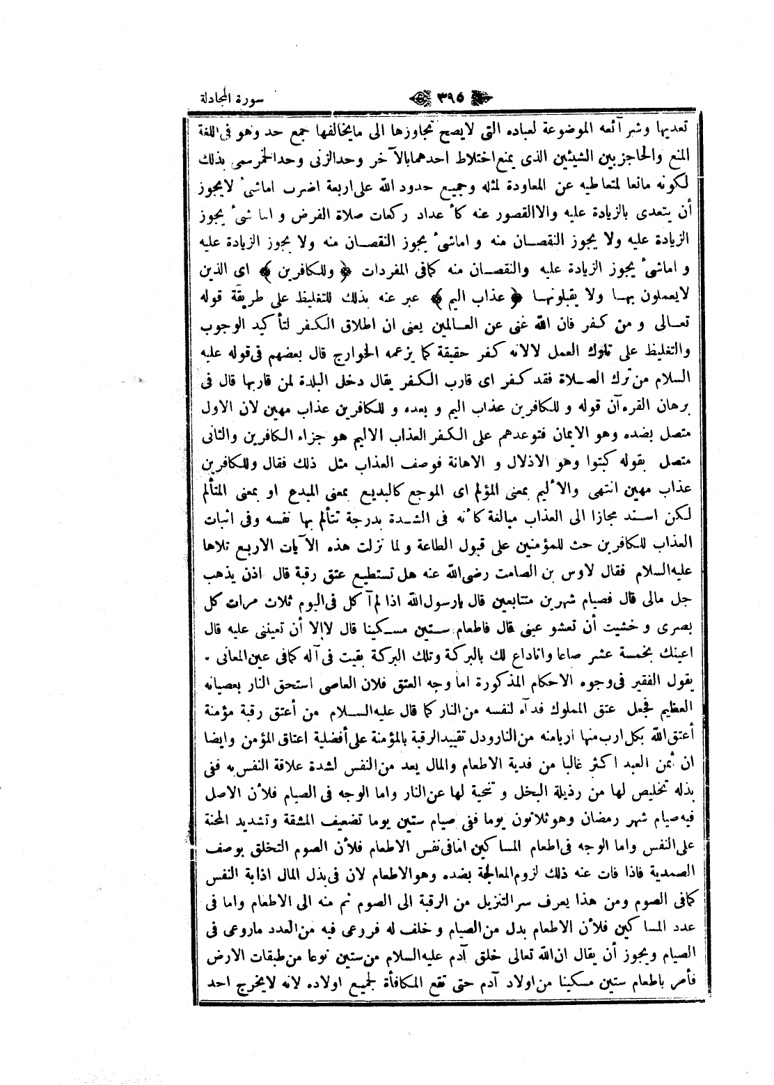 تعديها وشرائعه الموضوعة لعباده التي لا يصح تجاوزها الى ما يخالفها جمع حد وهو في اللغة المنع والحاجز بين الشيئين الذي يمنع اختلاط أحدهما بالآخر وحد الزنى وحد الخمر سمى بذلك لكونه مانعا لمتعاطيه عن المعاودة لمثله وجميع حدود الله على اربعة اضرب اما شيء لا يجوز أن يتعدى بالزيادة عليه والا القصور عنه كأعداد ركعات صلاة الفرض واما شيء يجوز الزيادة عليه ولا يجوز النقصان منه واما شيء يجوز النقصان منه ولا يجوز الزيادة عليه واما شيء يجوز الزيادة عليه والنقصان منه كما في المفردات وَلِلْكافِرِينَ اى الذين لا يعملون بها ولا يقبلونها عَذابٌ أَلِيمٌ عبر عنه بذلك للتغليظ على طريقة قوله تعالى ومن كفر فان الله غنى عن العالمين يعنى ان اطلاق الكفر لتأكيد الوجوب والتغليظ على تارك العمل لا لانه كفر حقيقة كما يزعمه الخوارج قال بعضهم في قوله عليه السلام من ترك الصلاة فقد كفر اى قارب الكفر يقال دخل البلدة لمن قاربها قال في برهان القرآن قوله وللكافرين عذاب اليم وبعده وللكافرين عذاب مهين لان الاول متصل بضده وهو الايمان فتوعدهم على الكفر العذاب الأليم هو جزاء الكافرين والثاني متصل بقوله كبتوا وهو الاذلال والاهانة فوصف العذاب مثل ذلك فقال وللكافرين عذاب مهين انتهى والأليم بمعنى المؤلم اى الموجع كالبديع بمعنى المبدع او بمعنى المتألم لكن أسند مجازا الى العذاب مبالغة كأنه في الشدة بدرجة تتألم بها نفسه وفي اثبات العذاب للكافرين حث للمؤمنين على قبول الطاعة ولما نزلت هذه الآيات الأربع تلاها عليه السلام فقال لاوس بن الصامت رضى الله عنه هل تستطيع عتق رقبة قال اذن يذهب جل مالى قال فصيام شهرين متتابعين قال يا رسول الله إذا لم آكل في اليوم ثلاث مرات كل بصرى وخشيت أن تعشو عينى قال فاطعام ستين مسكينا قال لا الا أن تعيننى عليه قال أعينك بخمسة عشر صاعا وانا داع لك بالبركة وتلك البركة بقيت في آله كما في عين المعاني يقول الفقير في وجوه