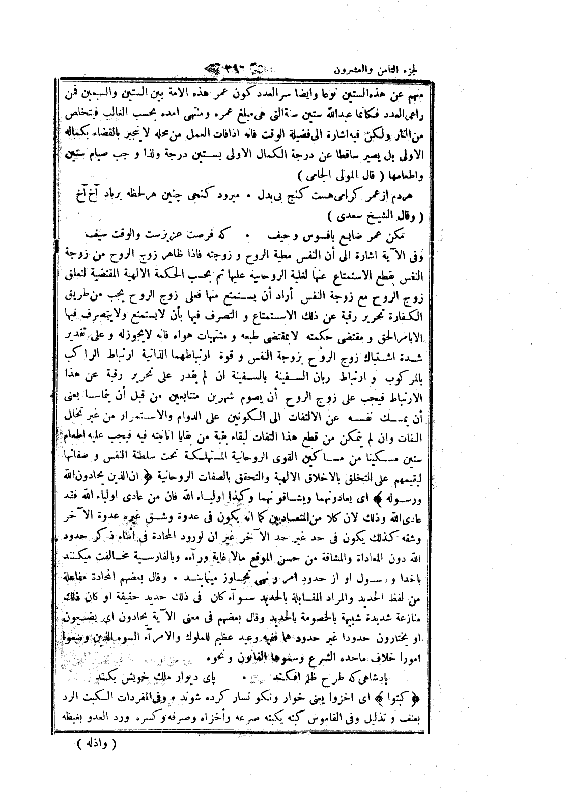 وفي الآية اشارة الى أن النفس مطية الروح وزوجته فاذا ظاهر زوج الروح من زوجة النفس بقطع الاستمتاع عنها لغلبة الروحانية عليها ثم بحسب الحكمة الالهية المقتضية لتعلق زوج الروح مع زوجة النفس أراد أن يستمتع منها فعلى زوج الروح يجب من طريق الكفارة تحرير رقبة عن ذلك الاستمتاع والتصرف فيها بأن لا يستمتع ولا يتصرف فيها الا بامر الحق ومقتضى حكمته لا بمقتضى طبعه ومشتهيات هواه فانه لا يجوز له وعلى تقدير شدة اشتباك زوج الروح بزوجة النفس وقوة ارتباطهما الذاتية ارتباط الراكب بالمركوب وارتباط ربان السفينة بالسفينة ان لم يقدر على تحرير رقبة عن هذا الارتباط فيجب على زوج الروح أن يصوم شهرين متتابعين من قبل أن يتماسا يعنى أن يمسك نفسه عن الالتفات الى الكونين على الدوام والاستمرار من غير تخلل التفات وان لم يتمكن من قطع هذا التفات لبقاء بقية من بقايا انانيته فيه فيجب عليه اطعام ستين مسكينا من مساكين القوى الروحانية المستهلكة تحت سلطنة النفس وصفاتها ليقيمهم على التخلق بالأخلاق الالهية والتحقق بالصفات الروحانية إِنَّ الَّذِينَ يُحَادُّونَ اللَّهَ وَرَسُولَهُ اى يعادونهما ويشاقونهما وكذا اولياء الله فان من عادى اولياء الله فقد عادى الله وذلك لان كلا من المتعاديين كما انه يكون في عدوة وشق غيره عدوة الآخر وشقه كذلك يكون في حد غير حد الآخر غير ان لورود المحادة في أثناء ذكر حدود الله دون المعاداة والمشاقة من حسن الموقع مالا غاية وراءه وبالفارسية مخالفت ميكنند با خدا ورسول او از حدود امر ونهى تجاوز مينمايند وقال بعضهم المحادة مفاعلة من لفظ الحديد والمراد المقابلة بالحديد سوآء كان في ذلك حديد حقيقة او كان ذلك منازعة شديدة شبيهة بالخصومة بالحديد وقال بعضهم في معنى الآية يحادون اى يضعون او يختارون حدودا غير حدودهما ففيه وعيد عظيم للملوك والأمراء السوء الذين وضعوا أمورا خلاف ما حده الشرع وسموها القانون ونحوه